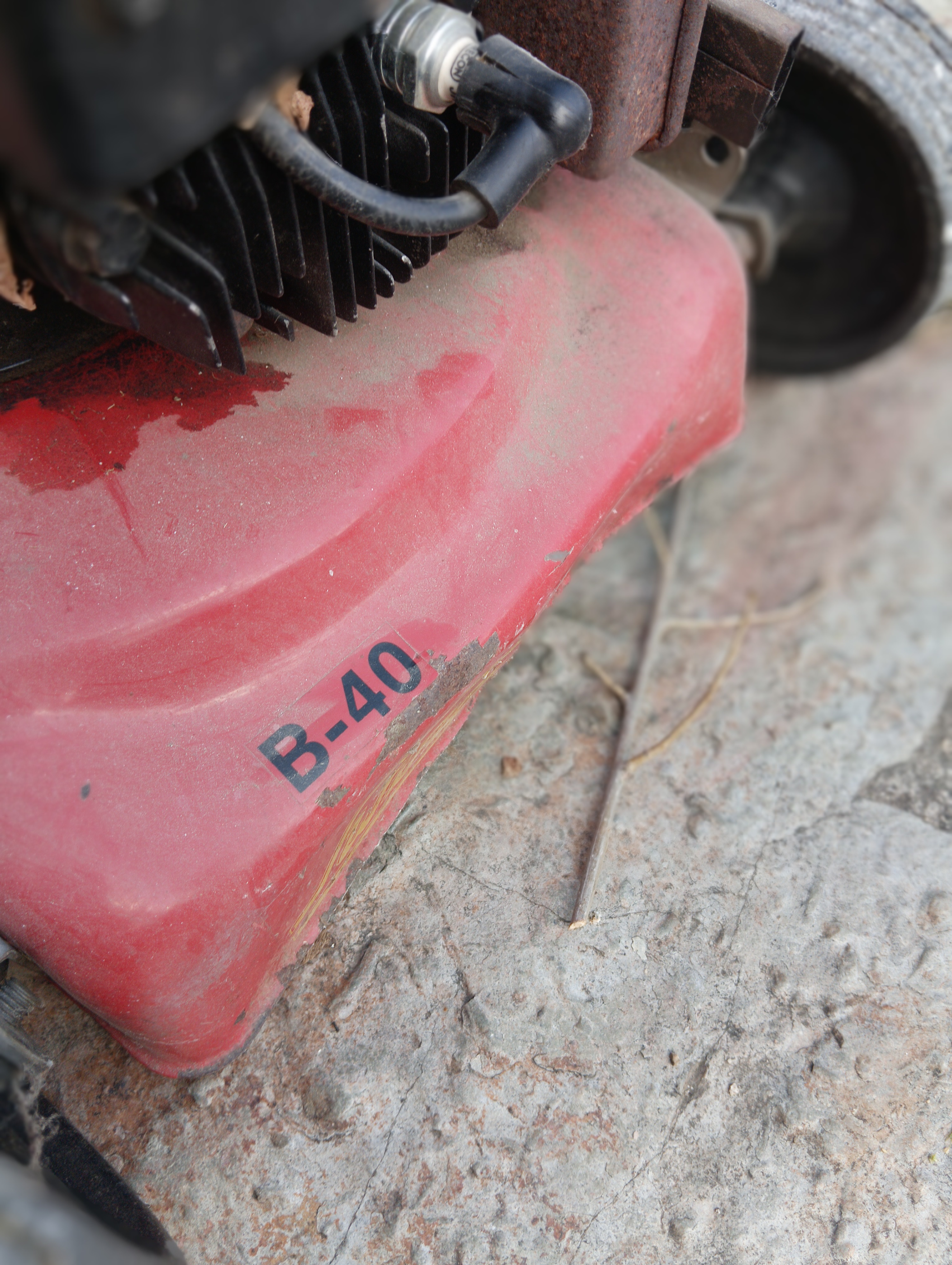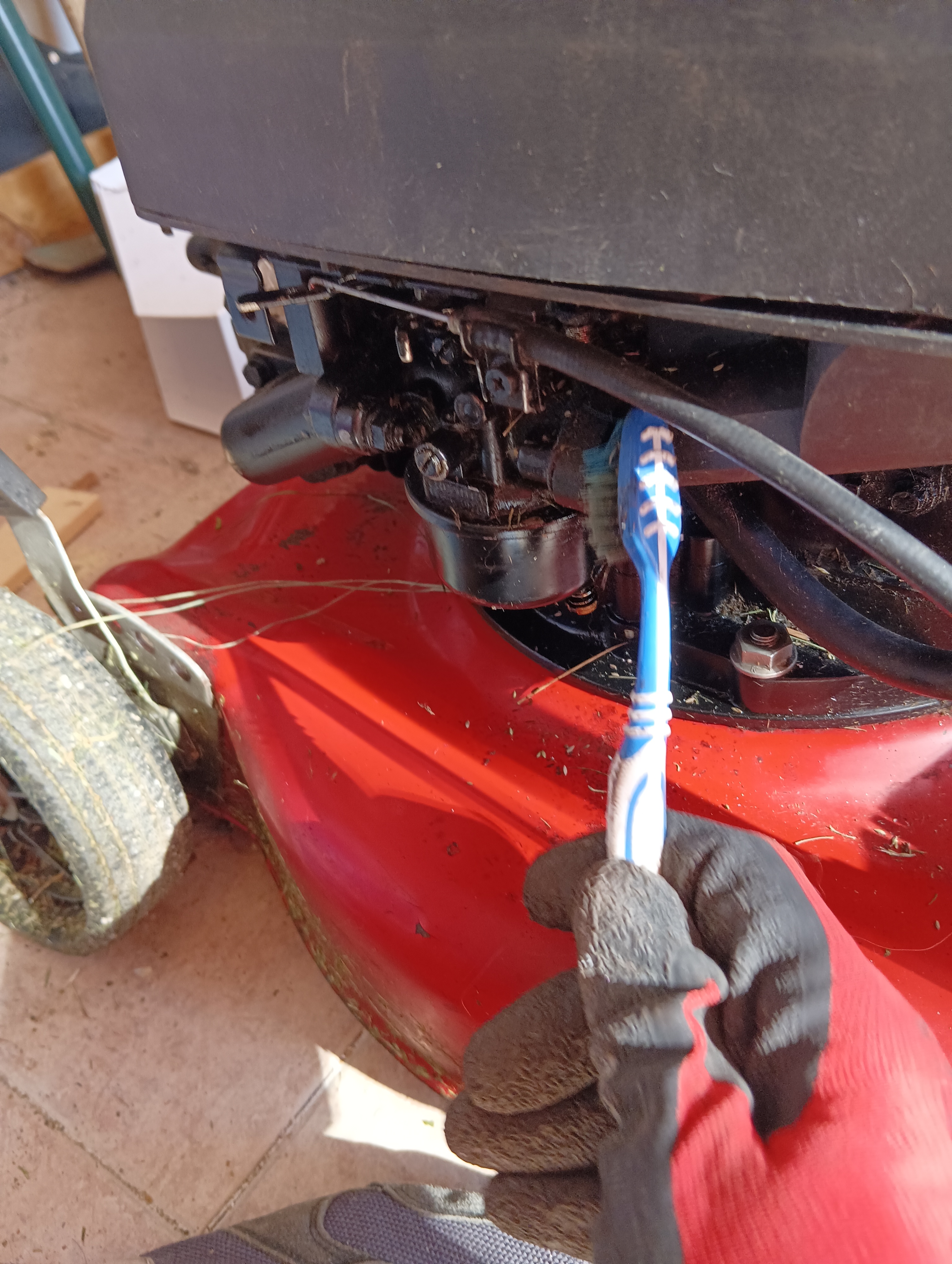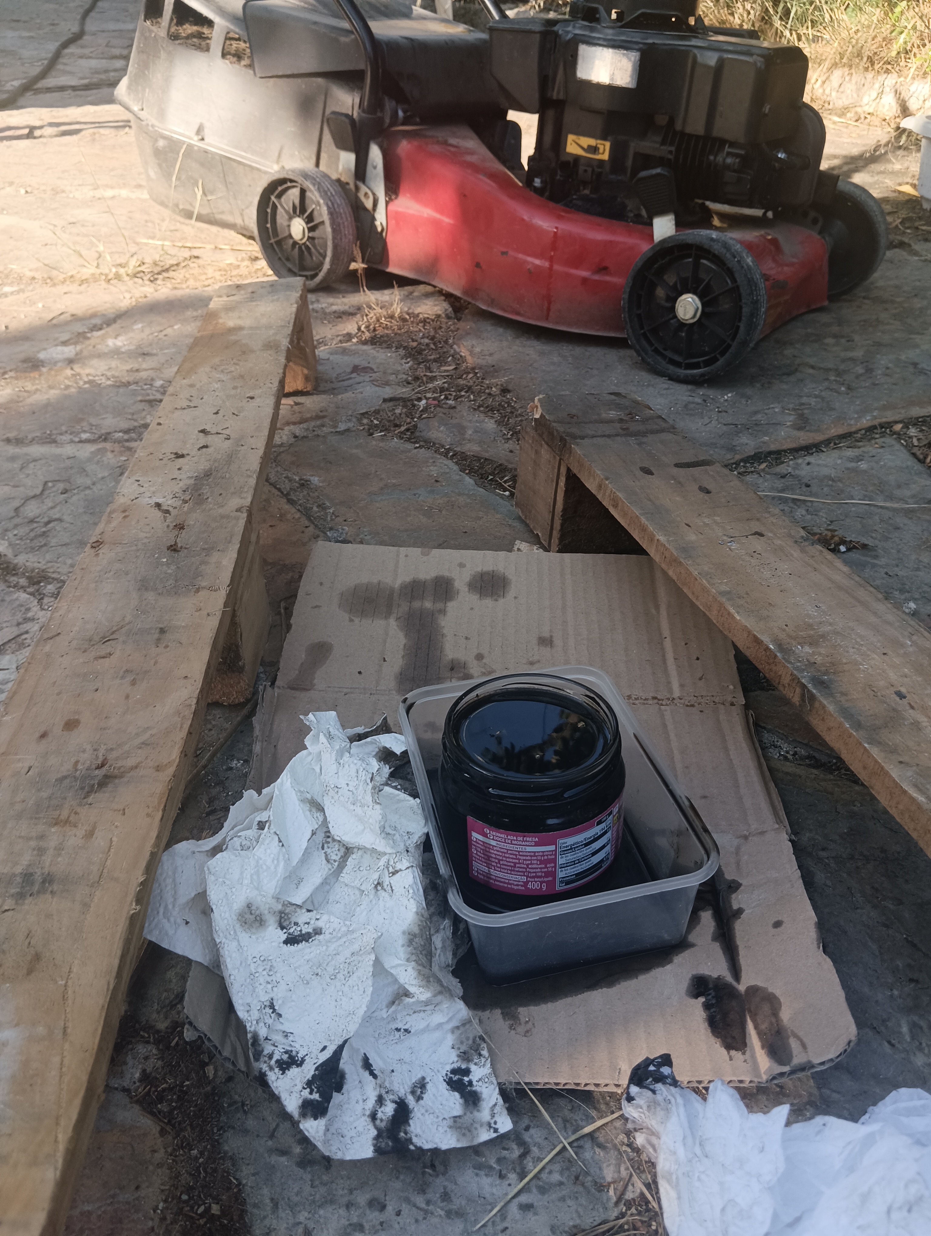 Para conseguir arrancar la Machine, por inexpreciencia nos tocó hacer varias veces la misma operación, el filtro del aire fué fácil, el aceite lo hicimos varias veces hasta encontrar la tuerca inferior detrás de las cuchillas, la bujía se limpio y tenía chispa, pero terminamos comprando una nueva para ver si mejoraba algo