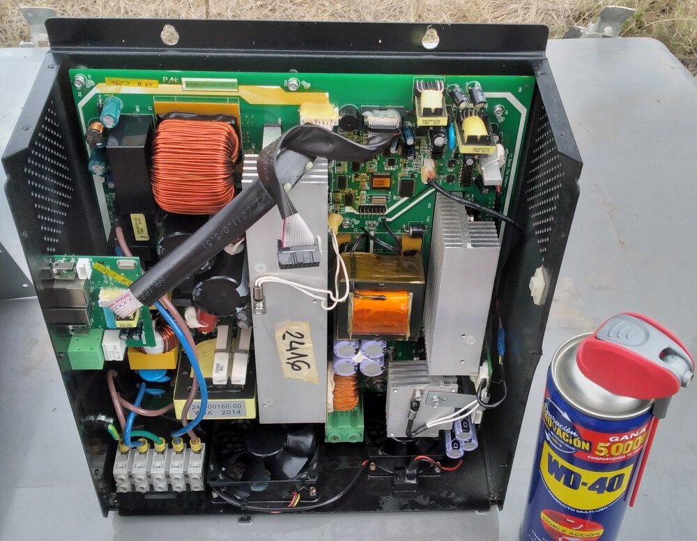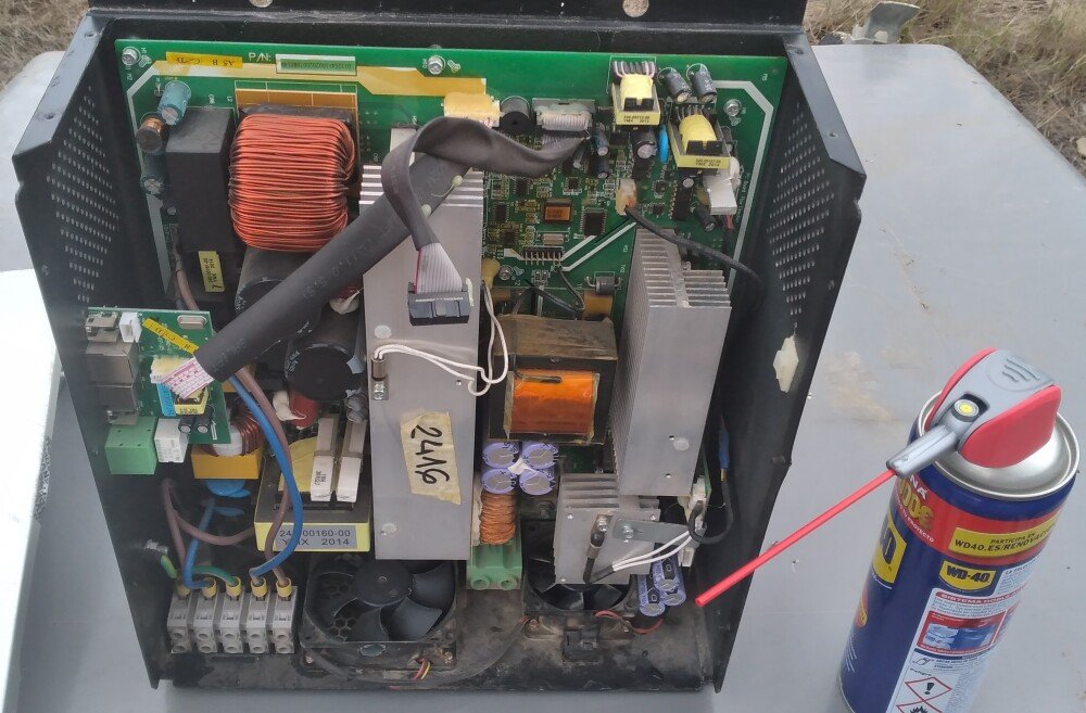 Reparación de regulador solar con Wd40. El regulador solar daba una alarma de fallo en los ventiladores de refrigeración. Como se puede apreciar en las imágenes una vez abierto estaba lleno de suciedad, polvo e incluso pelos de animal llenaban toda la placa y circuitos. Los ventiladores estaban atascados por esta suciedad. Una vez extraída toda la suciedad con un pequeño pincel, le apliqué generosamente WD 40 ayudándome de su extensor de plástico para llegar a los rincones más difíciles del circuito. El resultado es que ha quedado todo muy limpio y los ventiladores han vuelto a funcionar en conjunto con todo, una maravilla y sin tener que pasar por el servicio técnico.