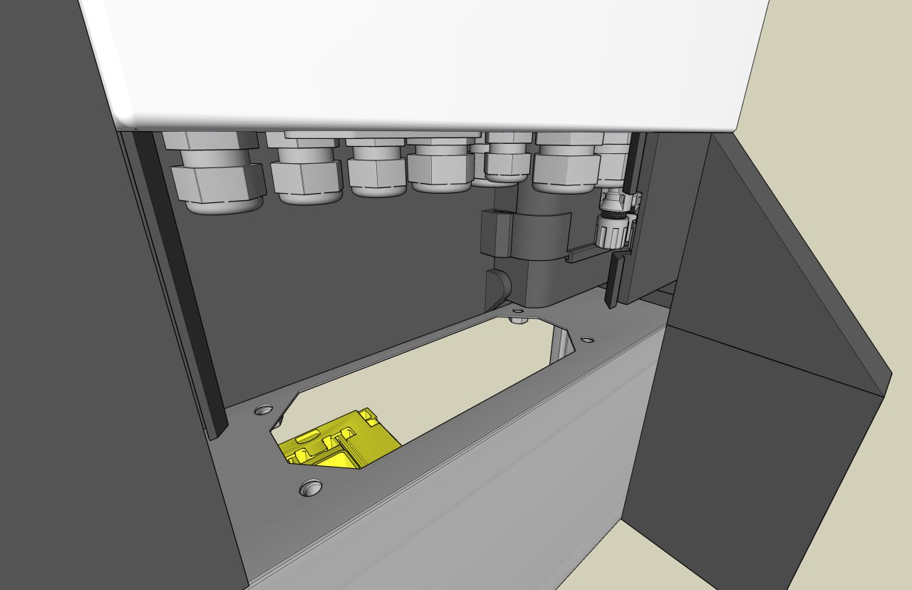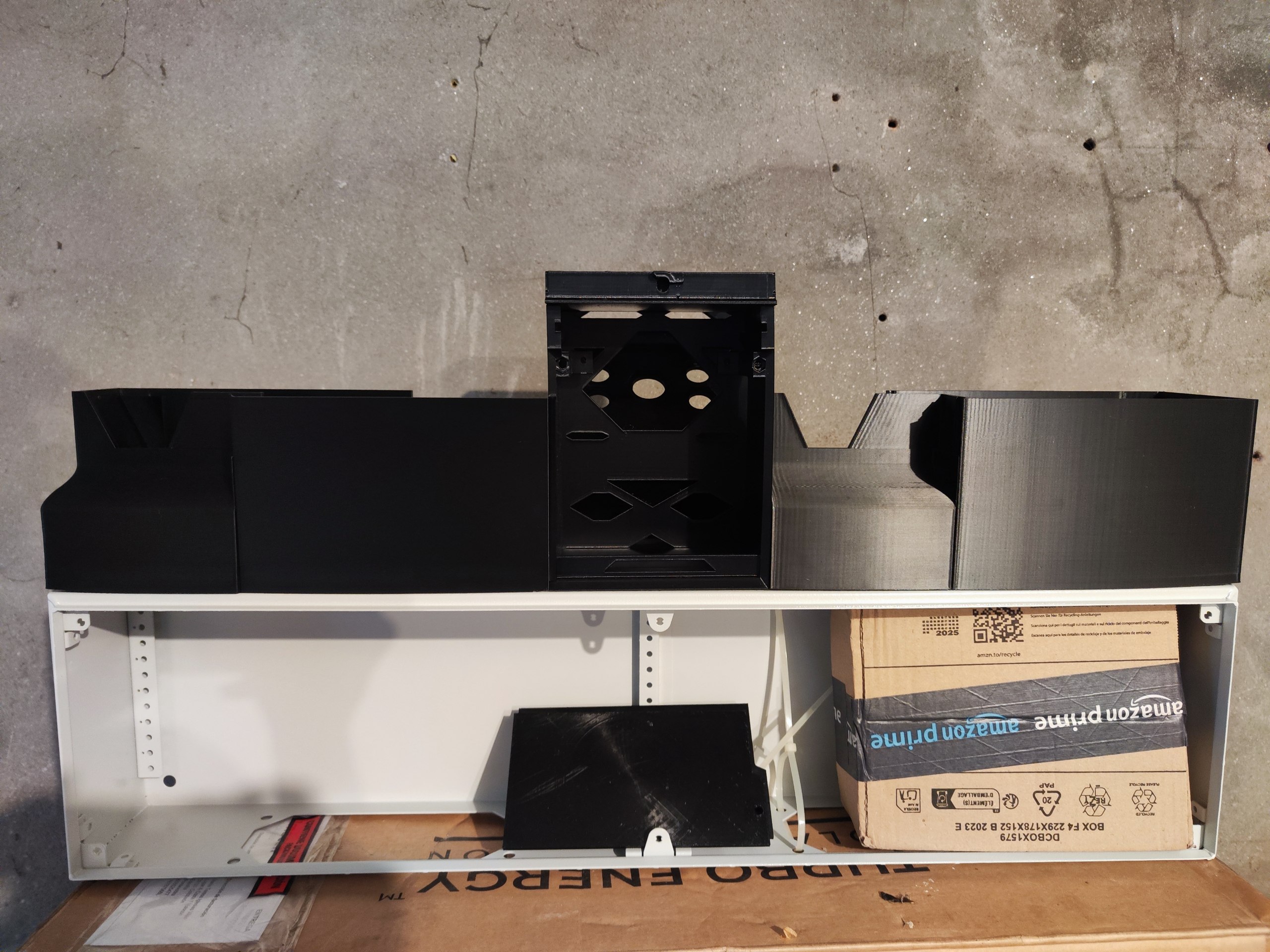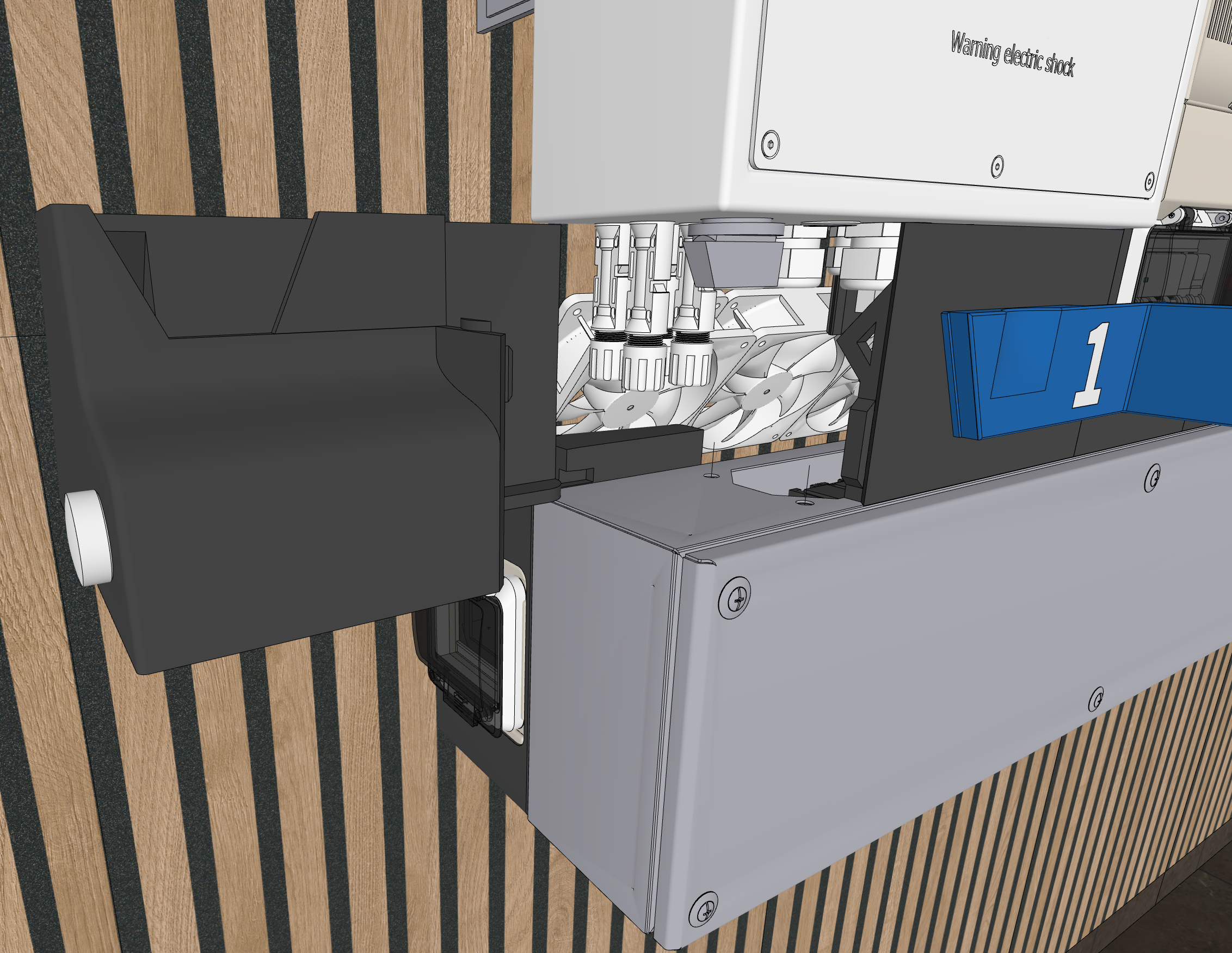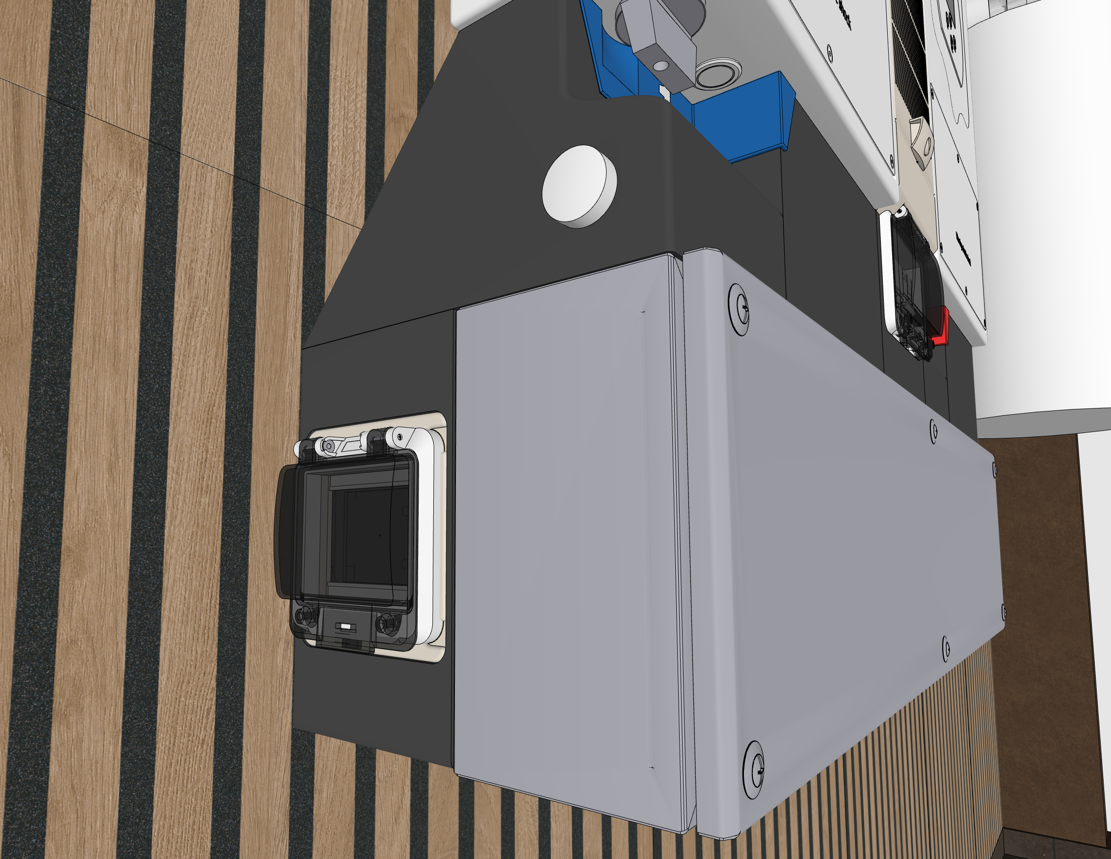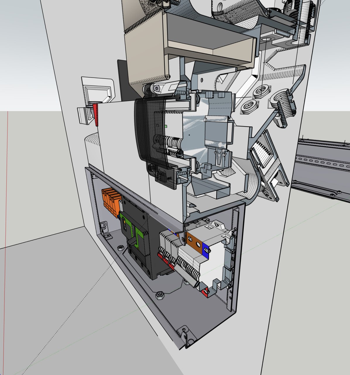 Por ejemplo mejorando las uniones de las piezas y definiéndolas mucho mas, añadí por ejemplo el cajoncito auxiliar blanco que podría guardar la "llave" que abre la rejilla frontal, perforaciones laterales de 22mm de diámetro para elementos adicionales como botones auxiliares o luces piloto, etc... También añadí una luz led en la parte superior para indicar un estado general o con ideas de domotización a posteriori.