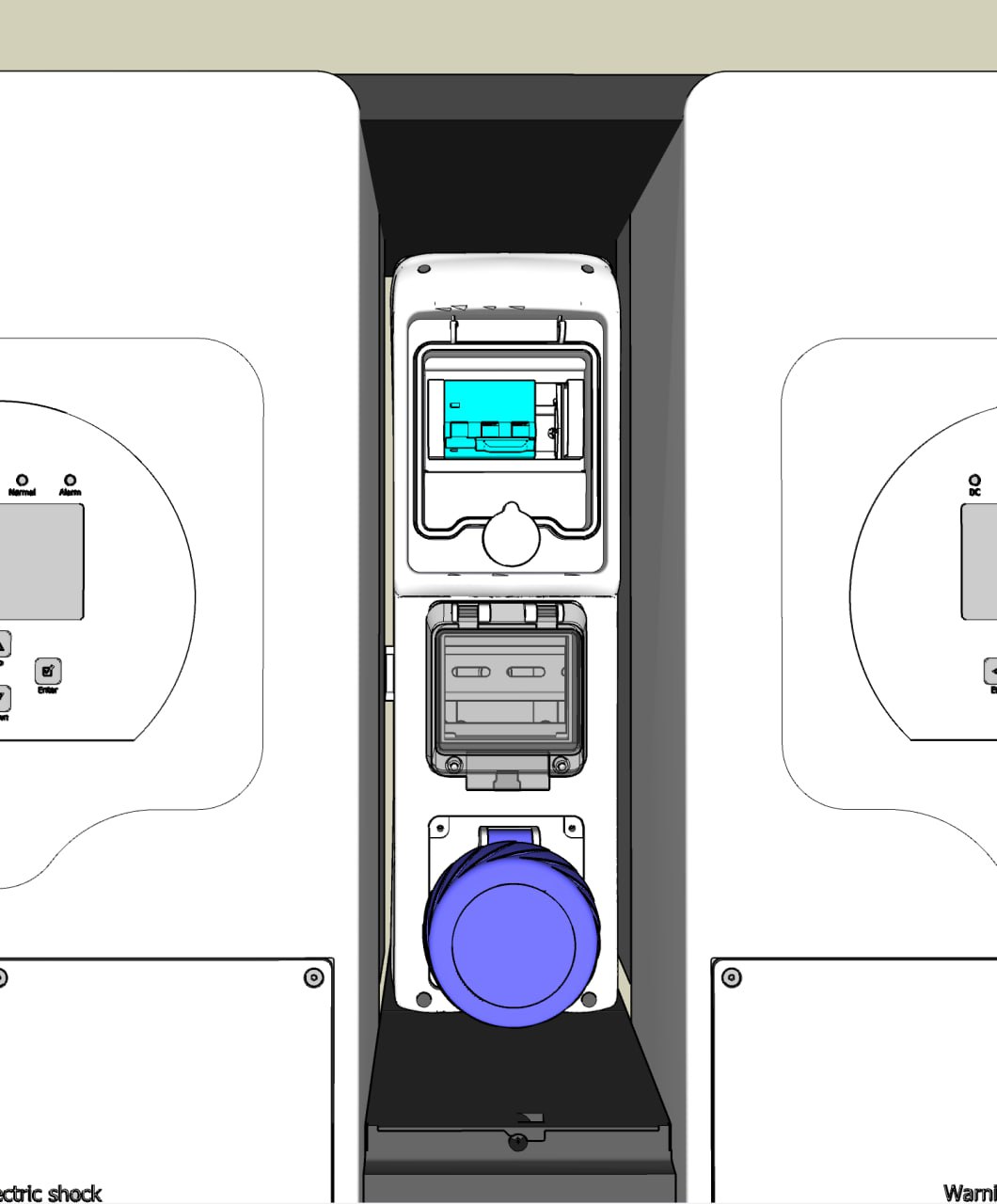 Hay otra caja certificada en el lateral para cuatro módulos din. Y al otro lado un conector industrial para carga pesada de 63A. Y estos son solo algunos de los detalles que representan este proyecto.