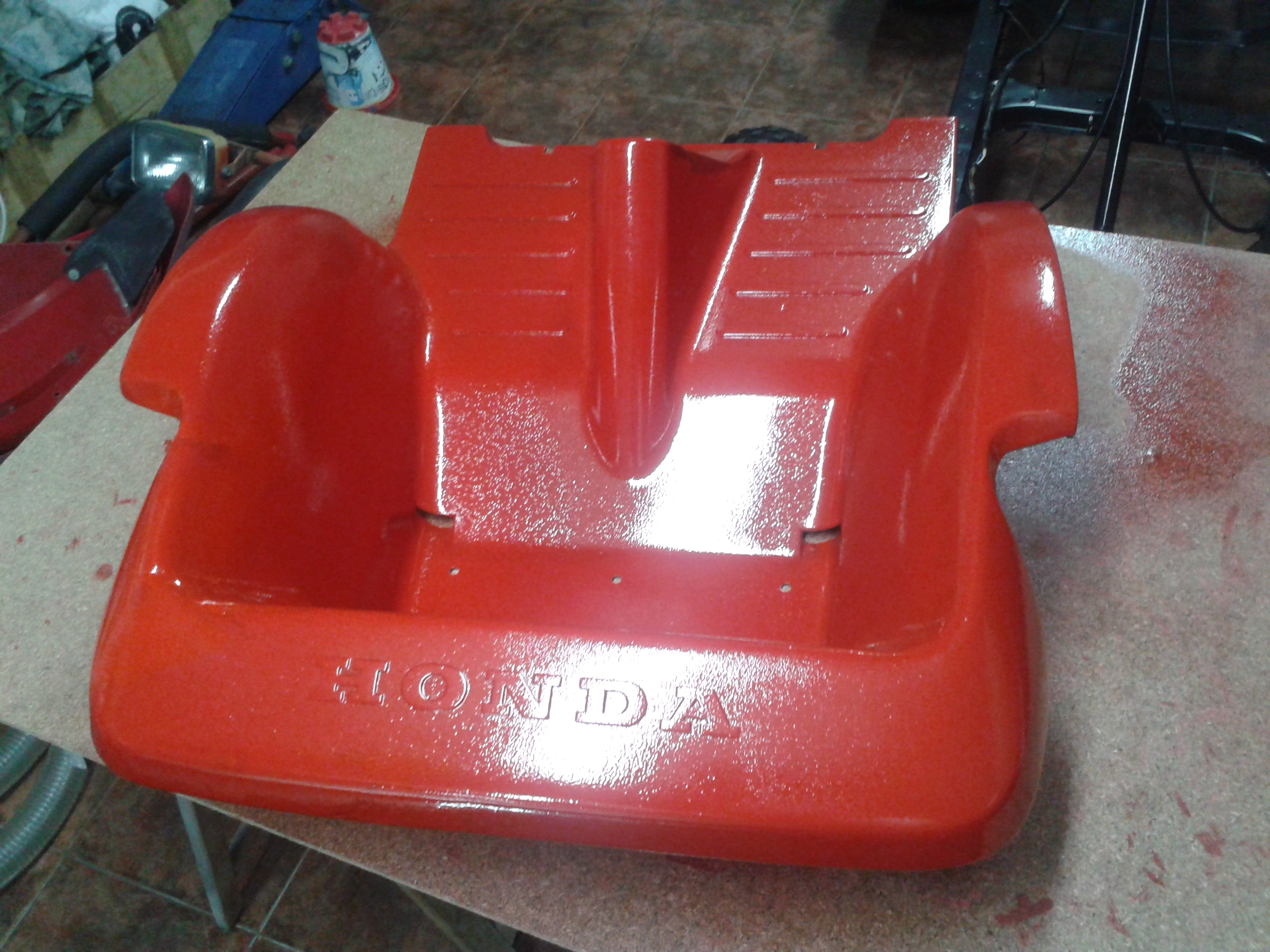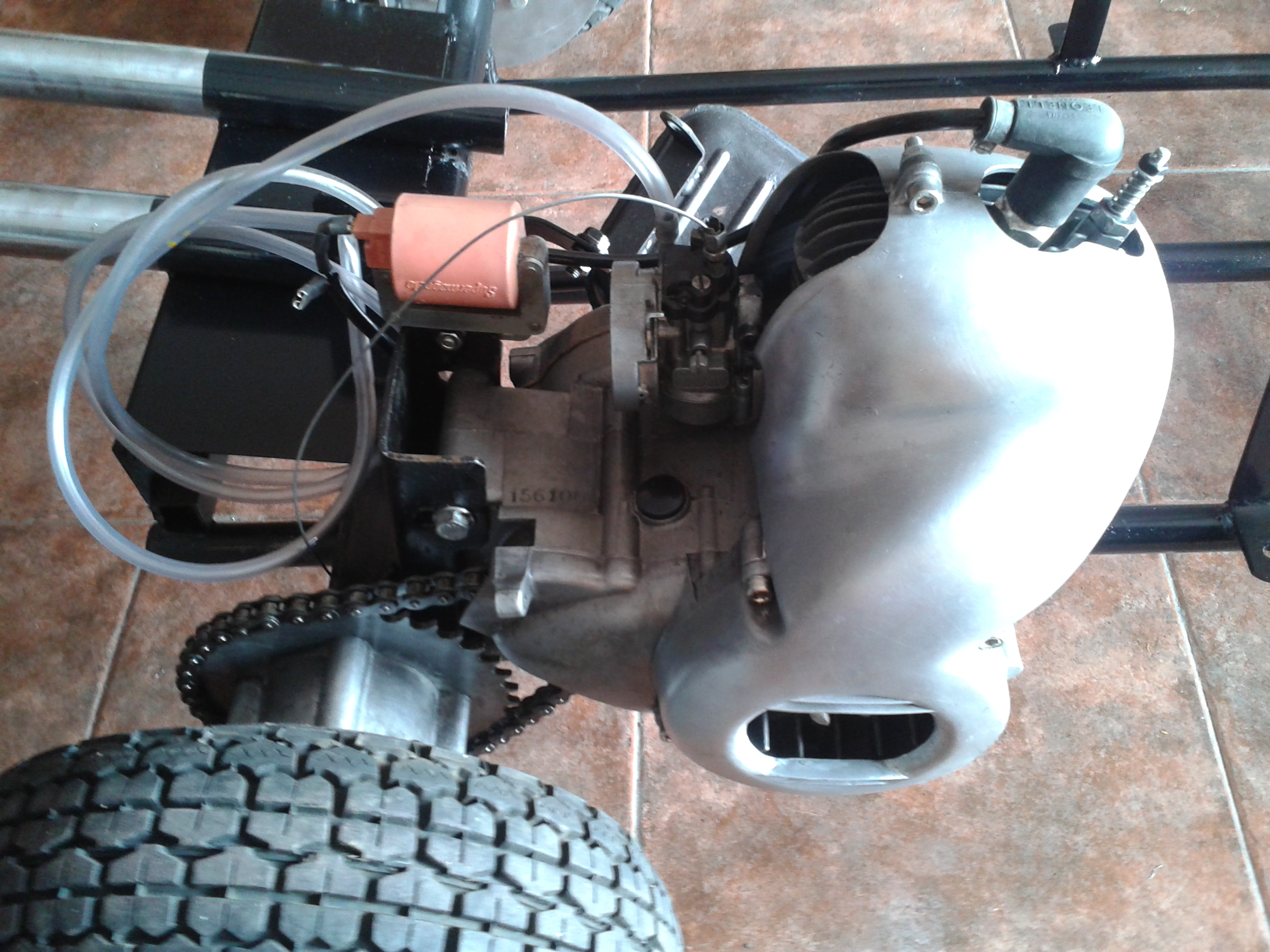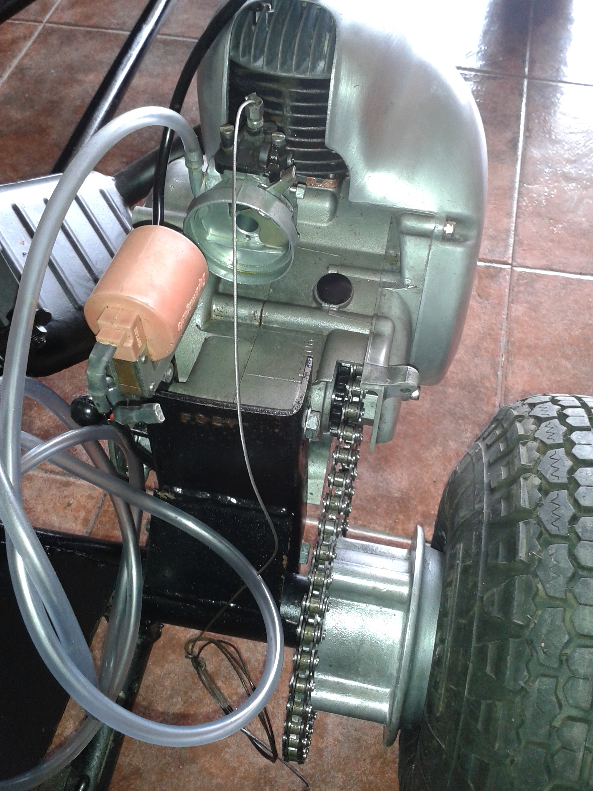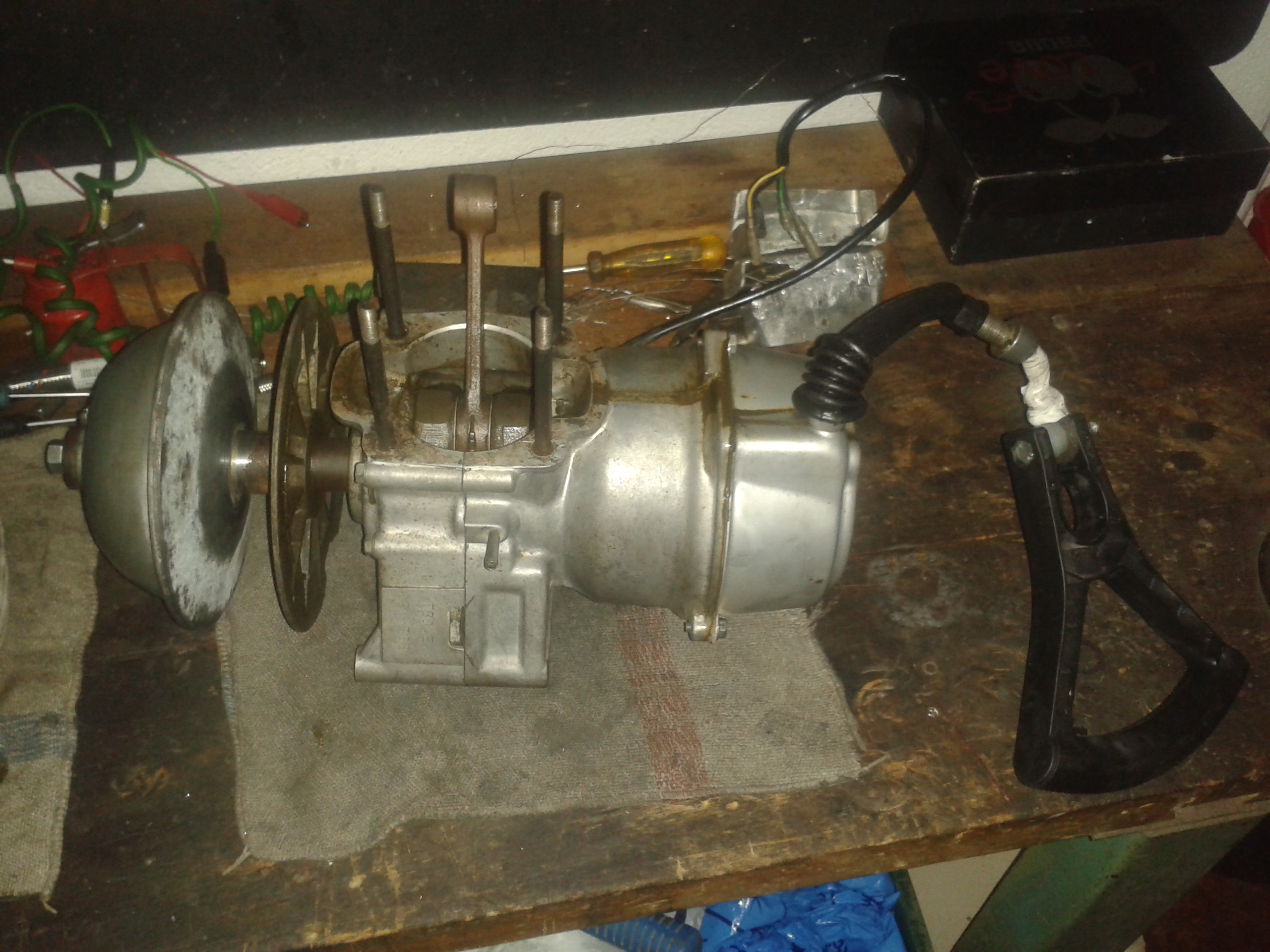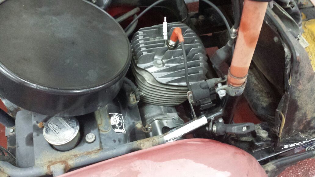 pinto restauro la fibra rota . tapizo el asiento . y bueno poco a poco va cojiendo algo de color . hasta que al final consigo el momento en el que puedo arrancarlo ajustarlo y dejarlo sonando como un reloj .toc toc toc .mmm un motor honda 2t de los años 70 -80 .maravilla .
