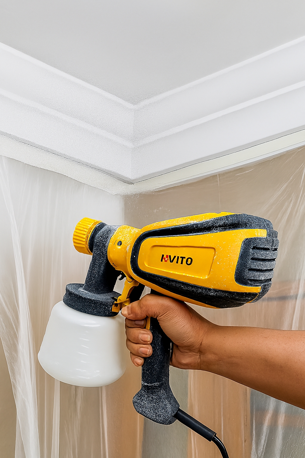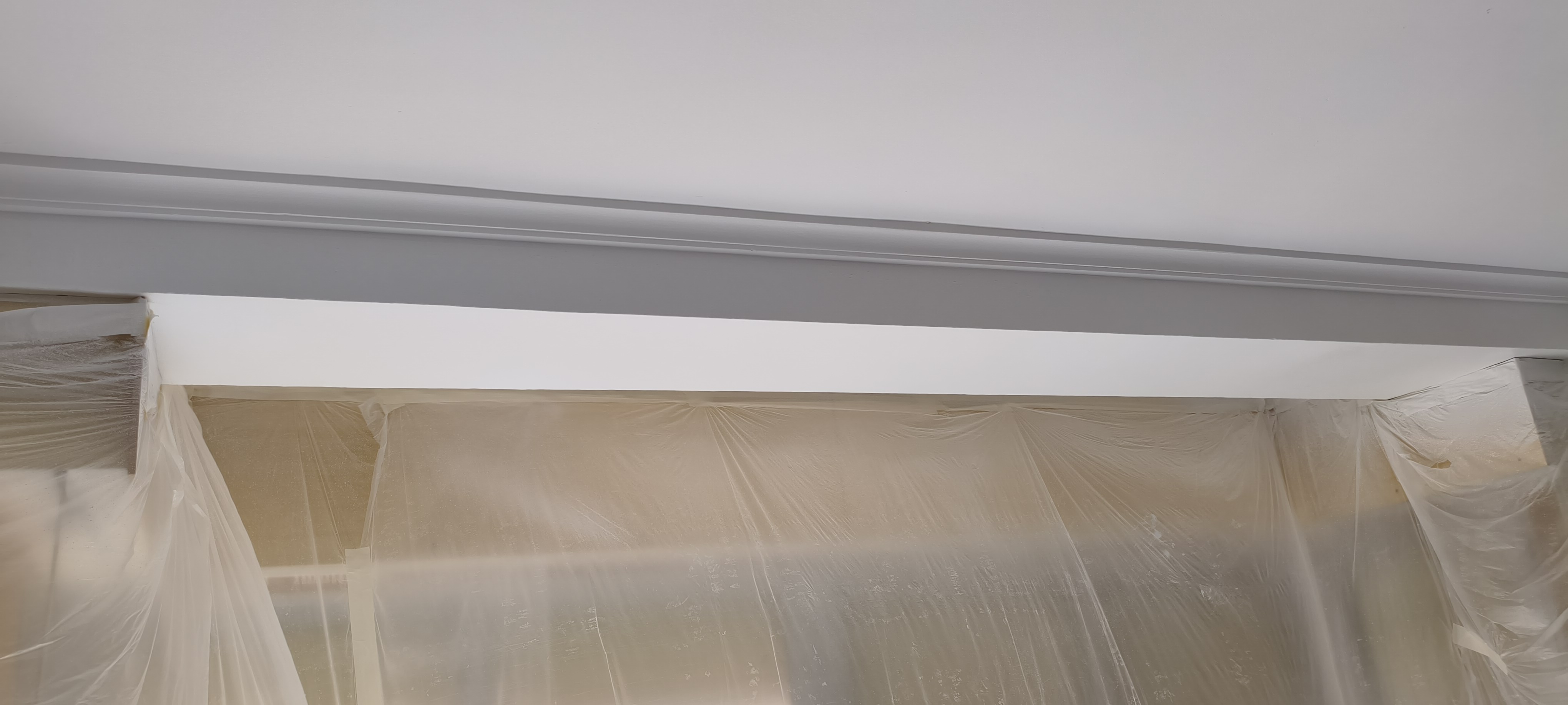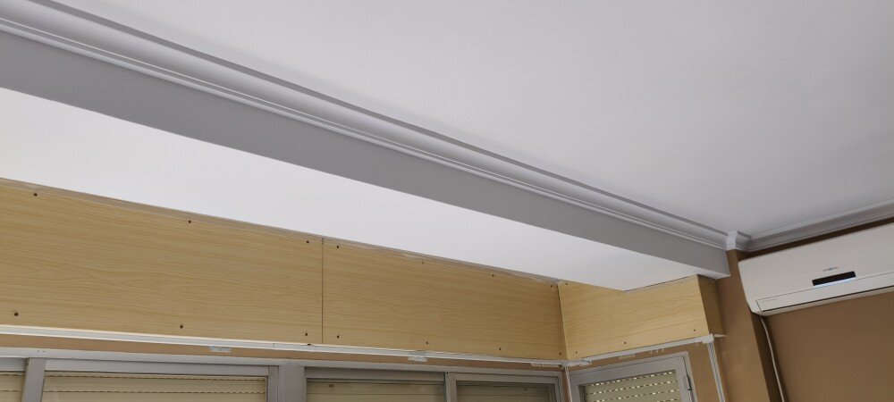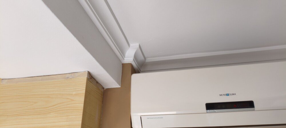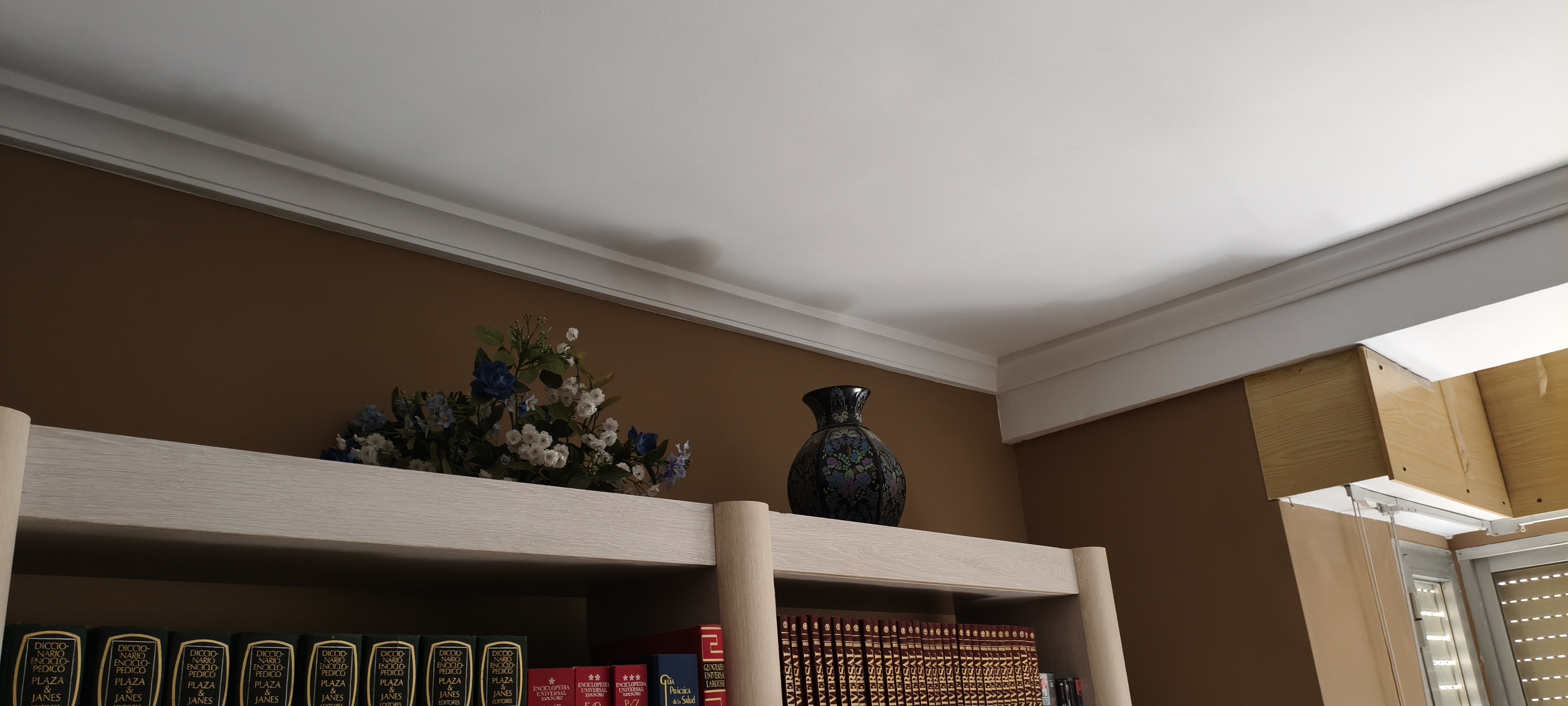Con la boquilla en vertical echamos el flujo en horizontal para ir pintando desde la moldura hacia arriba, con movimientos continuos y capas delgadas para evitar goteos, hasta donde llegue la pulverización. Voy desde la moldura hacia el centro del salón, así hasta cubrir toda la moldura.
