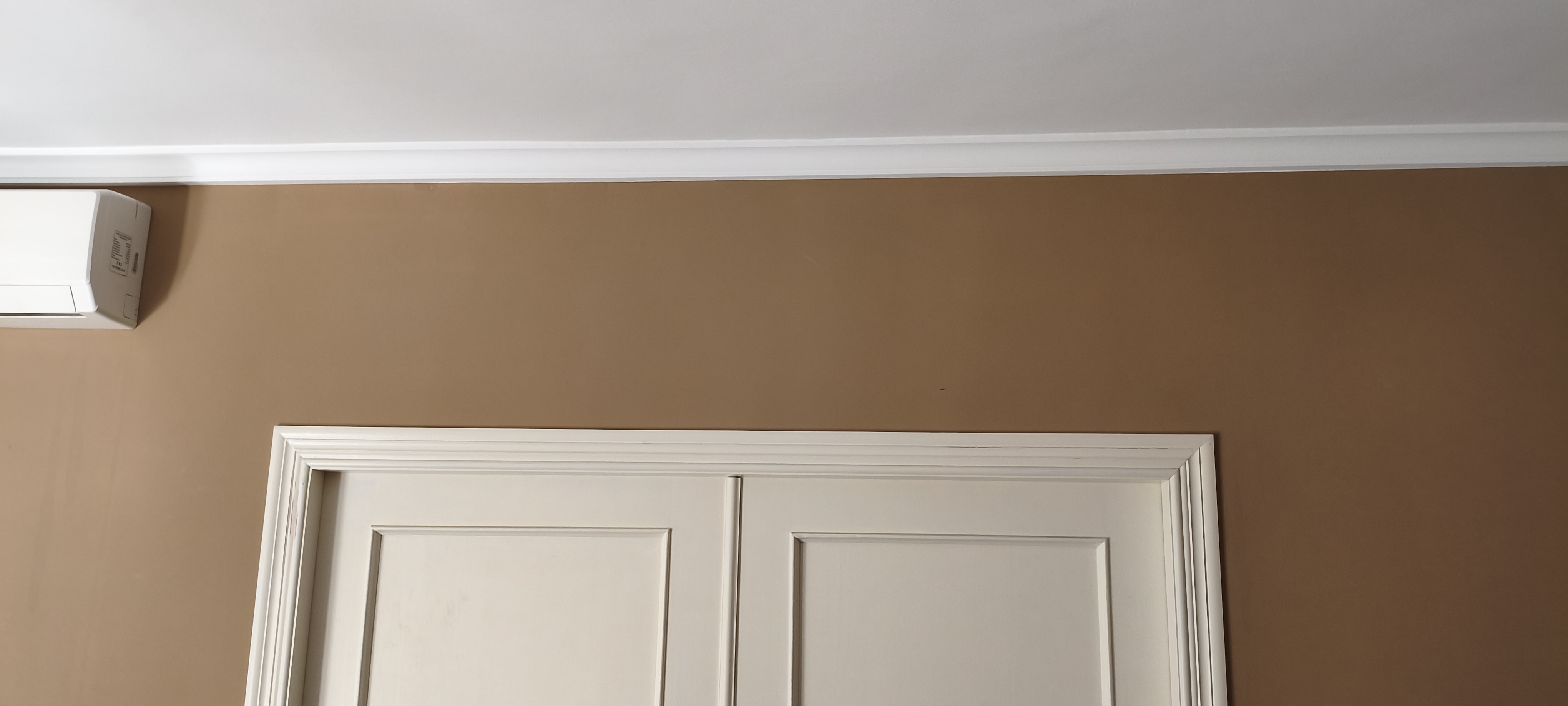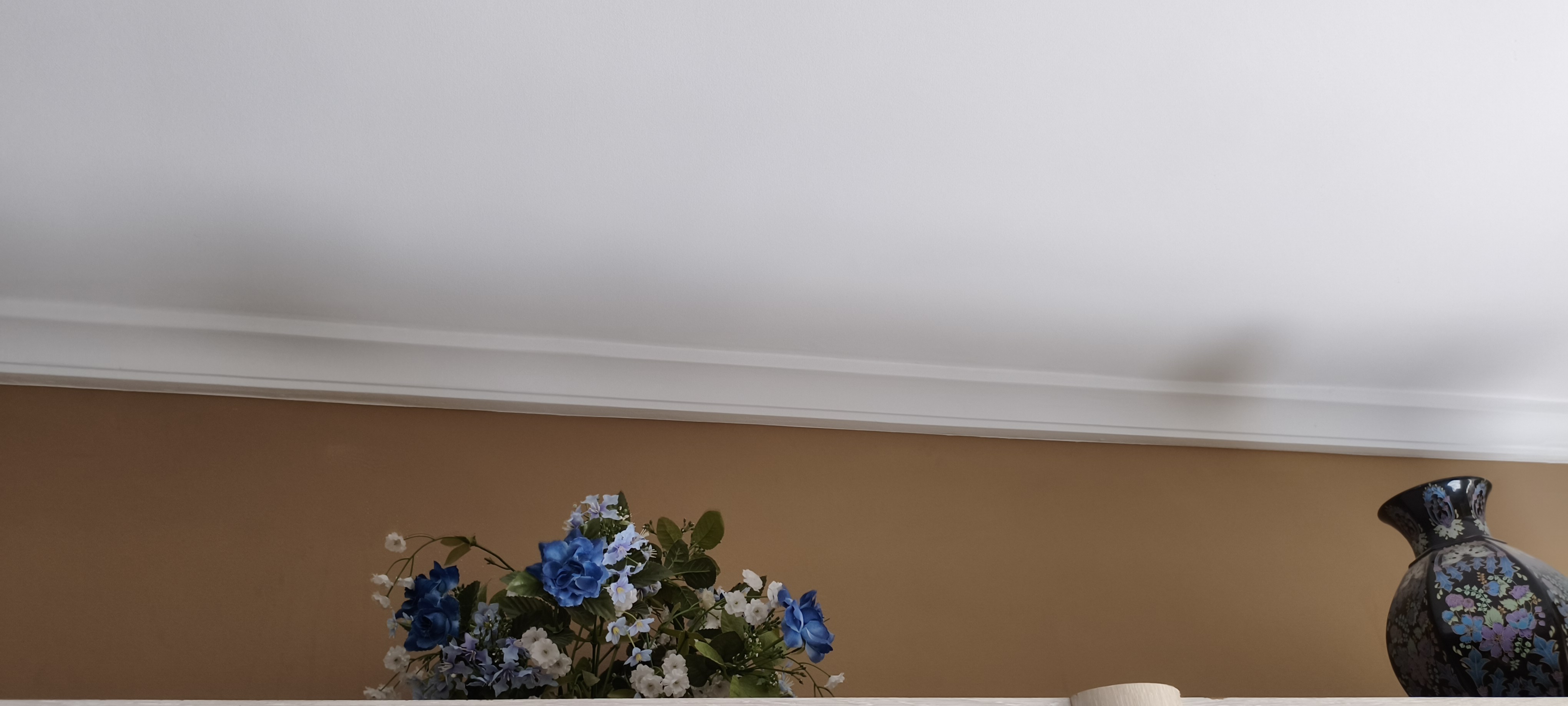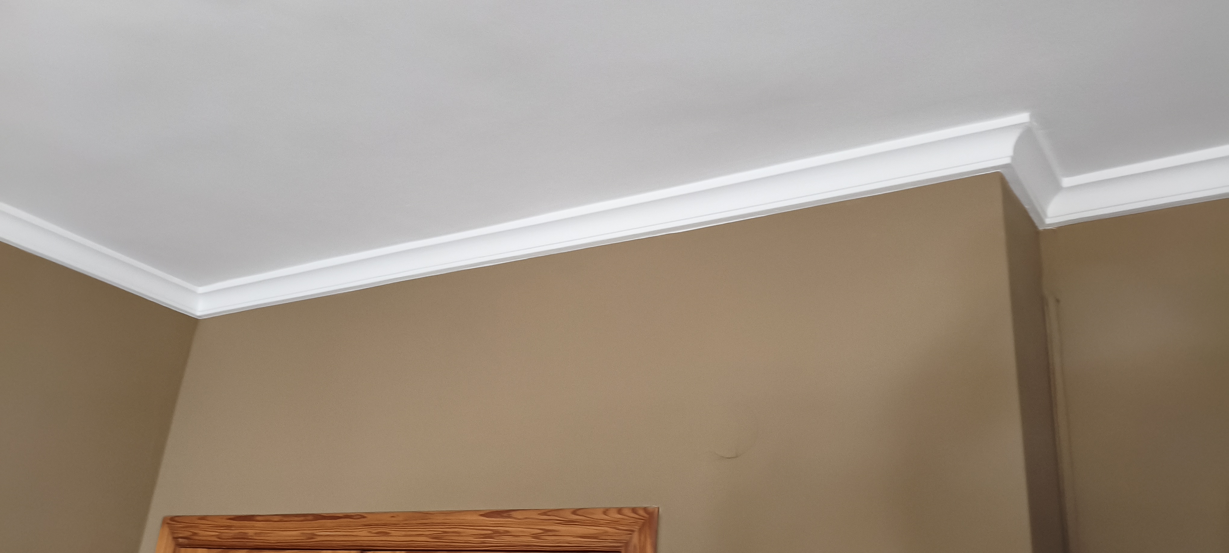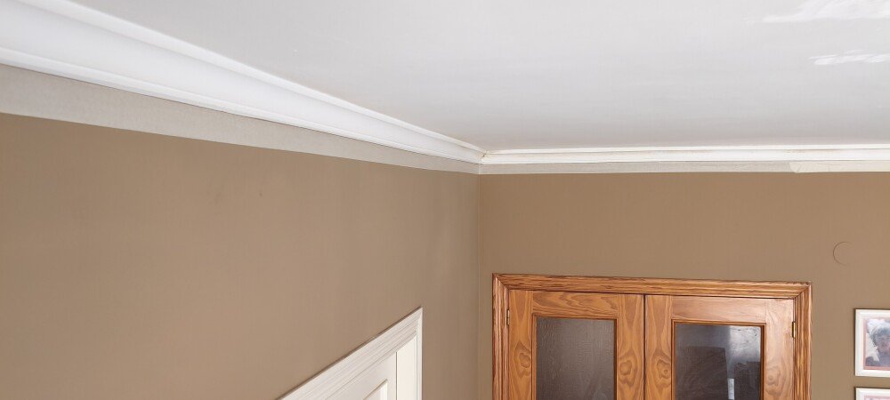 Con la boquilla en vertical echamos el flujo en horizontal para ir pintando desde la moldura hacia arriba, con movimientos continuos y capas delgadas para evitar goteos, hasta donde llegue la pulverización. Voy desde la moldura hacia el centro del salón, así hasta cubrir toda la moldura.