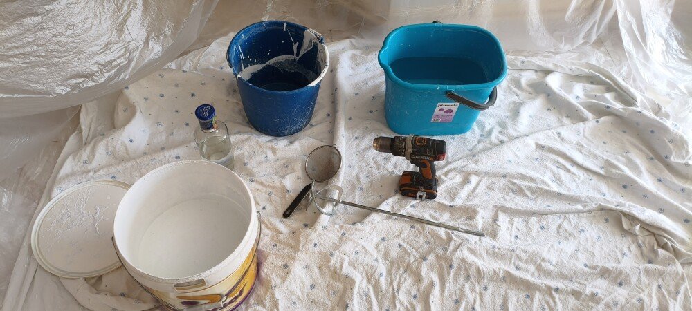 Como la pintura viene muy espesa, añadimos agua y batimos con una varilla mezcladora y un taladro hasta que quede suelta.