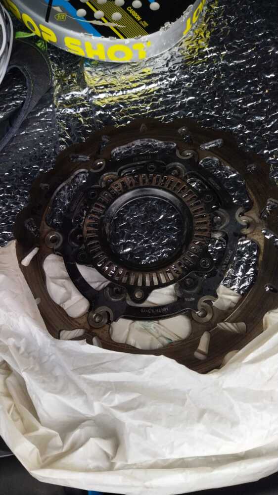 En ese momento, también nos dimos cuenta de que la bomba de freno se había quedado gripada y el pistón no recuperaba correctamente, así que buscando en una pagina de segunda mano conseguimos todos los elementos de la frenada por muy buen precio... Pero no todo iba a ser tan fácil, ya que al ser de un modelo anterior, el disco de freno no tenia las hendiduras para la rueda fonica del ABS, pero nada que un buen tornero no pueda solucionar!! Asi que tomamos medidas en el trozo del disco original y lo llevamos a modificar.