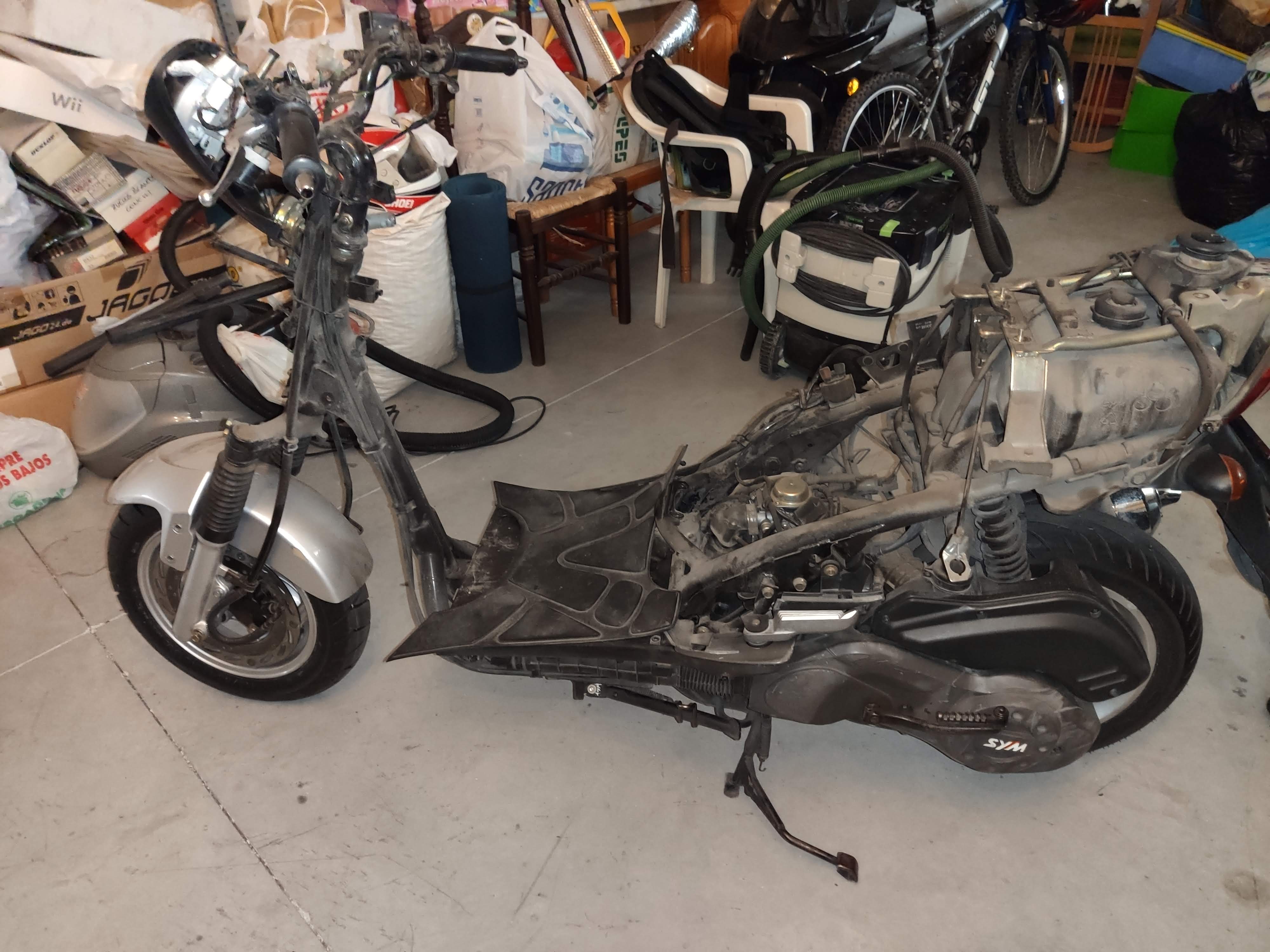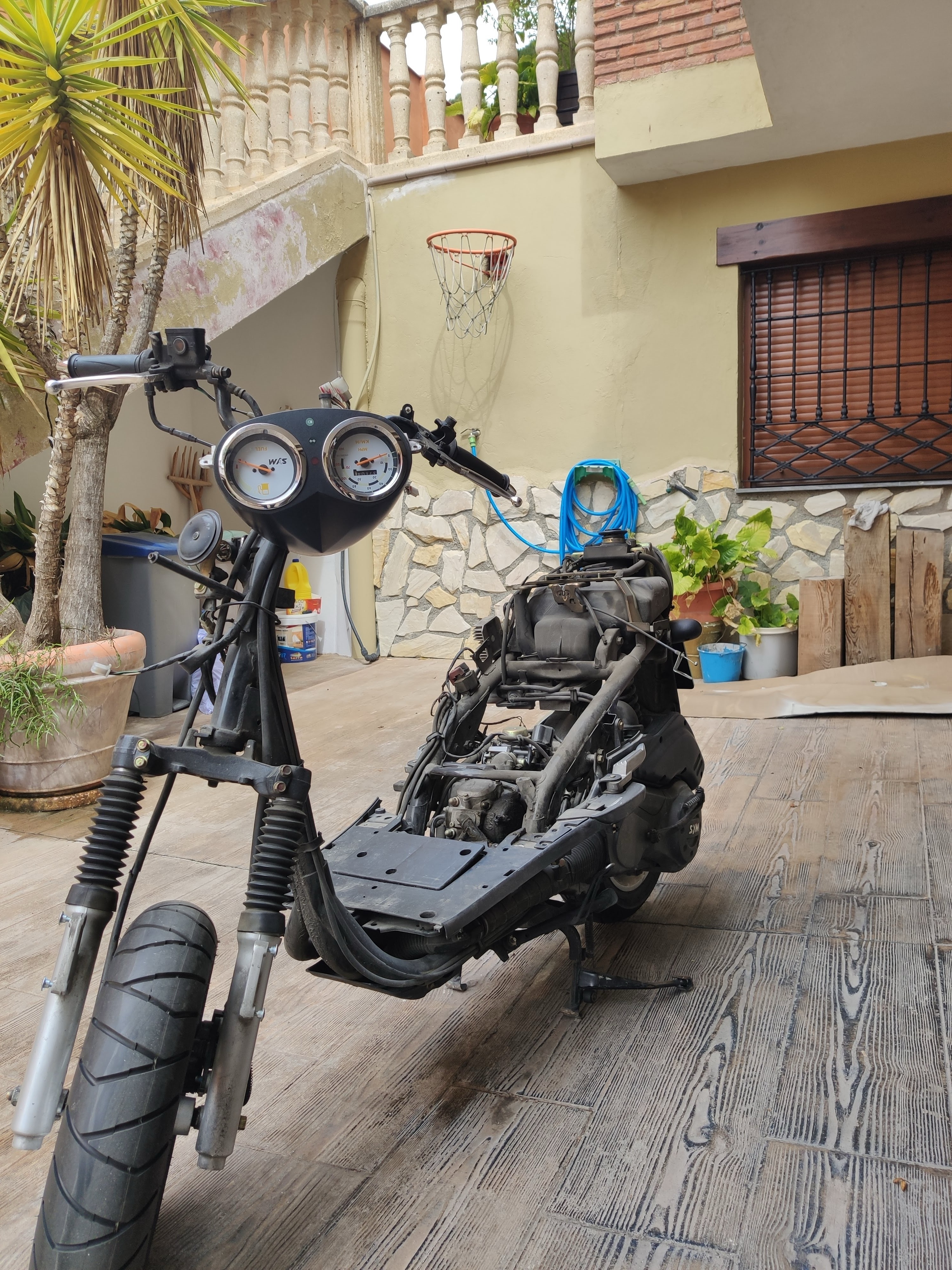 Durante años, esta SYM 125, a la que cariñosamente llamamos la moto zombi, ha sido mi medio de transporte, pero hace 3 años que su motor decidió no volver a rugir. El diagnóstico es claro, gripado del motor. Actualmente permanece olvidada, esperando a que alguien tome la dura decisión…plásticos rotos y un aspecto que la condena al desguace. Pero precisamente ahí nace la inspiración: convertir la decadencia en oportunidad.