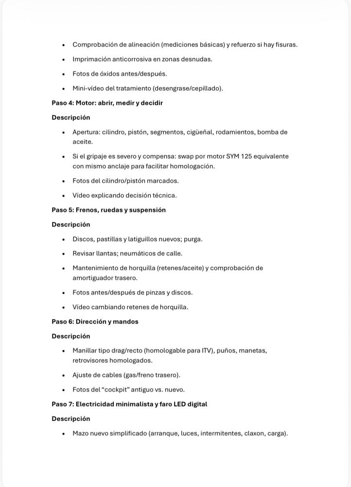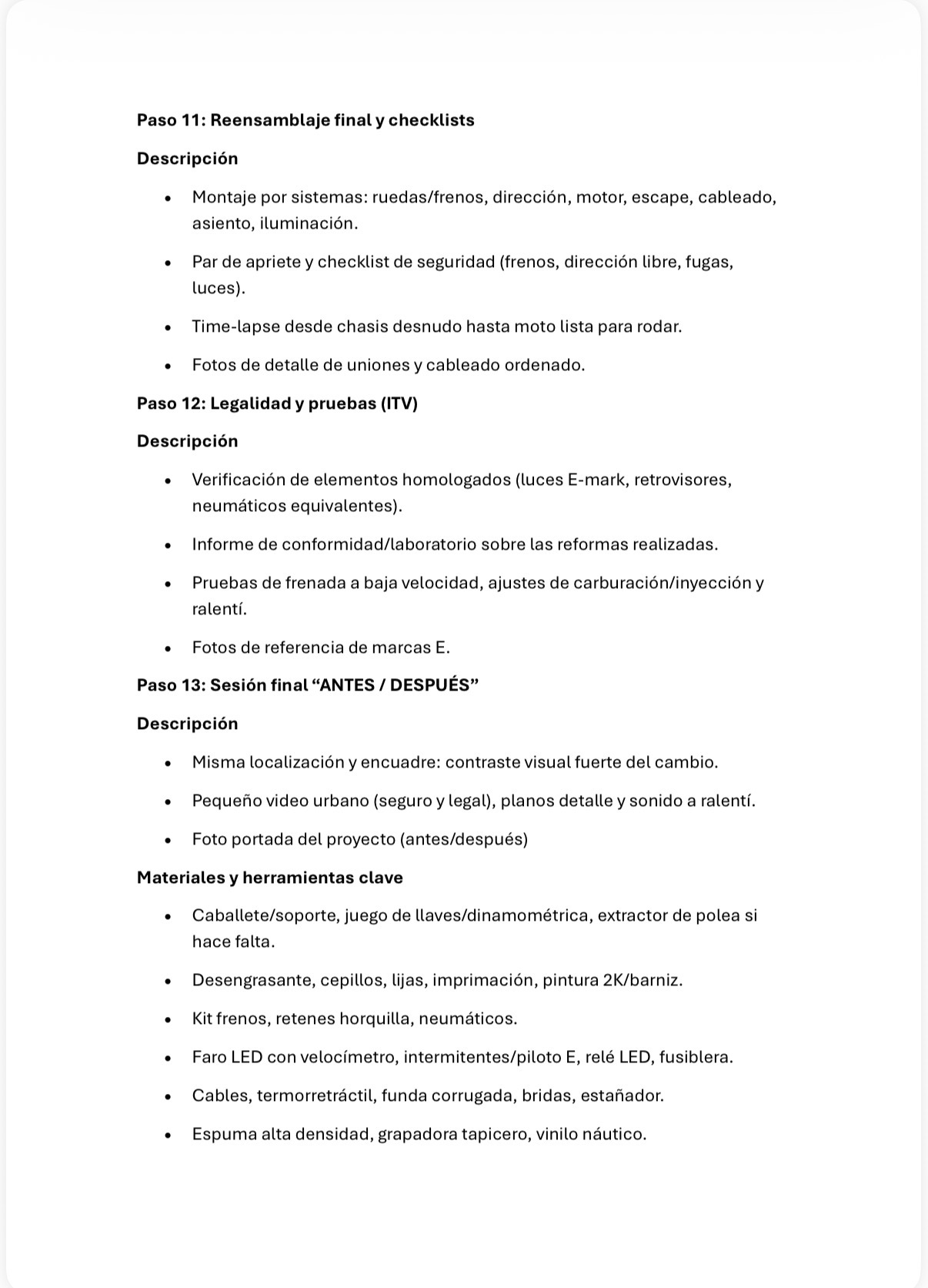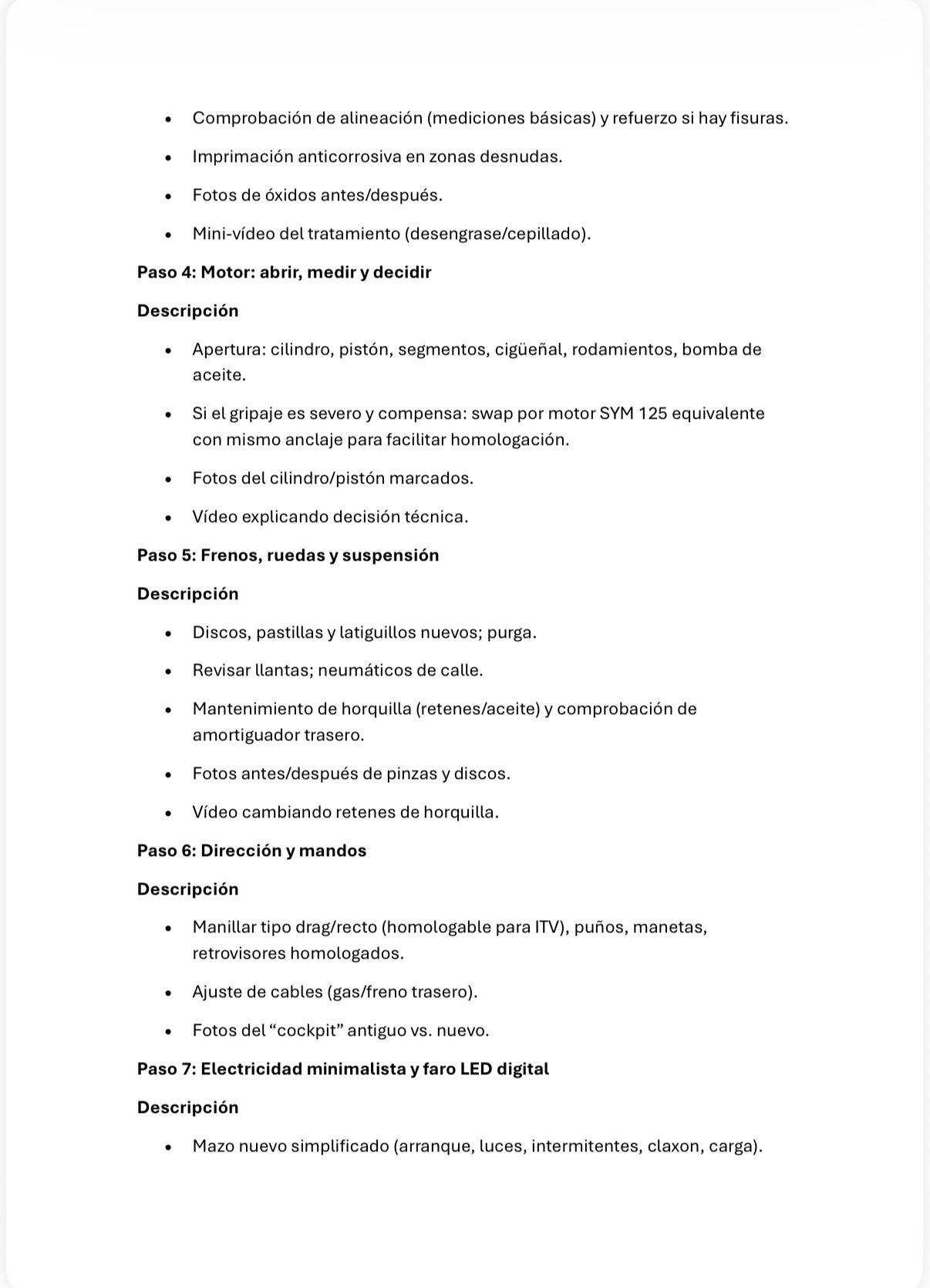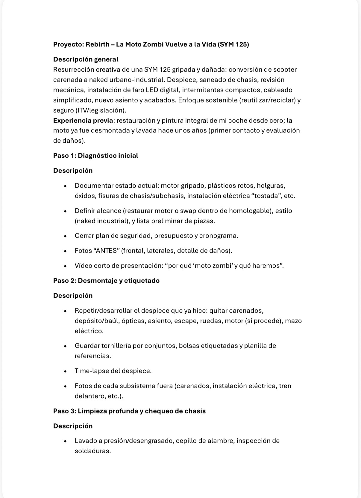 El proyecto Rebirth busca transformar por completo esta vieja scooter, eliminando todos los plásticos y dejando al descubierto su estructura, para reinterpretarla como una moto desnuda de estilo urbano-industrial. El objetivo es construir, desde su chasis, un vehículo minimalista, moderno y funcional, que conserve la esencia mecánica original, pero con una nueva estética basada en la simplicidad, el reciclaje y la personalización artesanal.