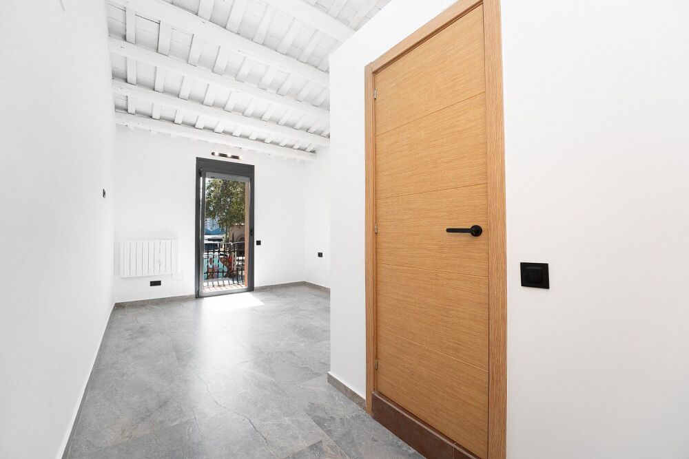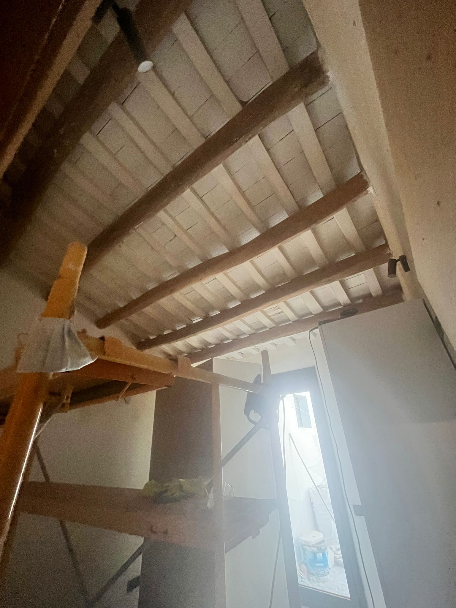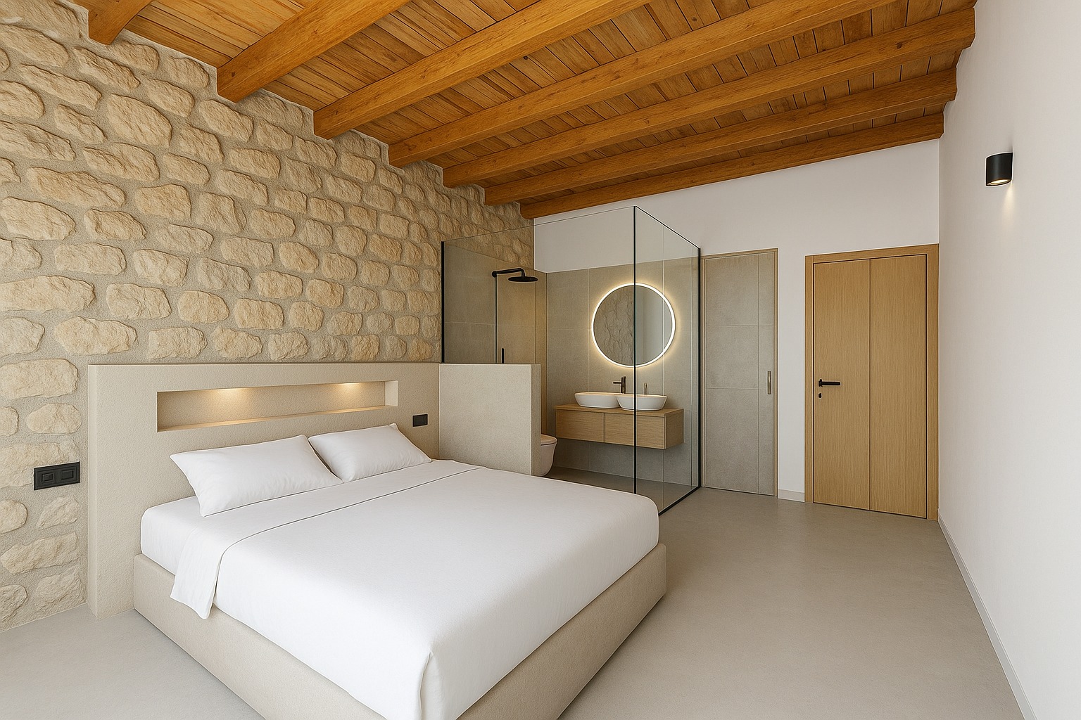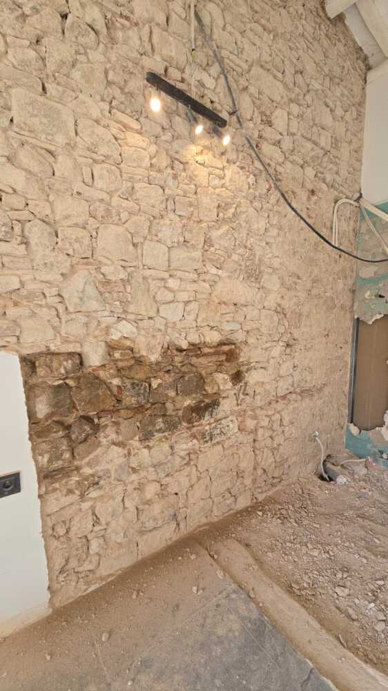 Hemos comprado una casa de 1845 renovada sin ningún cariño y a lo moderno. En la habitación principal había una especie de cubo para el baño en suite, 20 cms por encima del suelo de la habitación, las vigas originales no resaltaban y se había tapado el muro de piedra. Ya hemos destapado el muro original, decapado las vigas y tirado el baño para hacer un baño realmente integrado y con un estilo más acorde a la época de la casa