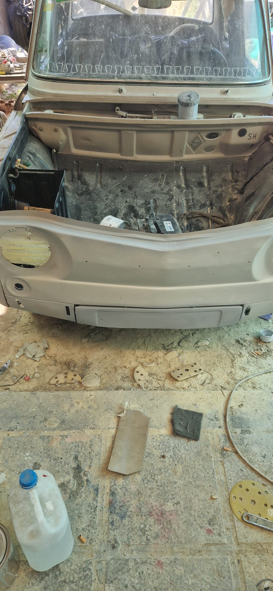 Tiempo después empecé a desmontar para un buen lavado de cara. Es muy difícil ser minucioso y detallar una restauración de este tipo sin dejarte nada en el tintero. En mi caso, empecé por desmontar capó delantero y faros, puesto que en algún momento el coche había perdido ácidos de la batería y tenía la chapa del interior del capó en muy mal estado. Eliminar el óxido y la corrosión fue un trabajo complicado, especialmente en los lugares más angulados. Tras esto, extendí producto anti óxido y una vez curada imprimación de zinc con fondo negro.