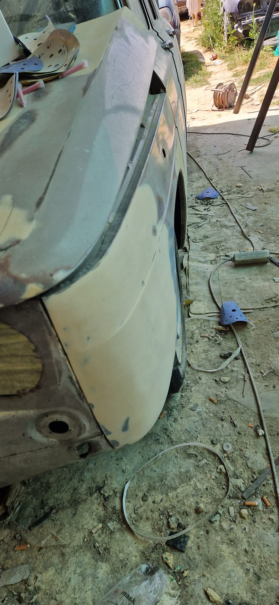 Más tarde vino el trabajo de pintura, lo más delicado. La chapa, aunque solo tenía un golpe grande, necesitaba pequeñas reparaciones en muchos lugares, así que taco de lija, paciencia y masilla. Esto es lo que más tiempo me llevó. También hubo que sanear algunos piquetes de óxido en el cierre de las puertas. Cuando todo esto estuvo listo, se limpiaron los bajos del coche con cepillo de alambres y se cubrió la parte baja con pintura antigravilla. Muy recomendable esto en coches veteranos que donde más pueden sufrir es por los bajos, la oxidación que no se ve y termina por comérselos. Finalmente, compresor y pintura. Aunque el acabado no es de cabina profesional, pero quedé satisfecho ya que con un buen pulido la pintura quedó lisa, bien extendida y brillante.