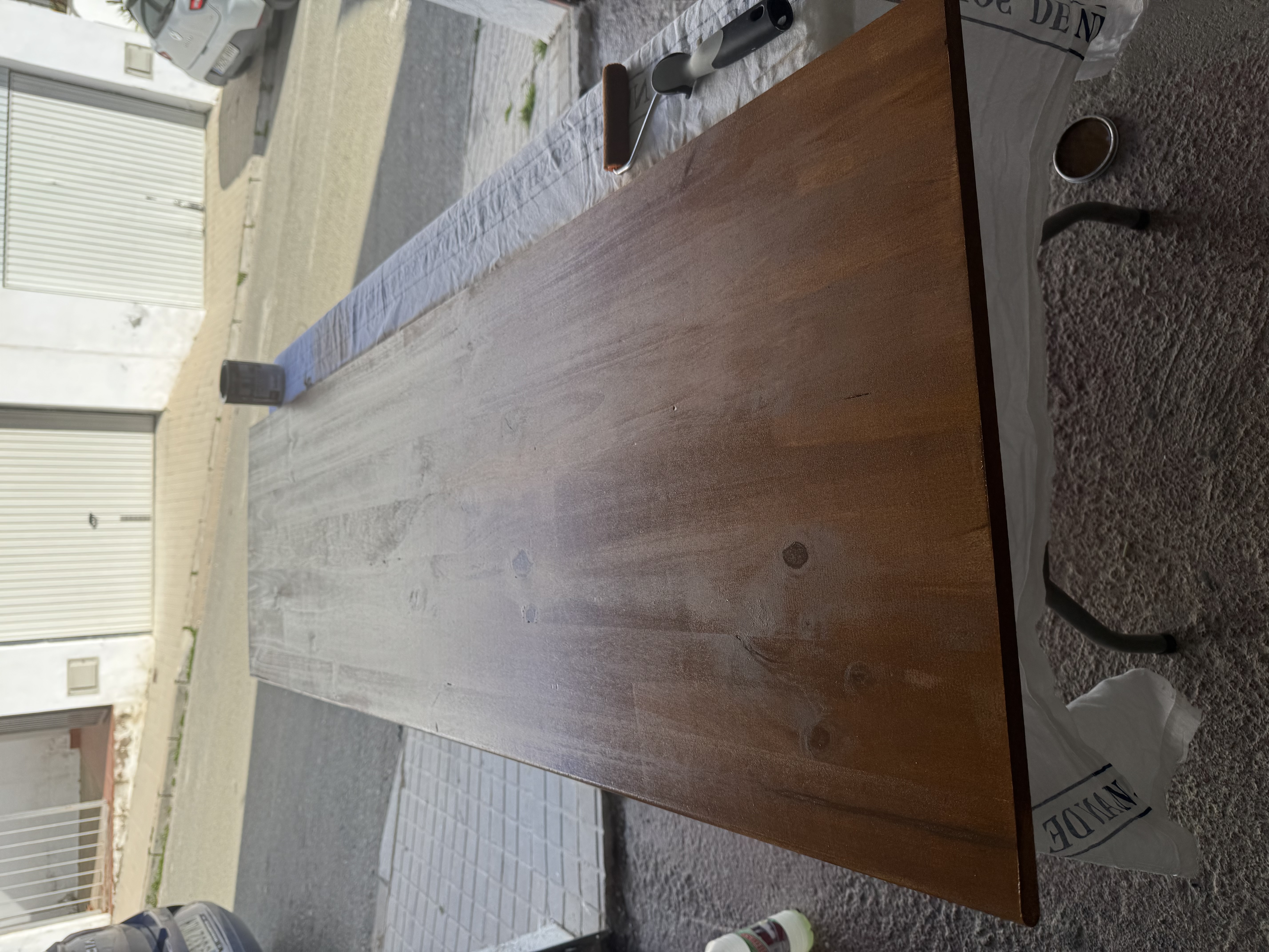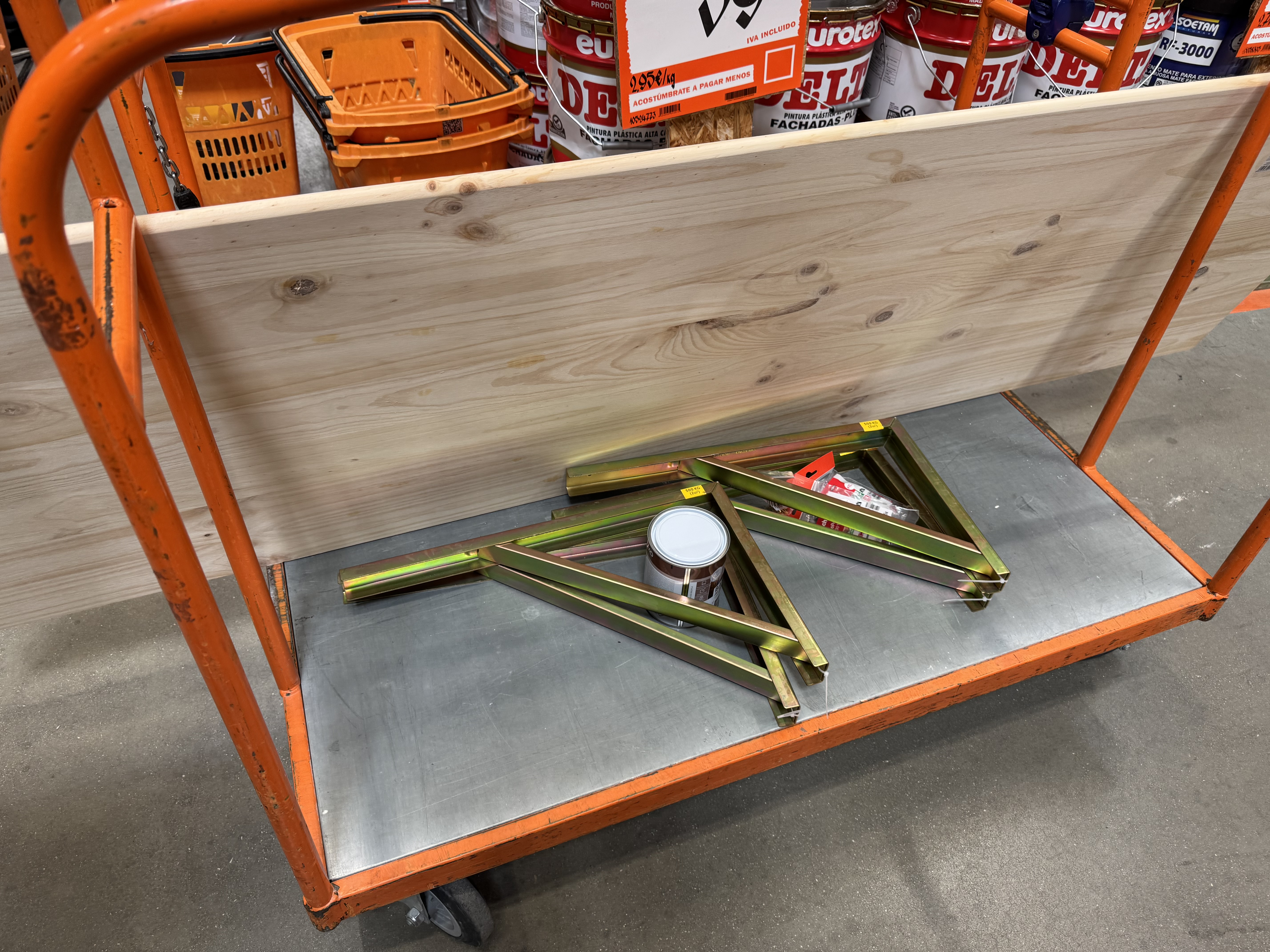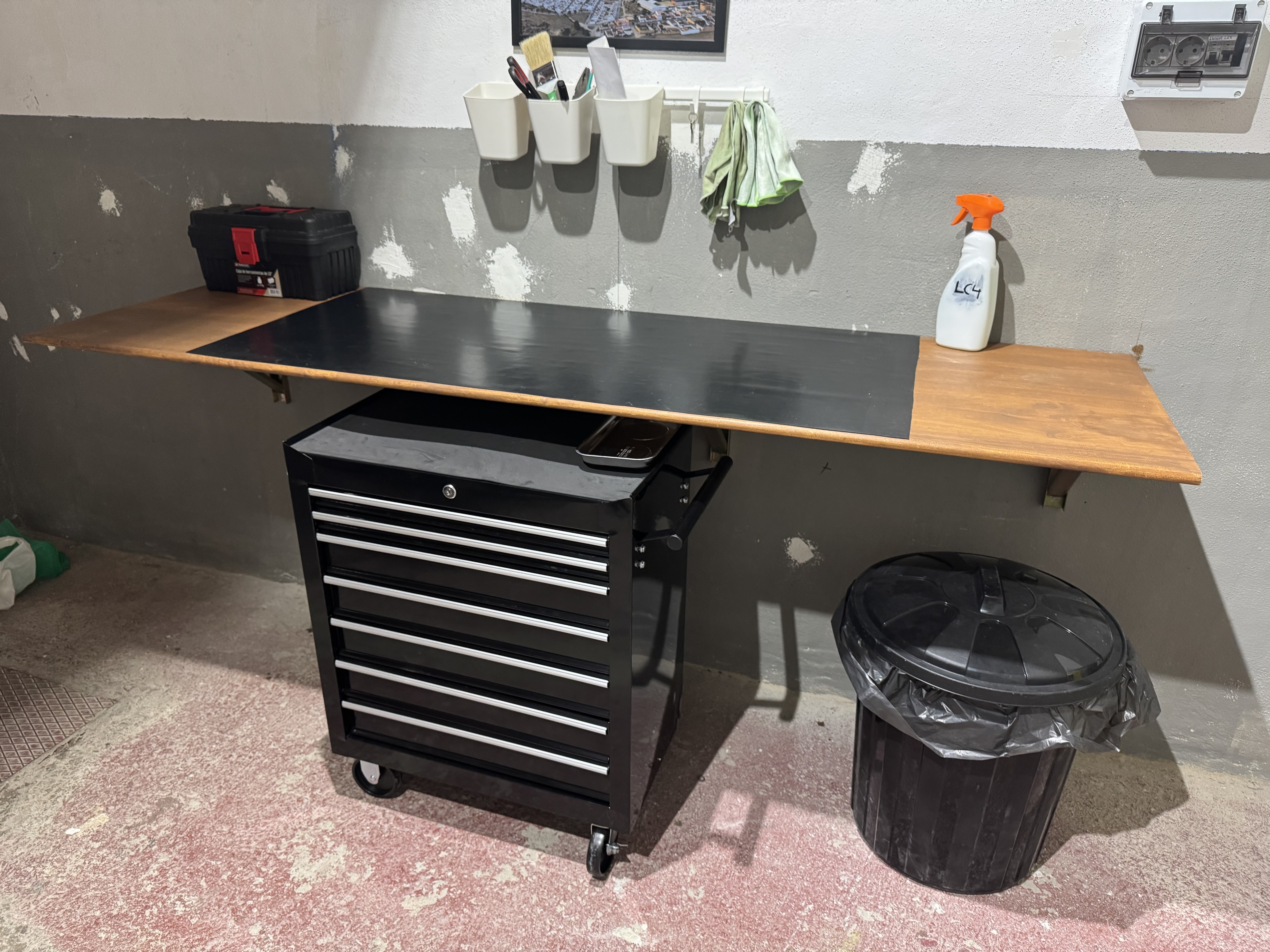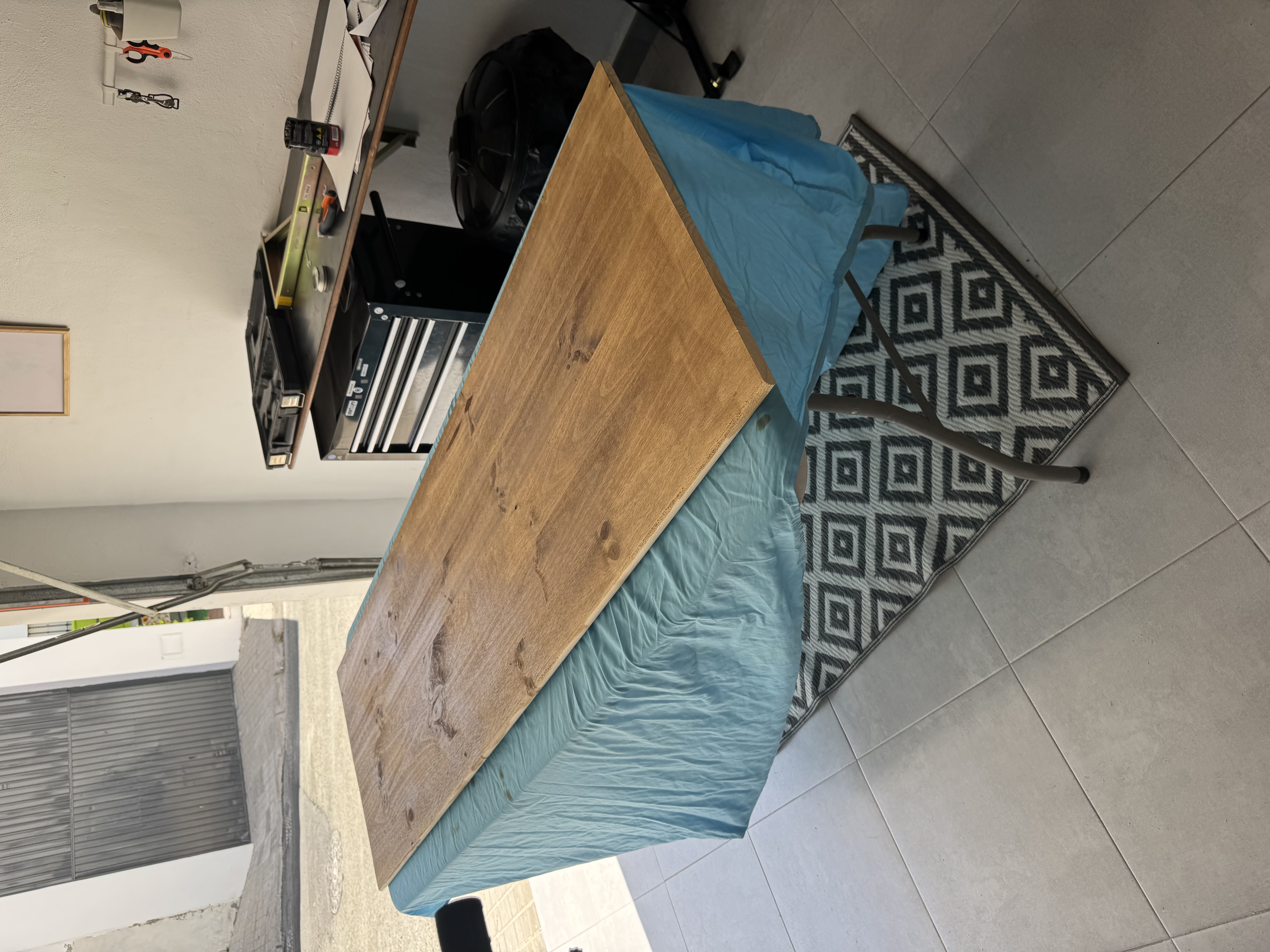 Puse cuatro escuadras y una tabla barnizada atornillada a la mesa, puse la mesa con escuadras por qué quería que hubiese hueco debajo para tener más espacio de almacenaje.