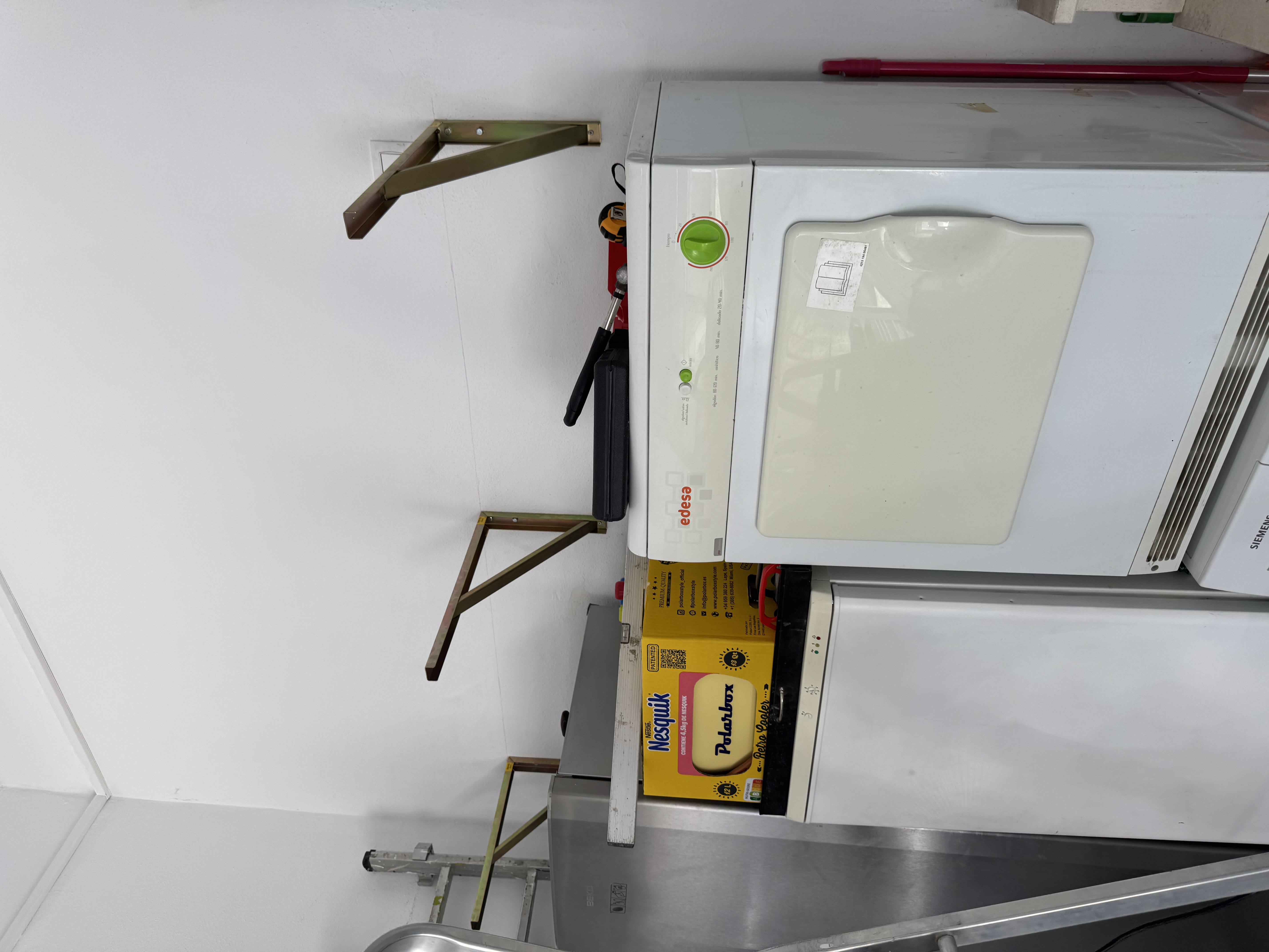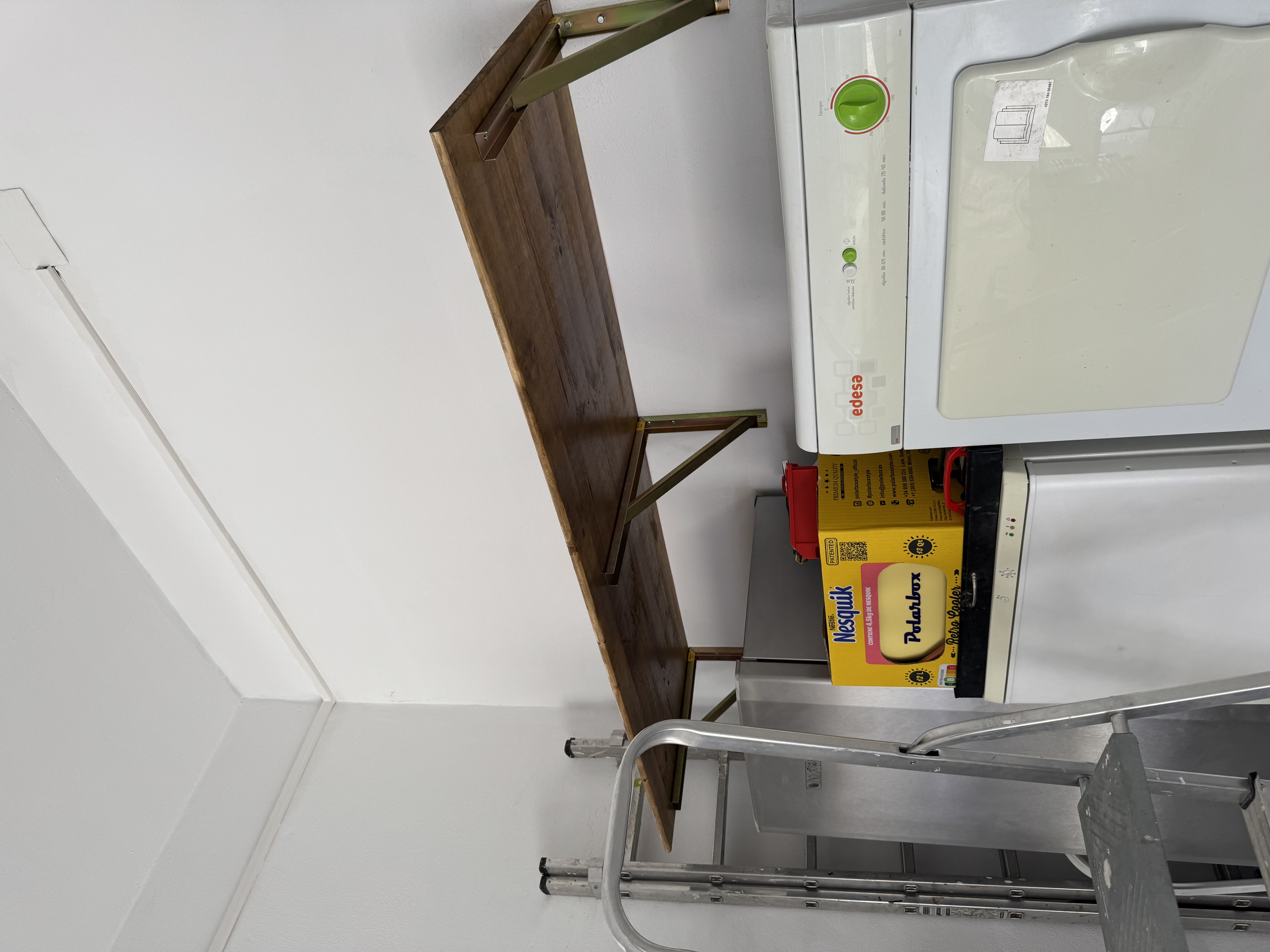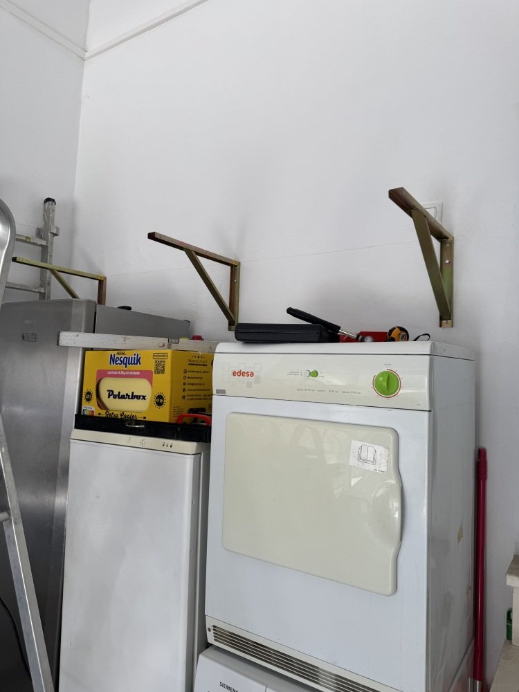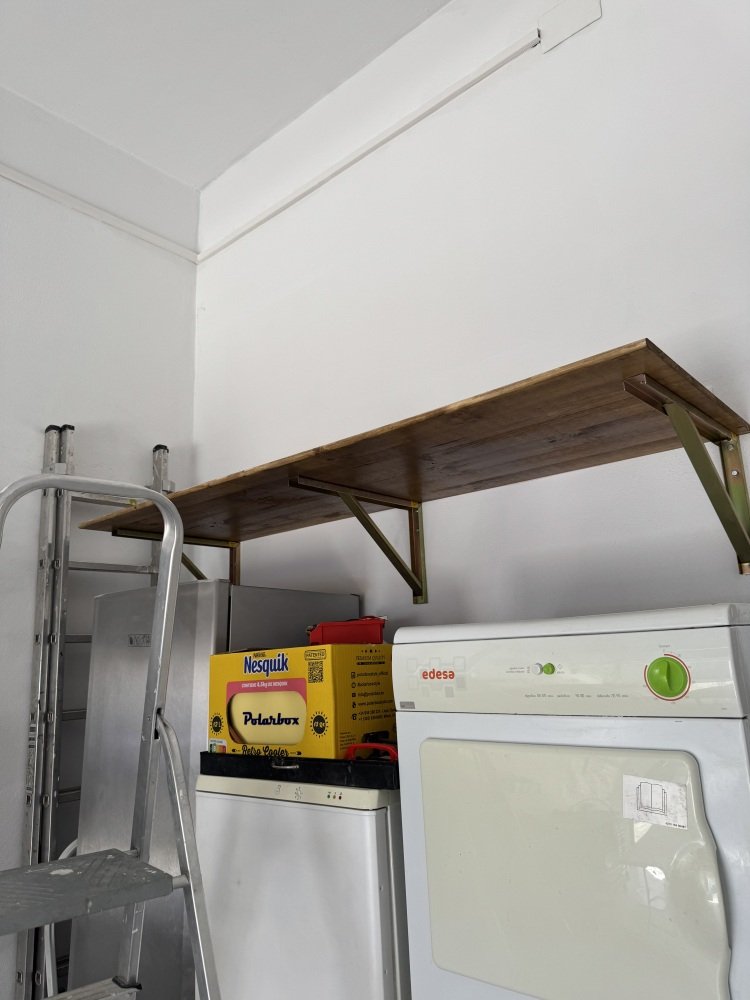 En este paso compré una estantería e hice otra para encima de las lavadoras y frigoríficos con tres escuadras y una tabla.