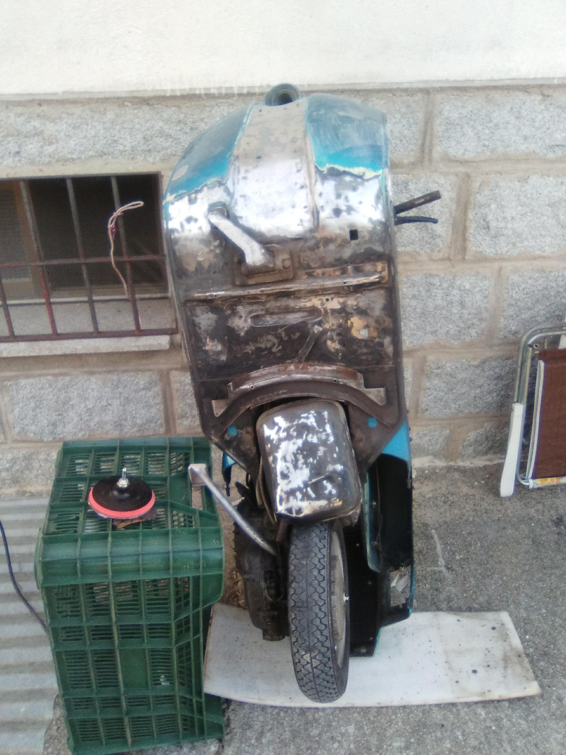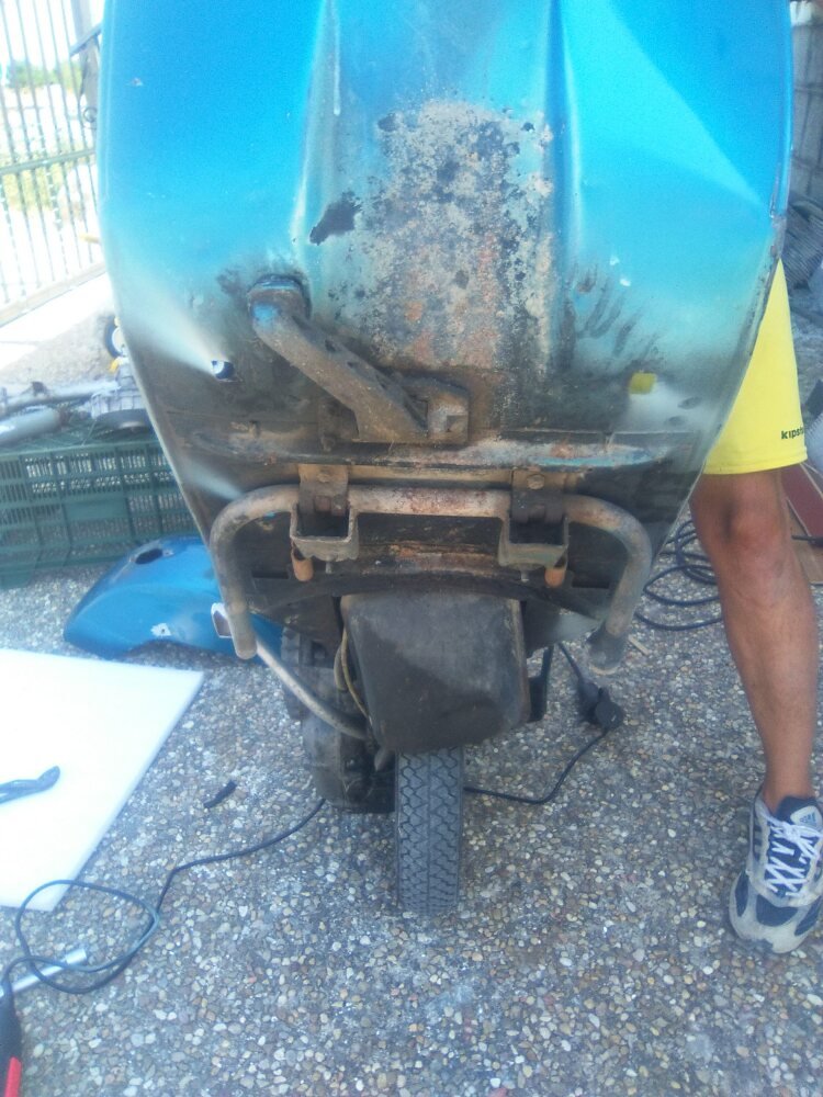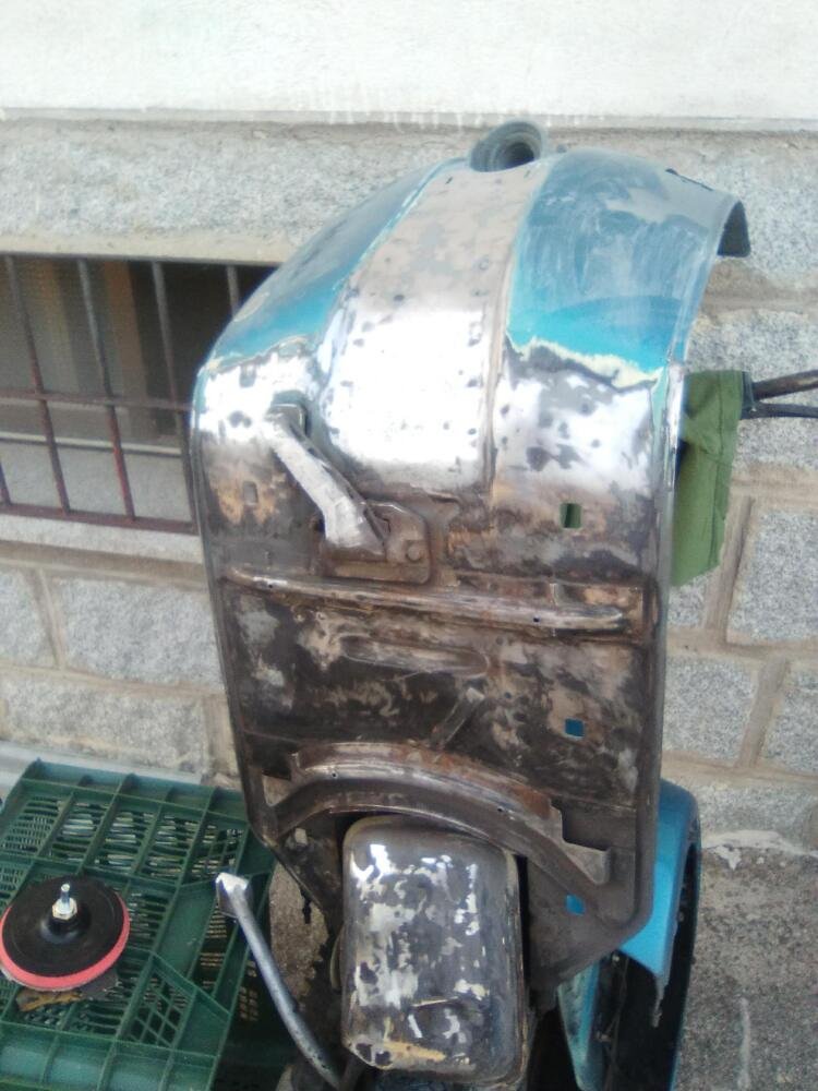 La tarea del lijado, especialmente de las partes menos visibles de la moto, fue lo más tedioso de todo el proceso. Es cierto que son partes ocultas, que no tienen que quedar perfectas, pero también son las más castigadas y las que mejor hay que proteger para que tengan una mayor durabilidad. En este apartado, quería mencionar el trabajo que se realizó en el hueco del motor y rueda de repuesto de la moto. Este hueco, con muchos recovecos supuso un buen esfuerzo puesto que muchas partes requerían un decapado o lijado a mano. El resto se hizo con taladro y cepillo de alambre, lo que permitía avanzar mucho más rápido.