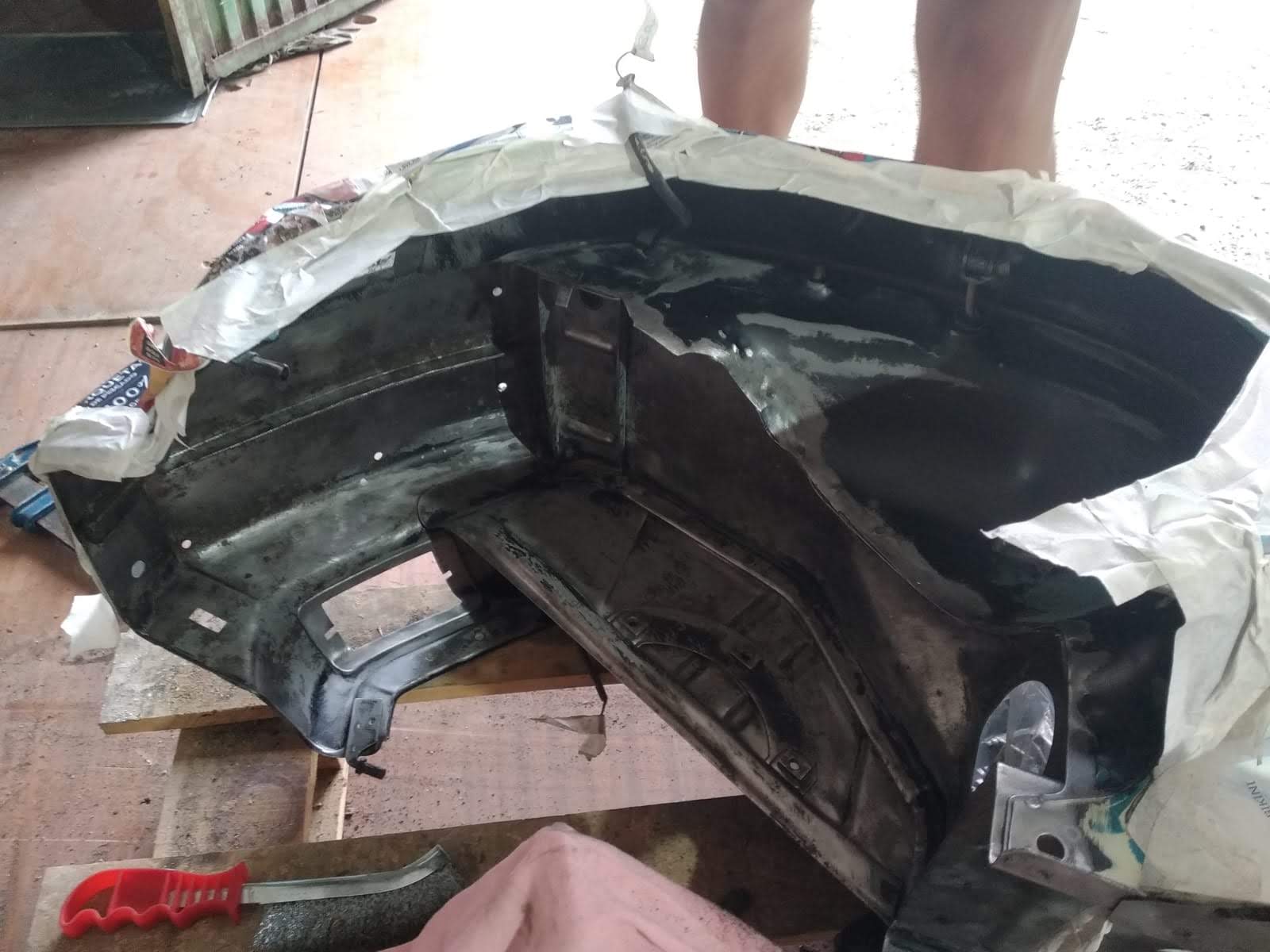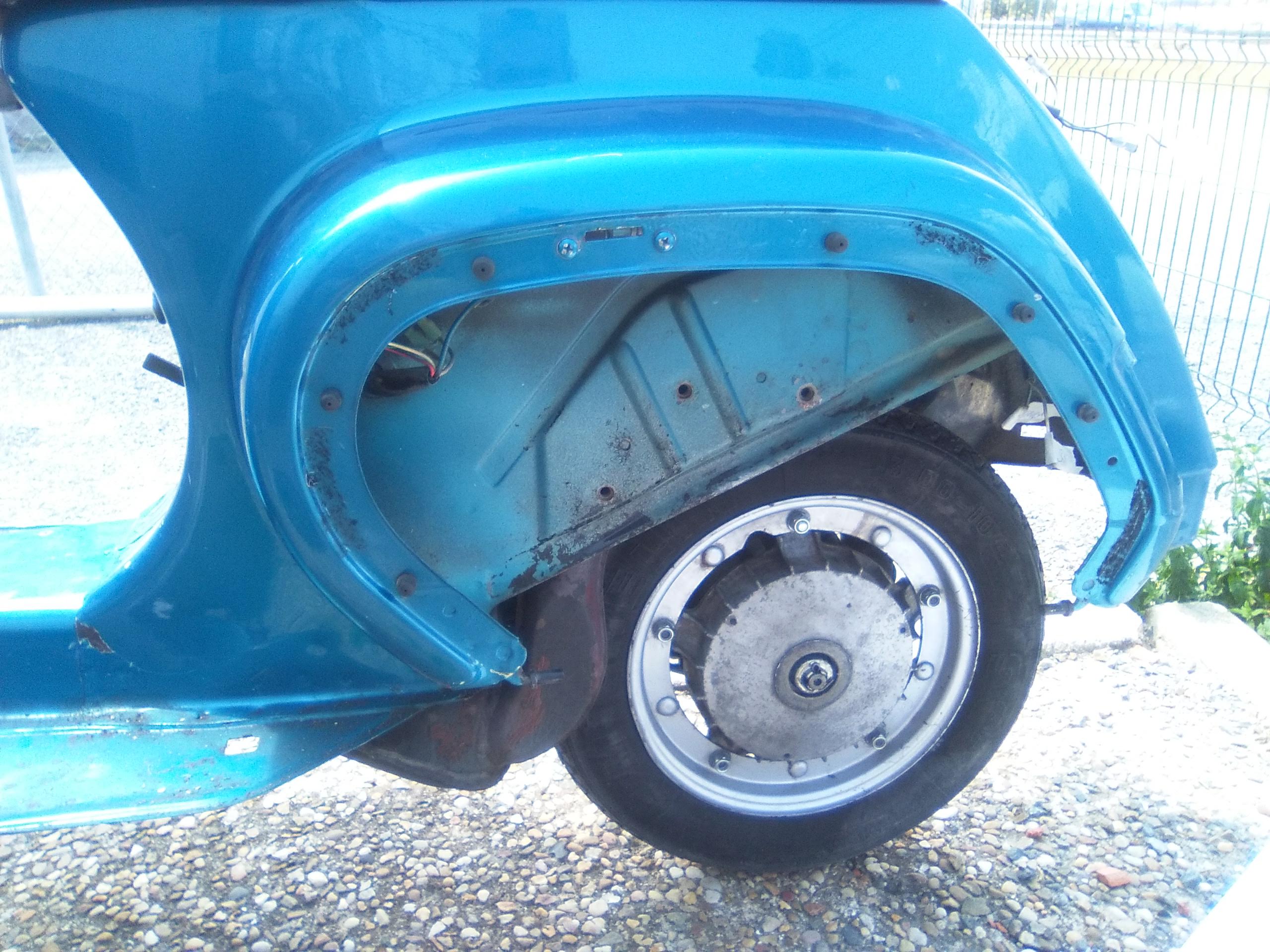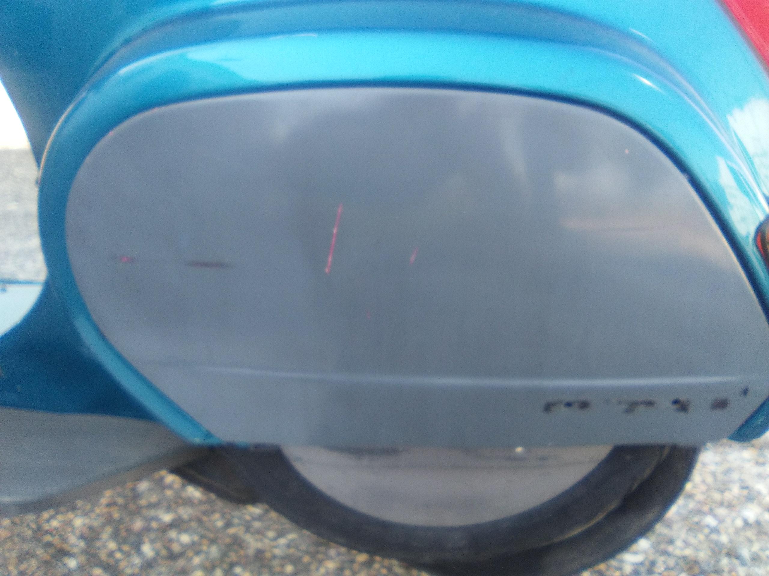 La tarea del lijado, especialmente de las partes menos visibles de la moto, fue lo más tedioso de todo el proceso. Es cierto que son partes ocultas, que no tienen que quedar perfectas, pero también son las más castigadas y las que mejor hay que proteger para que tengan una mayor durabilidad. En este apartado, quería mencionar el trabajo que se realizó en el hueco del motor y rueda de repuesto de la moto. Este hueco, con muchos recovecos supuso un buen esfuerzo puesto que muchas partes requerían un decapado o lijado a mano. El resto se hizo con taladro y cepillo de alambre, lo que permitía avanzar mucho más rápido.