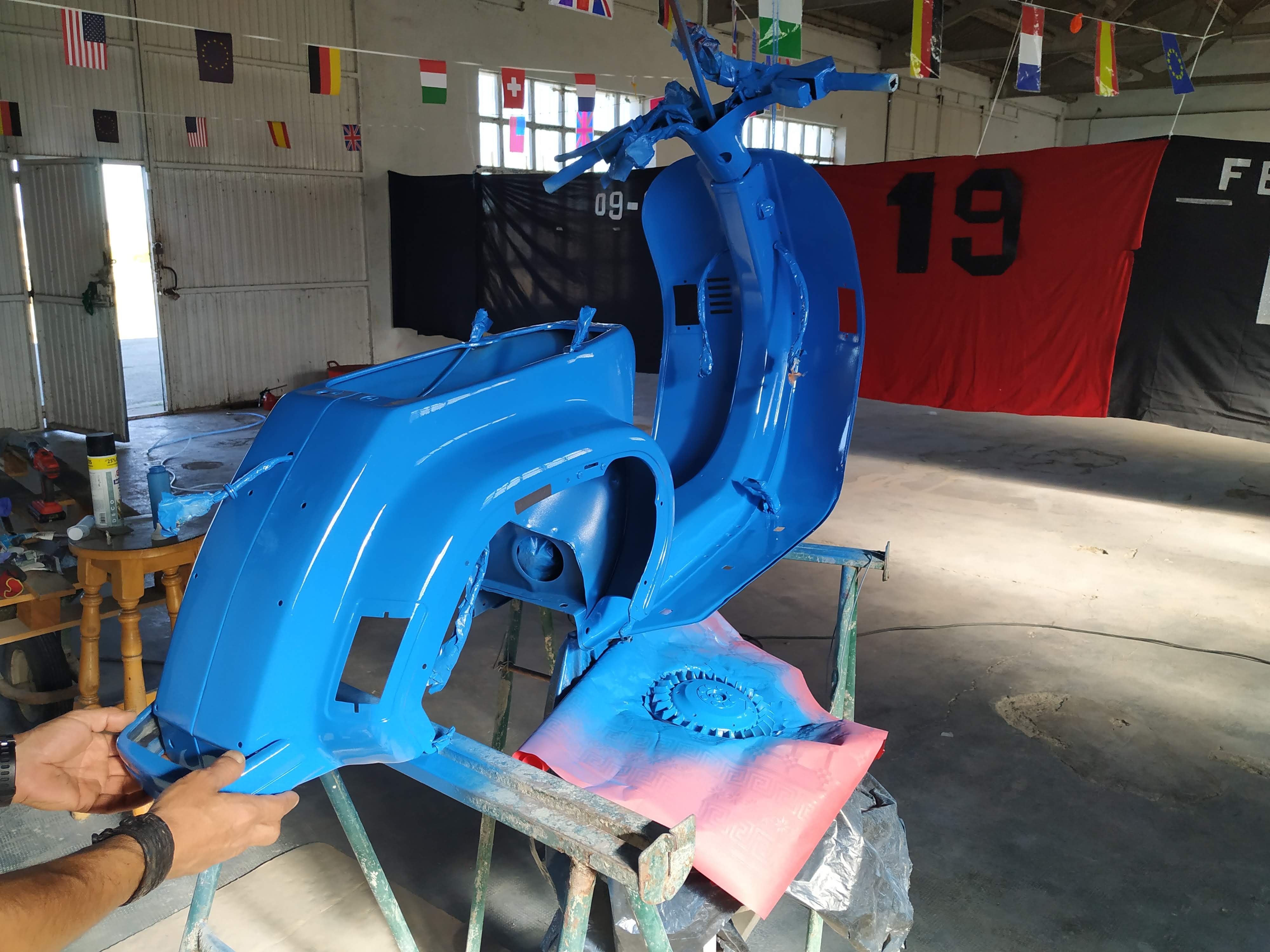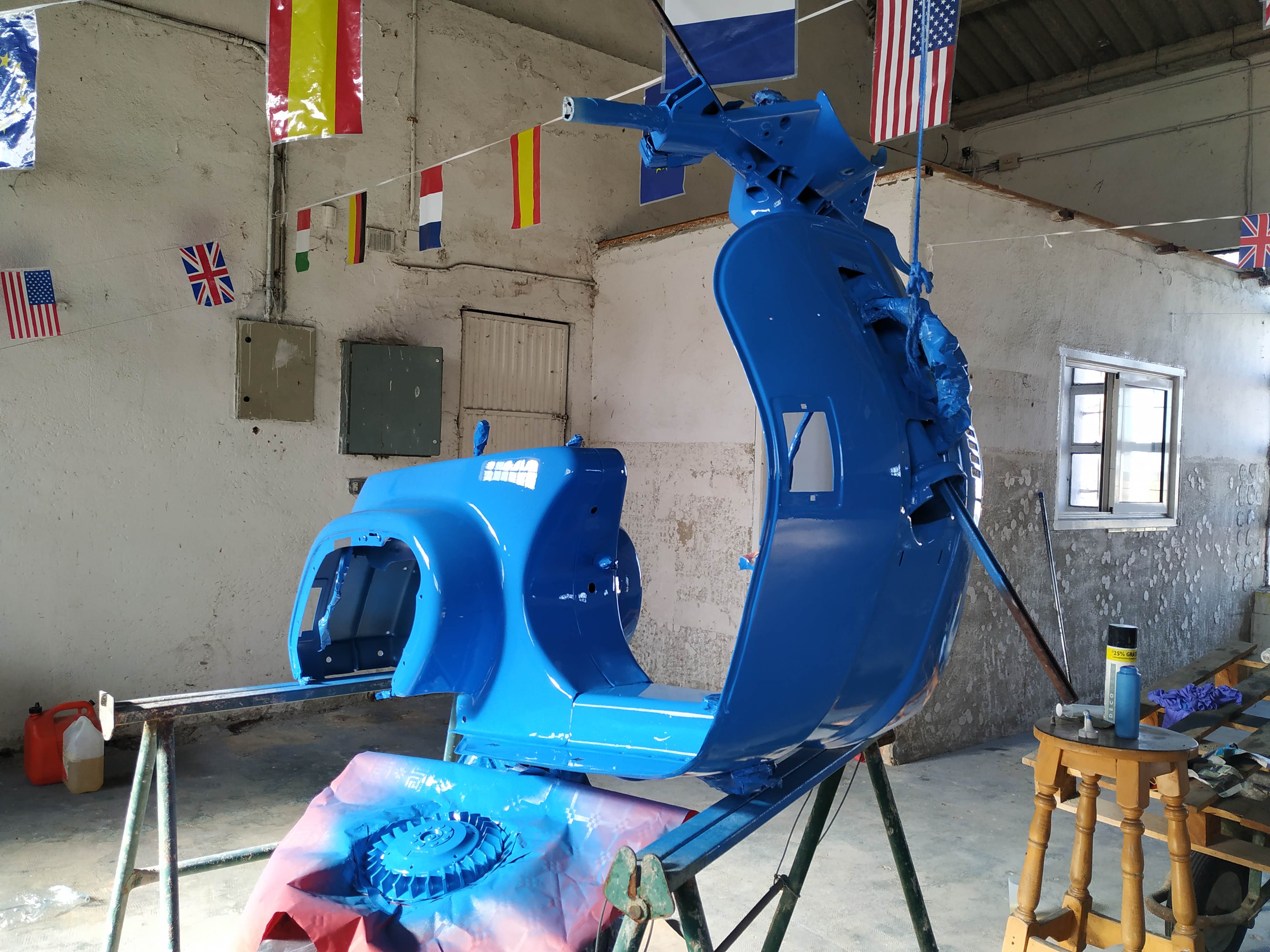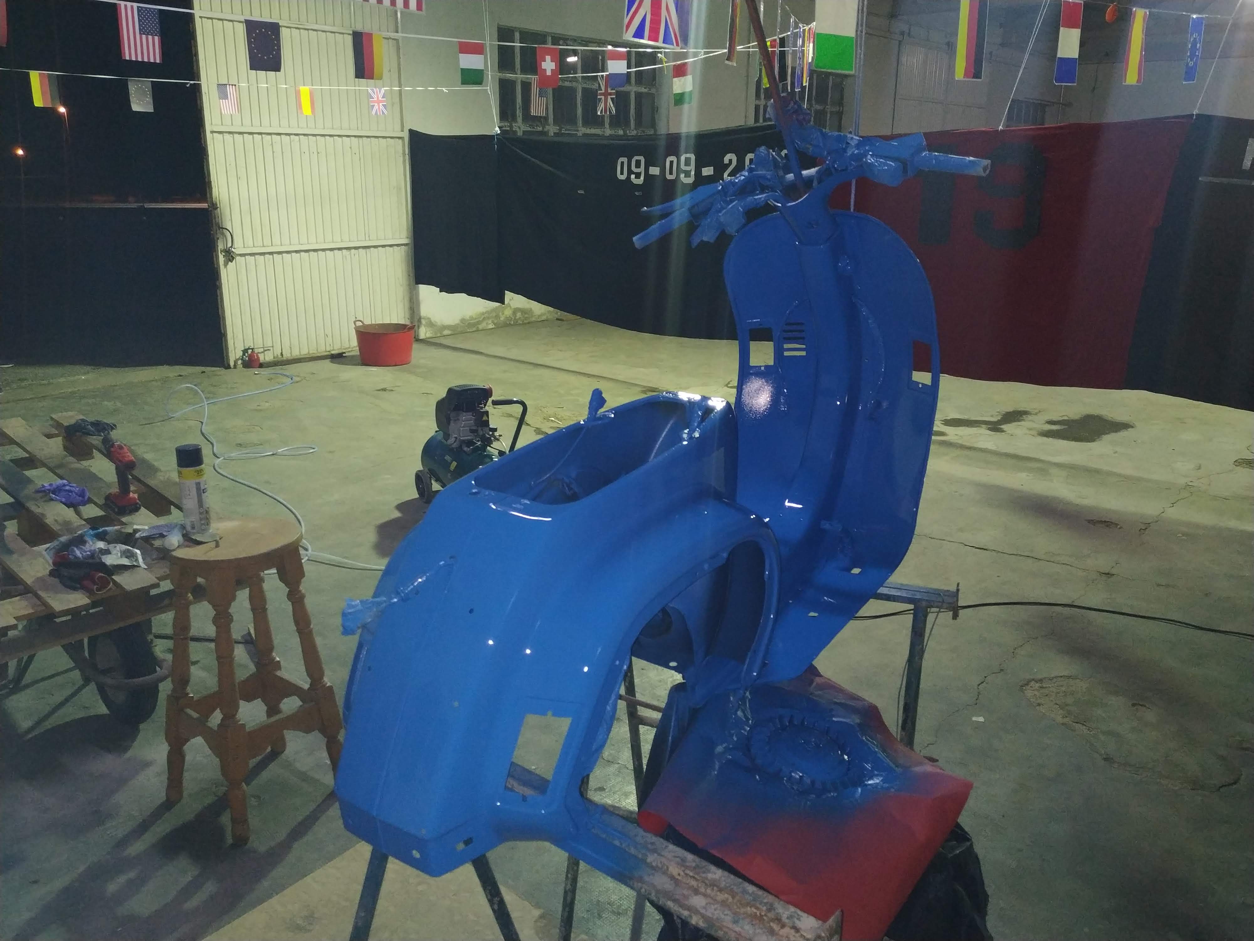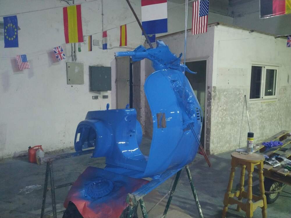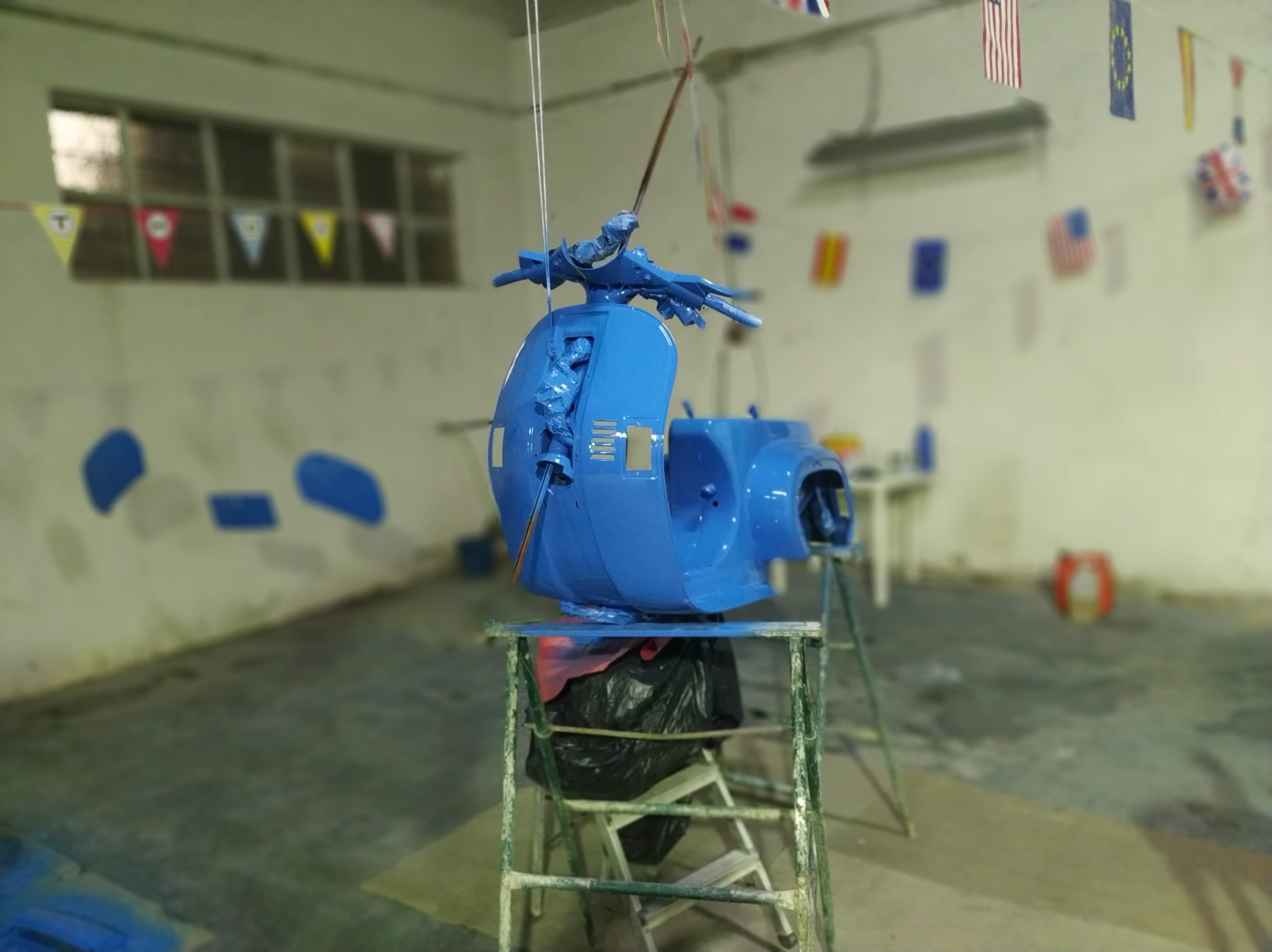 Después de todos estos trabajos, llegó lo más importante del tema: la pintura. Siempre me había llamado la atención el azul intenso y me parecía que quedaba muy llamativo en una vespa, la moto más personalizada del mundo. Con ella ya lijada al completo, masilla puesta en aquellas imperfecciones que no se podían sacar, fue el momento de colocar la moto en la postura más cómoda para pintar: colgada de la parte delantera y apoyada de la parte trasera. Después de la imprimación y dos capas de pintura, el trabajo iba viendo la luz. Al día siguiente la moto se bajó a una superficie segura (podéis imaginar que la forma de colgarla y sujetarla no era la más profesional) y se dejó curar la pintura una semana completa.