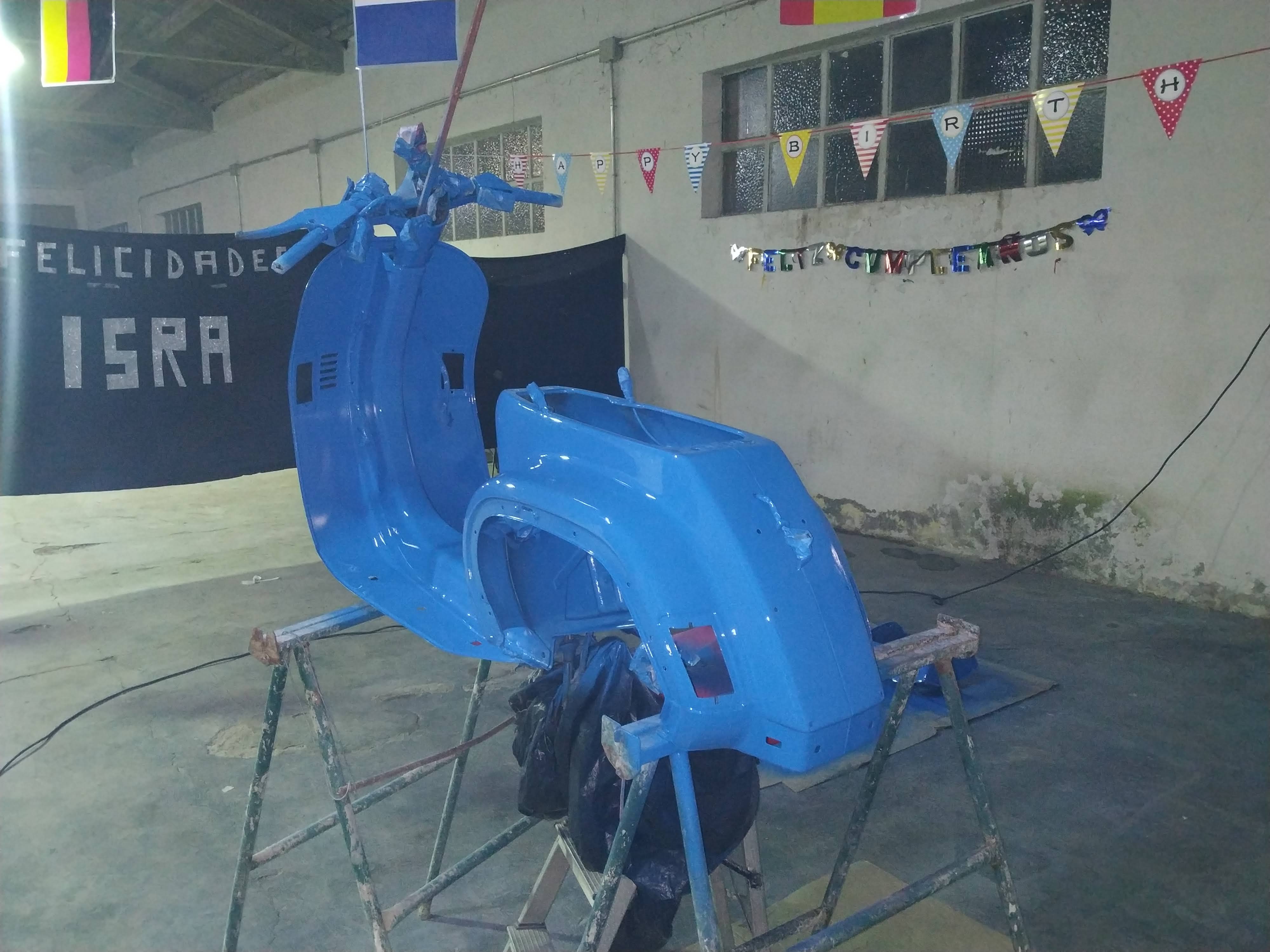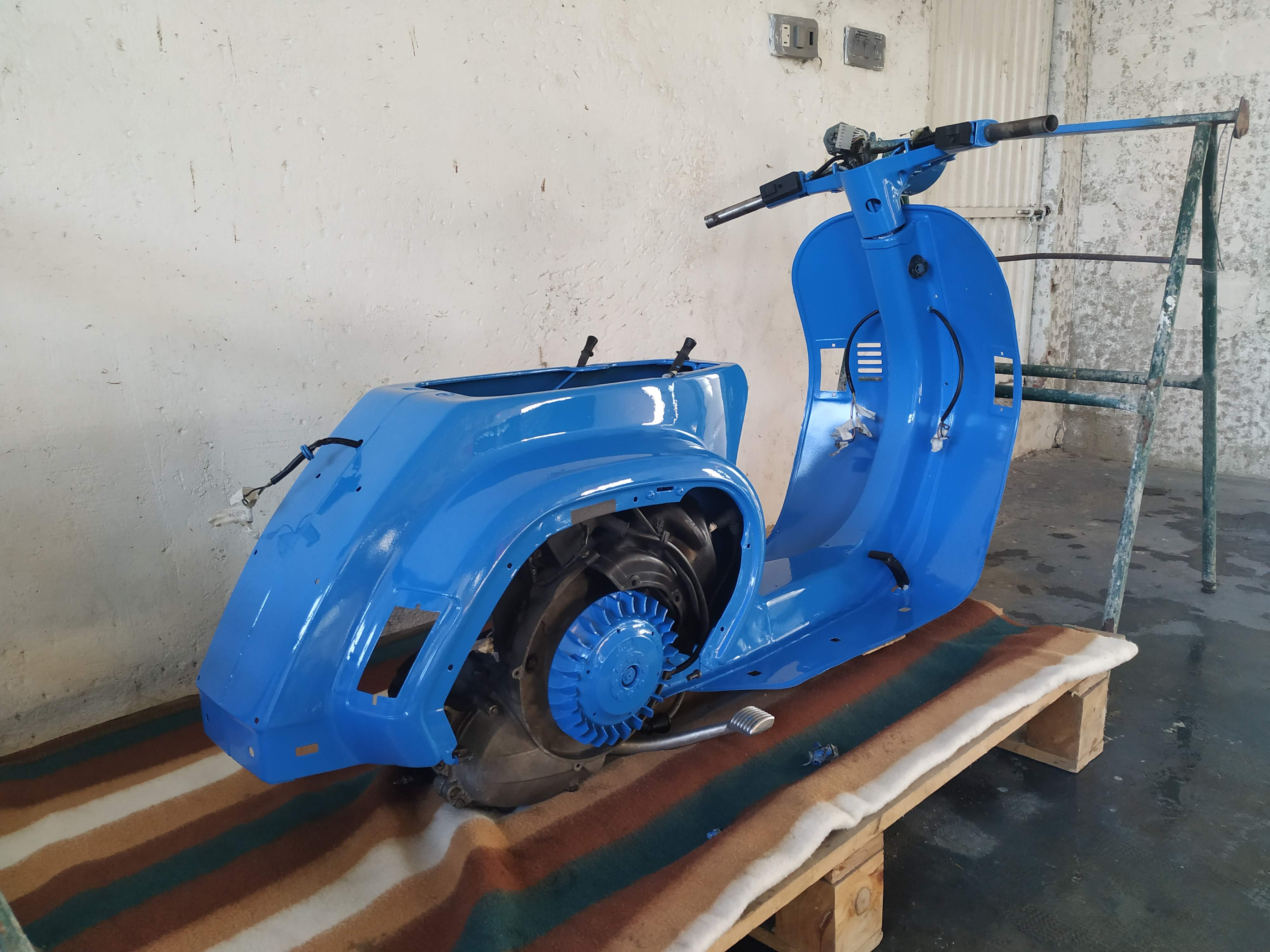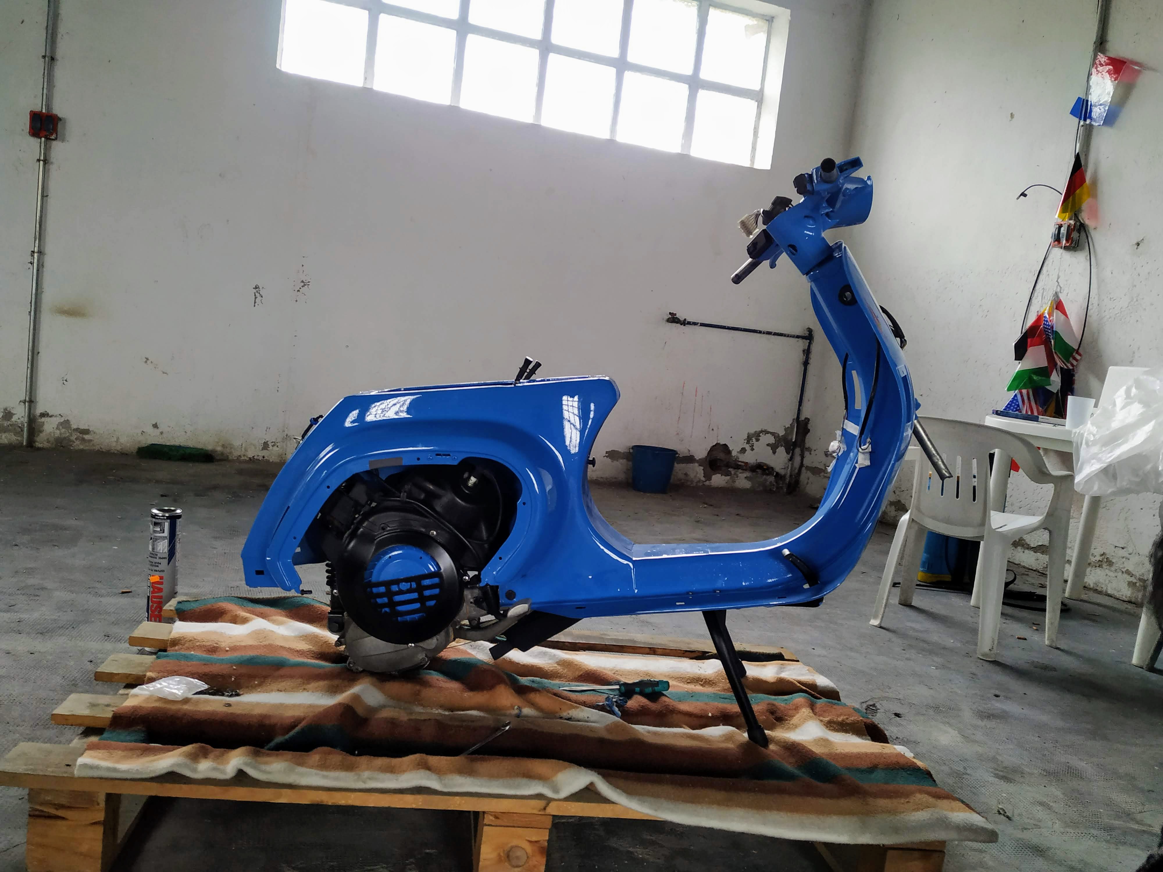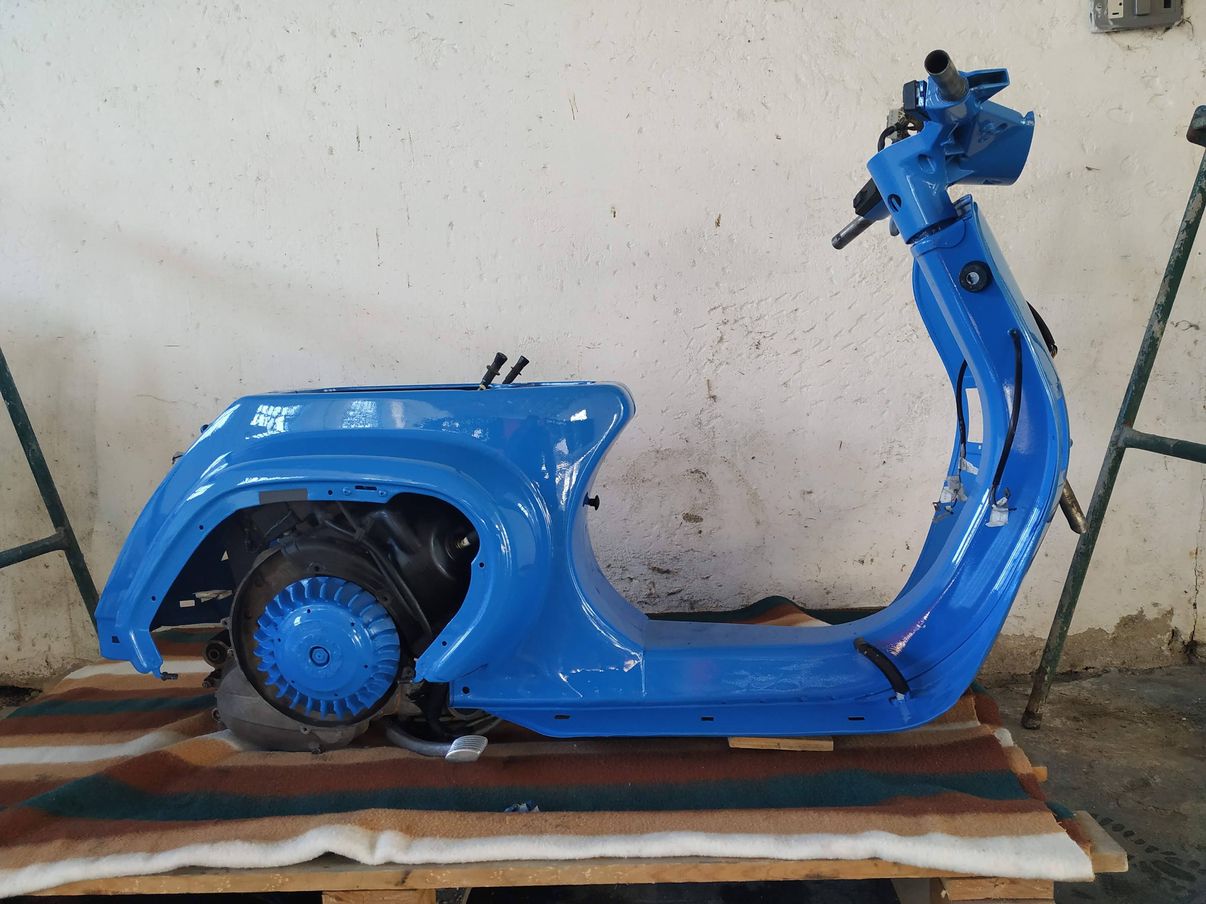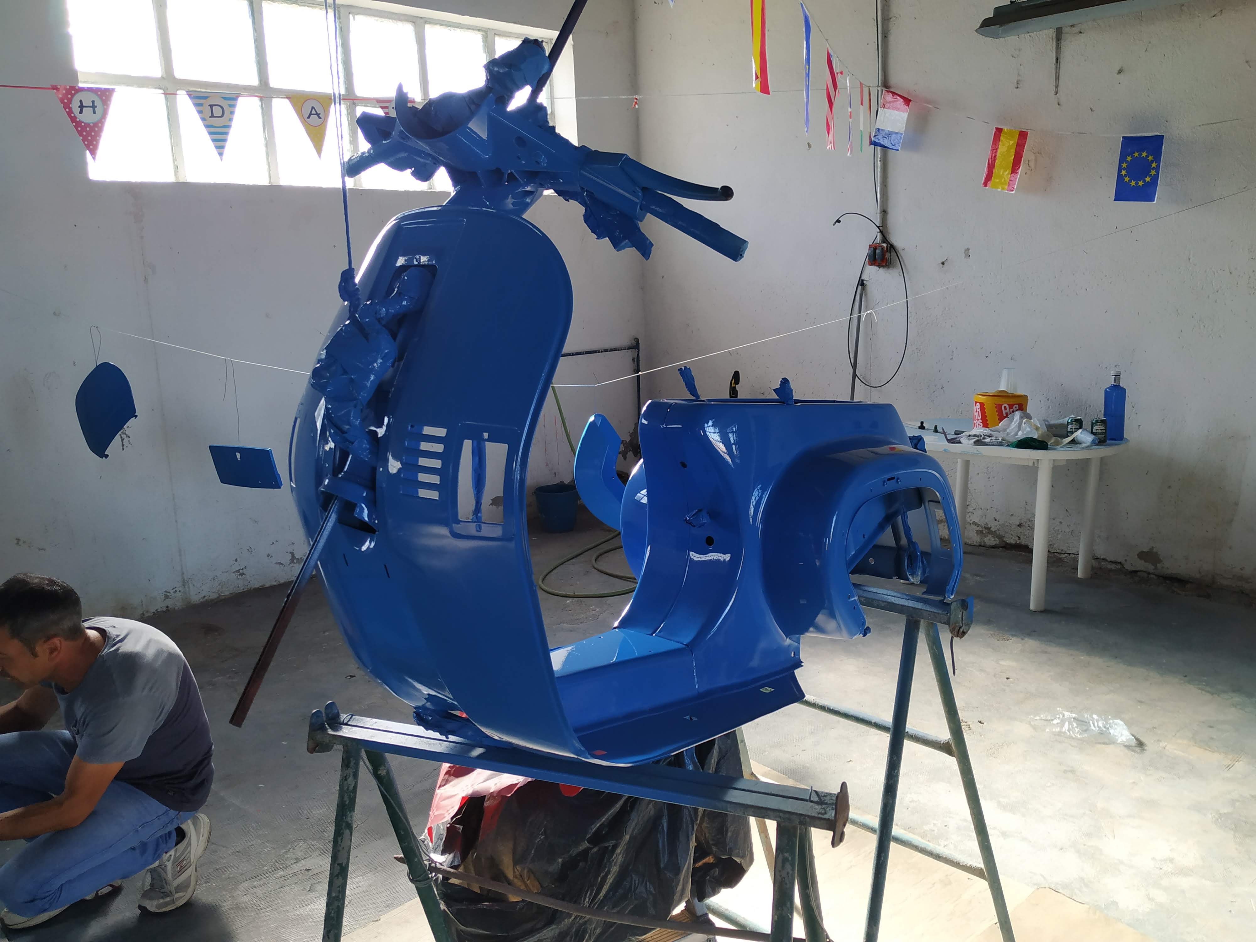 Después de todos estos trabajos, llegó lo más importante del tema: la pintura. Siempre me había llamado la atención el azul intenso y me parecía que quedaba muy llamativo en una vespa, la moto más personalizada del mundo. Con ella ya lijada al completo, masilla puesta en aquellas imperfecciones que no se podían sacar, fue el momento de colocar la moto en la postura más cómoda para pintar: colgada de la parte delantera y apoyada de la parte trasera. Después de la imprimación y dos capas de pintura, el trabajo iba viendo la luz. Al día siguiente la moto se bajó a una superficie segura (podéis imaginar que la forma de colgarla y sujetarla no era la más profesional) y se dejó curar la pintura una semana completa.