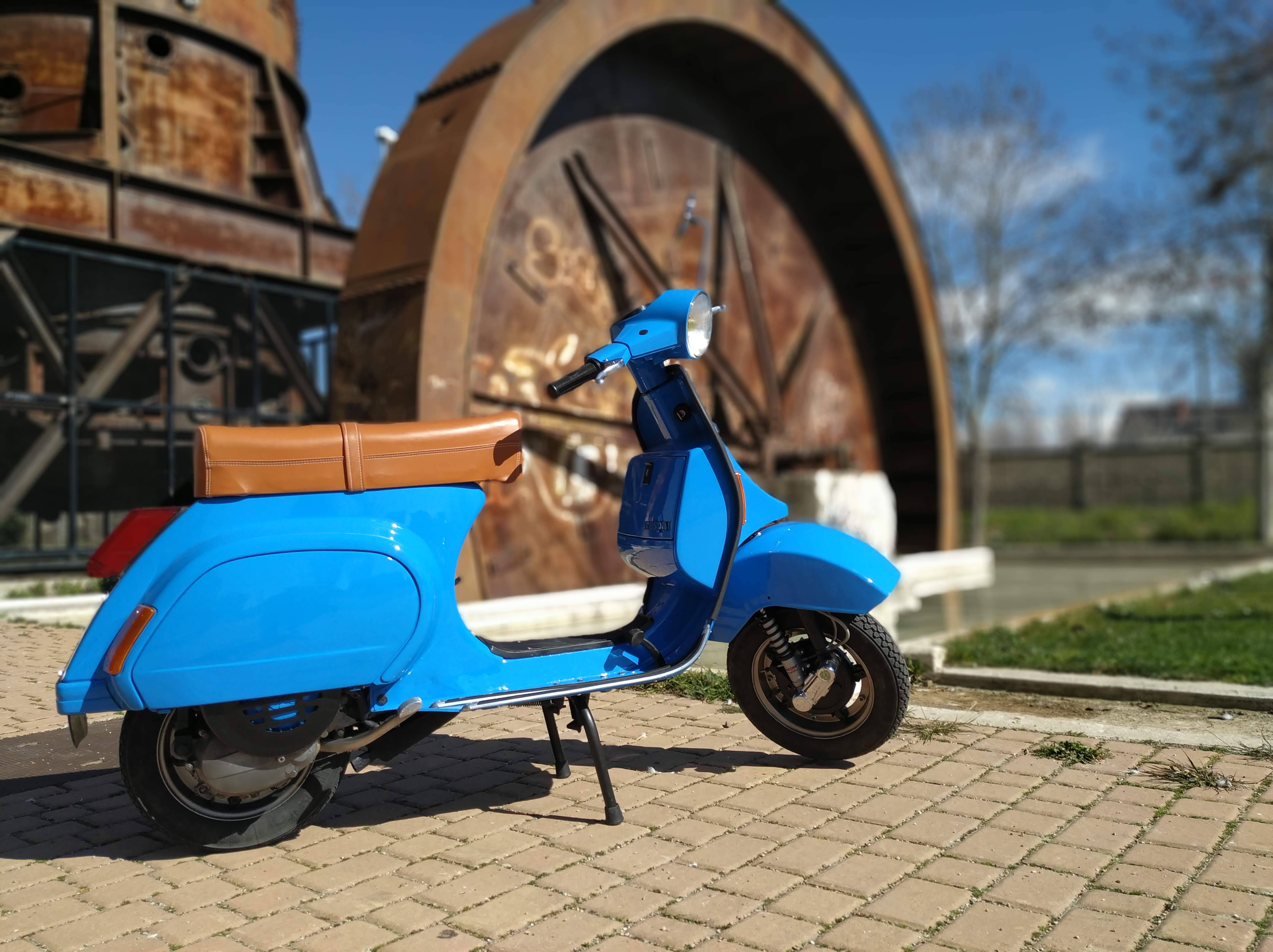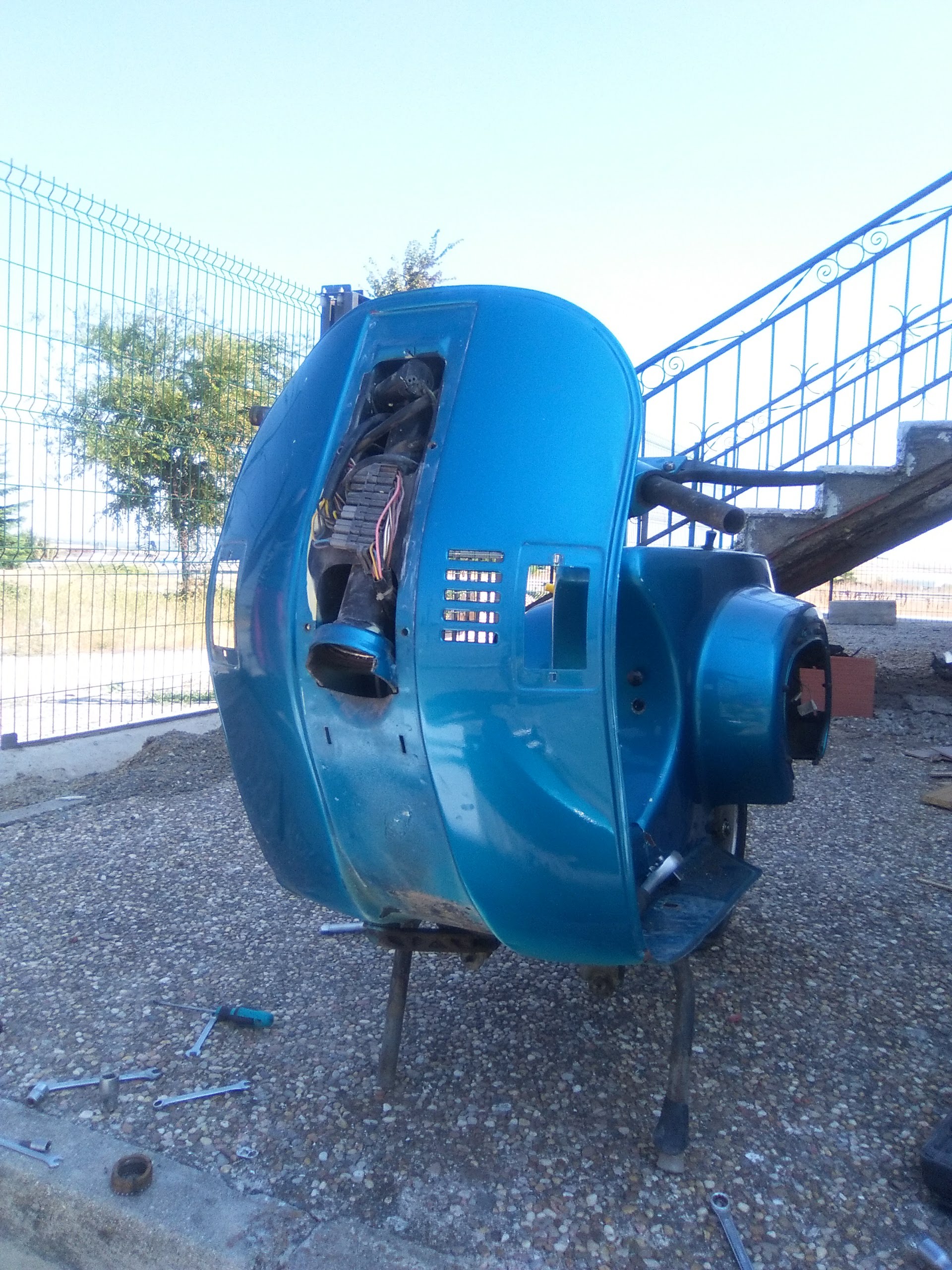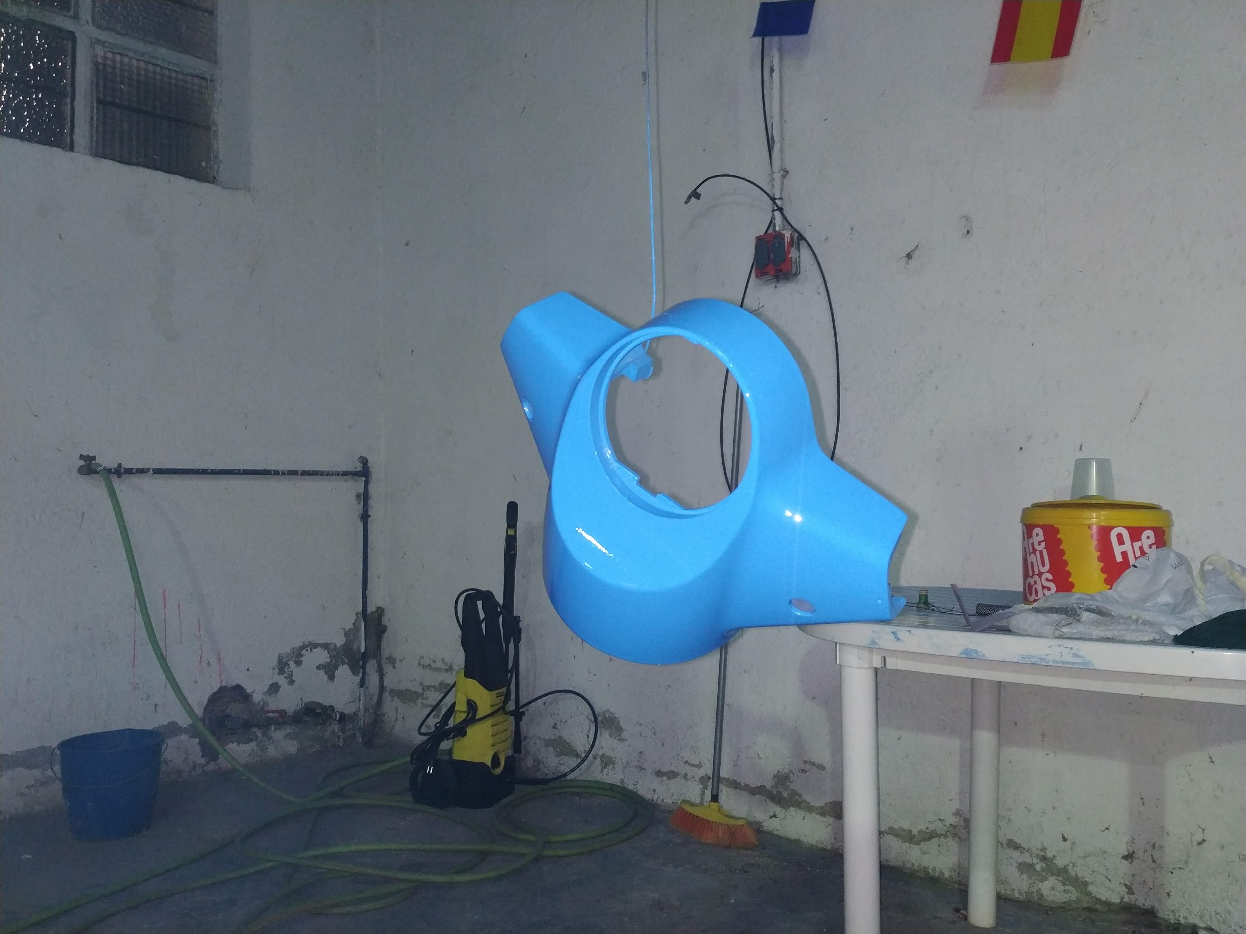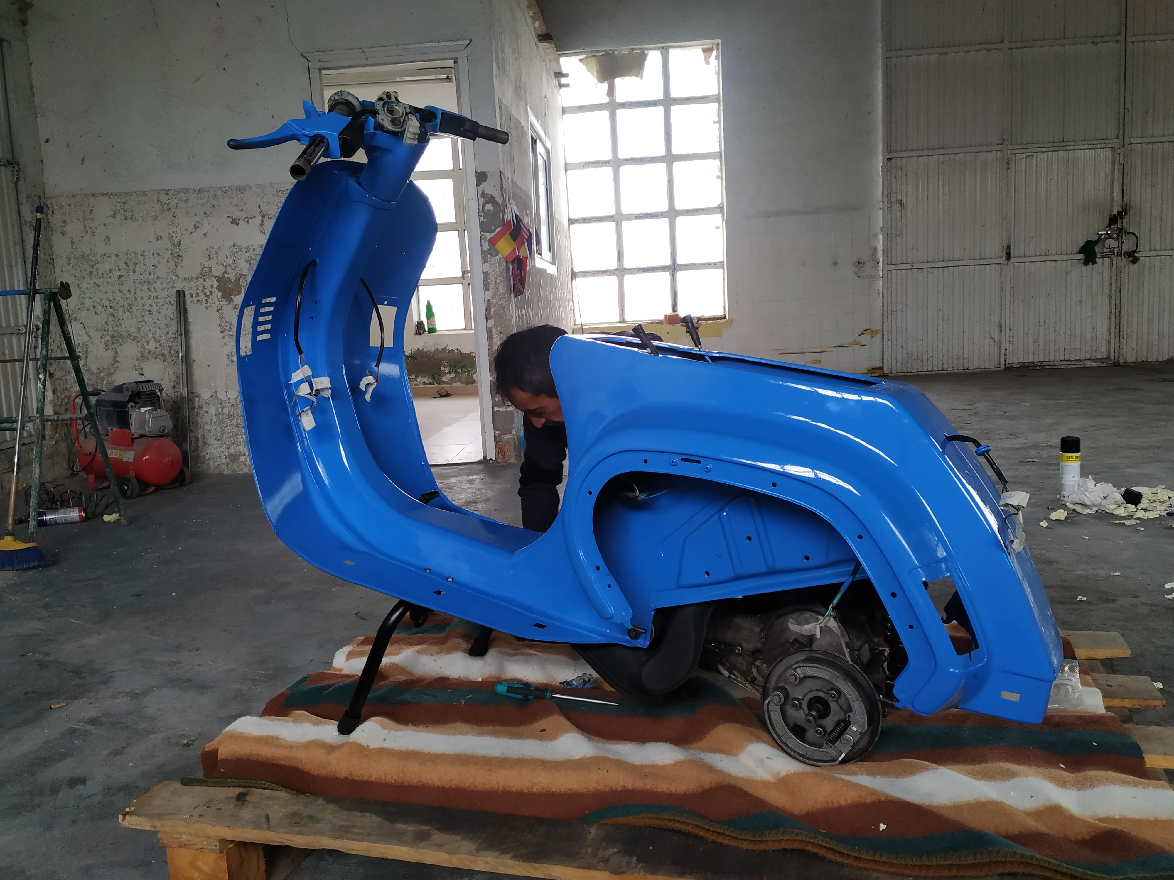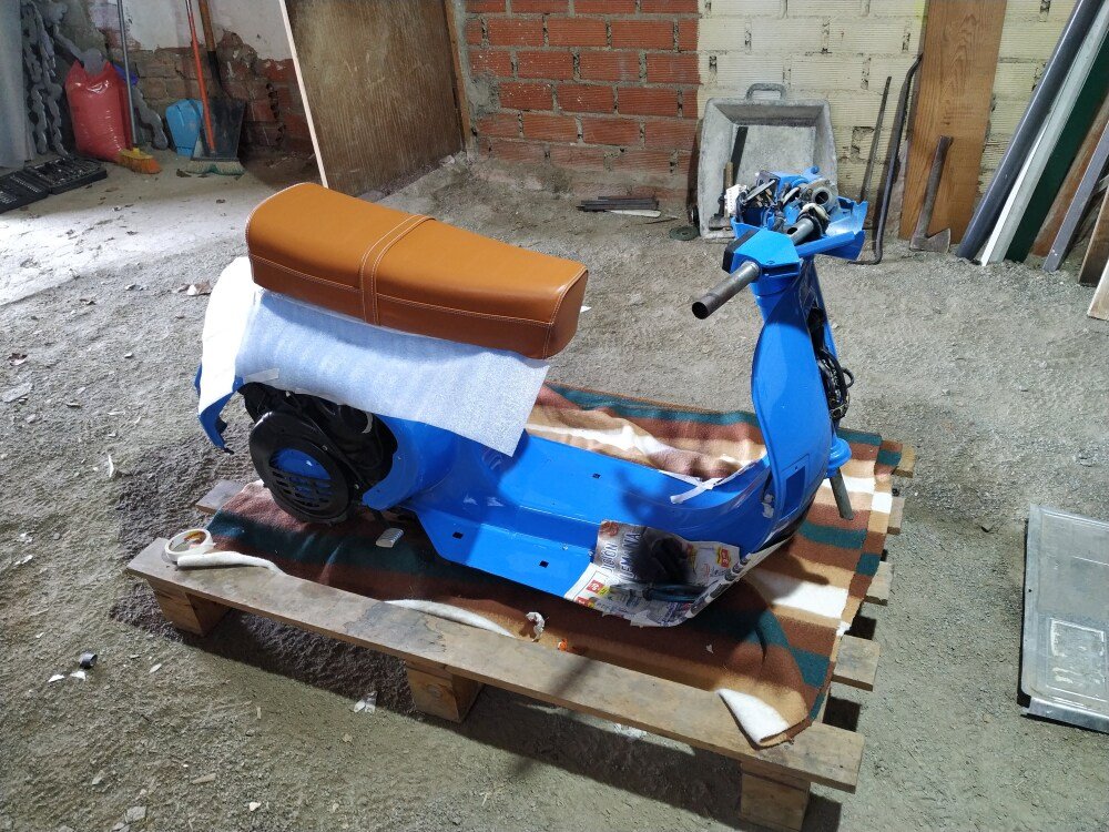 Después de todos estos trabajos, llegó lo más importante del tema: la pintura. Siempre me había llamado la atención el azul intenso y me parecía que quedaba muy llamativo en una vespa, la moto más personalizada del mundo. Con ella ya lijada al completo, masilla puesta en aquellas imperfecciones que no se podían sacar, fue el momento de colocar la moto en la postura más cómoda para pintar: colgada de la parte delantera y apoyada de la parte trasera. Después de la imprimación y dos capas de pintura, el trabajo iba viendo la luz. Al día siguiente la moto se bajó a una superficie segura (podéis imaginar que la forma de colgarla y sujetarla no era la más profesional) y se dejó curar la pintura una semana completa.