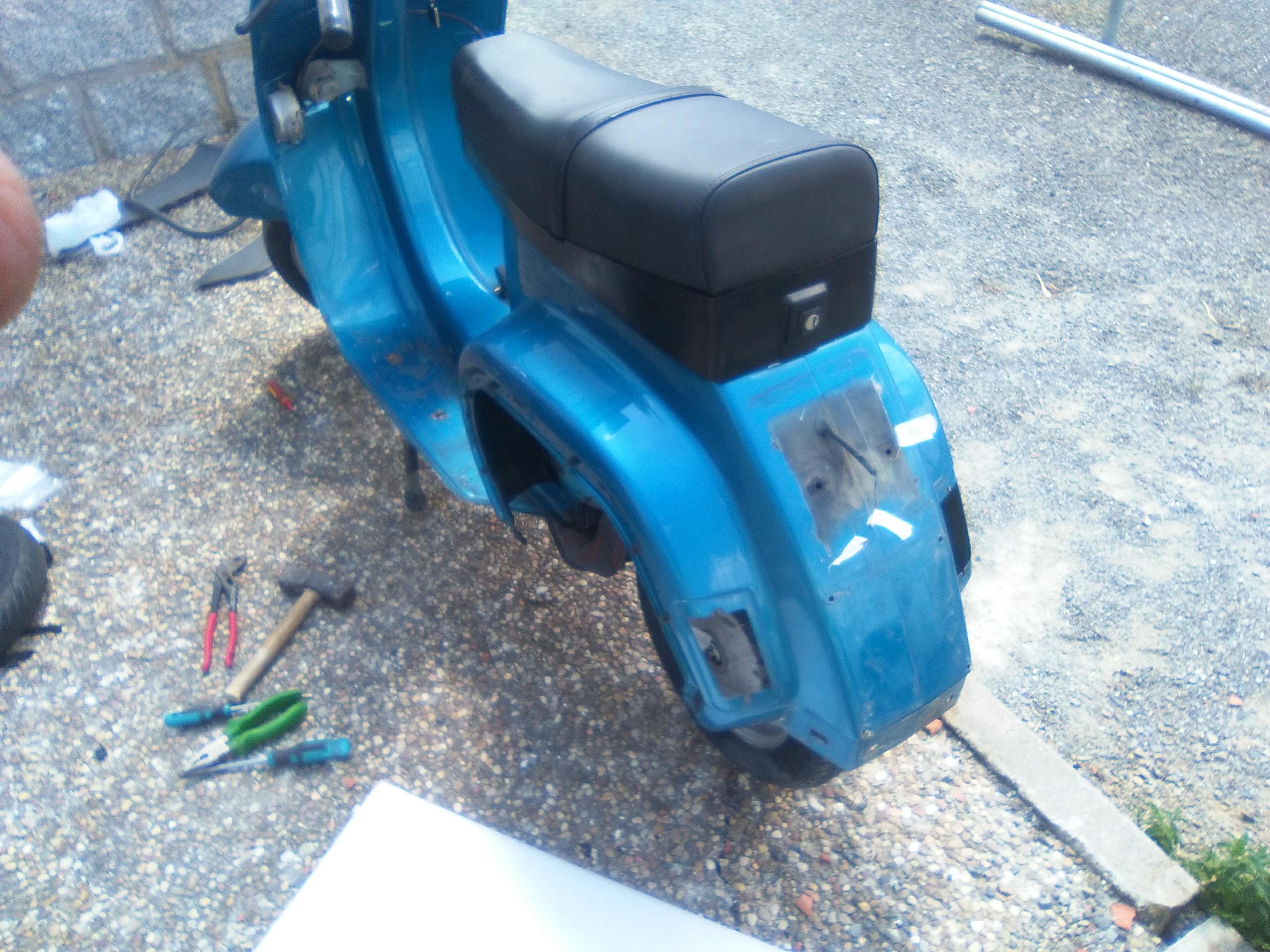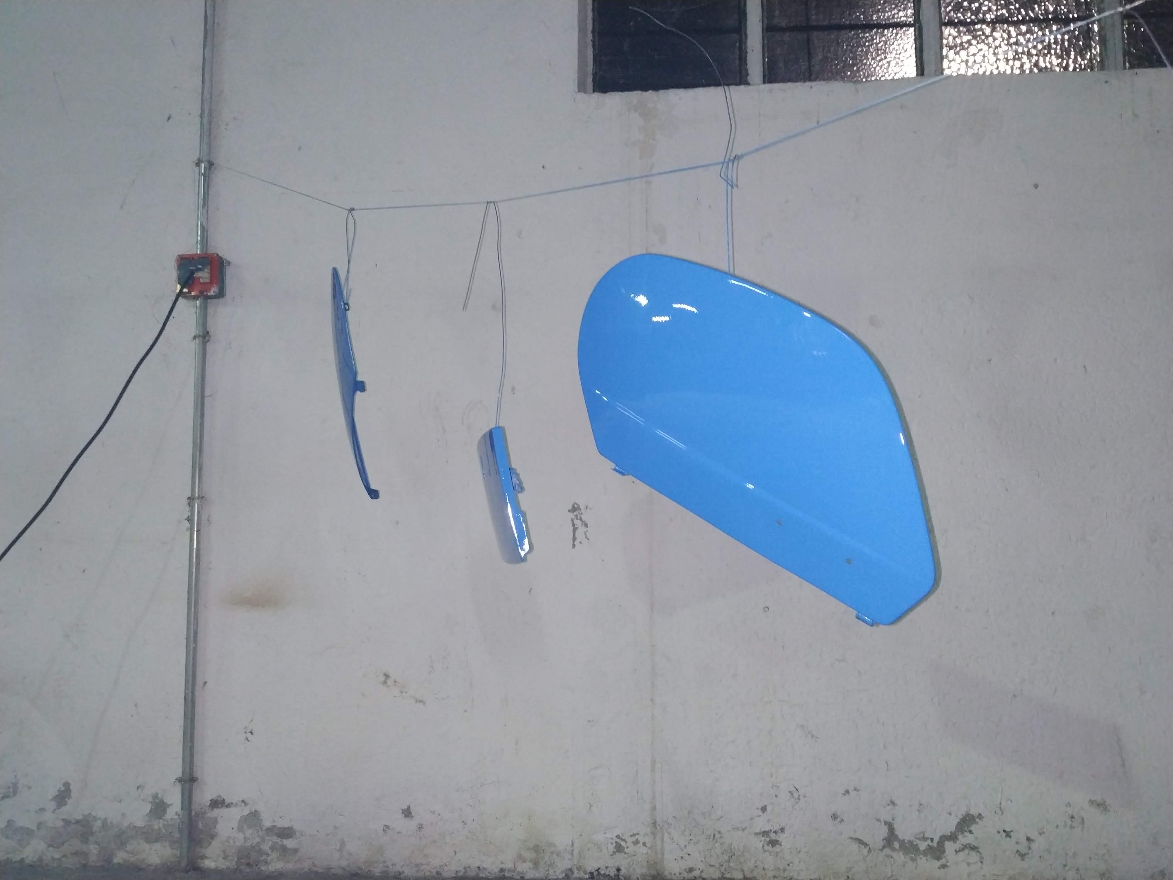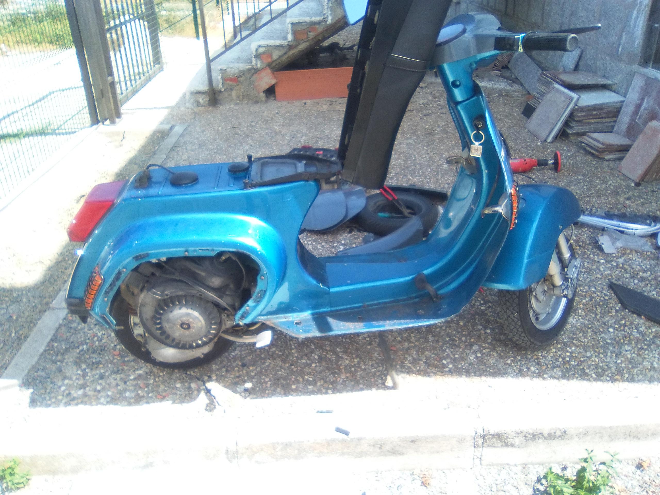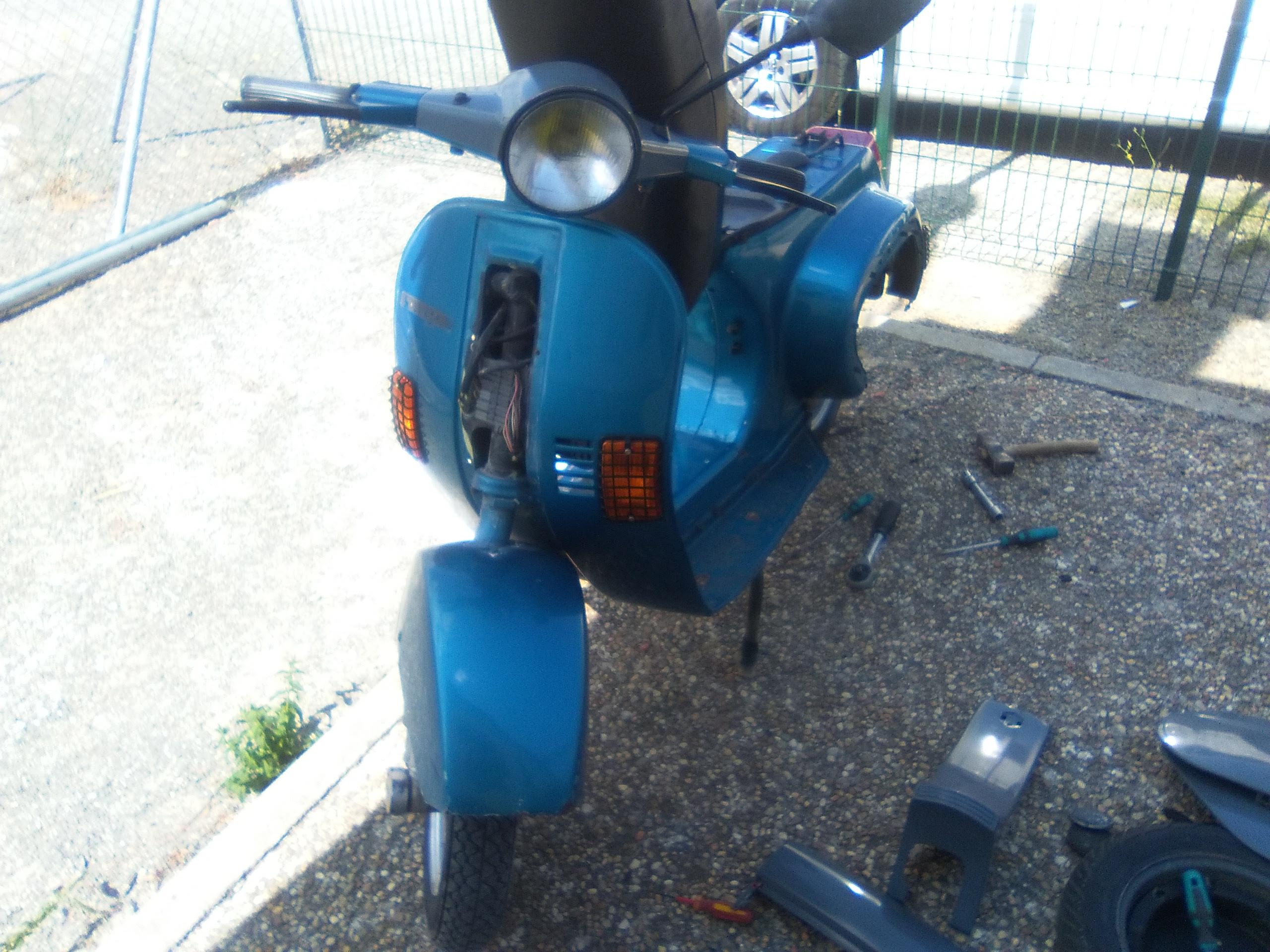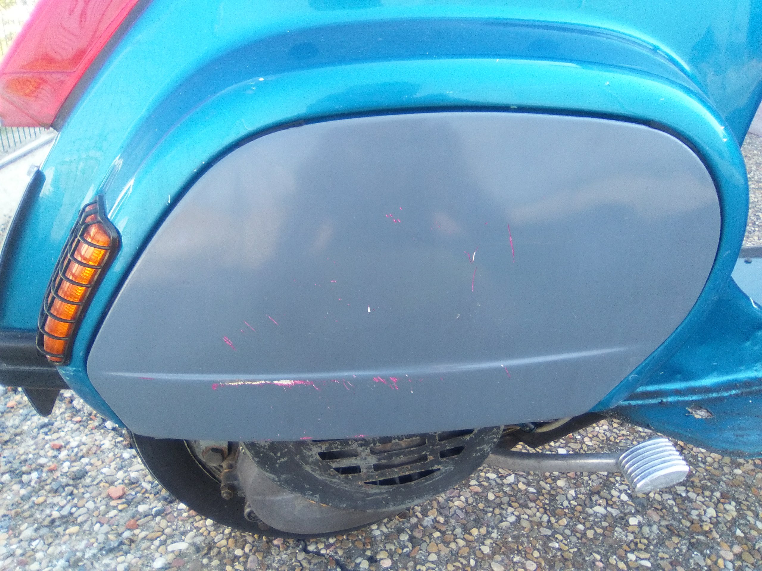 Después de todos estos trabajos, llegó lo más importante del tema: la pintura. Siempre me había llamado la atención el azul intenso y me parecía que quedaba muy llamativo en una vespa, la moto más personalizada del mundo. Con ella ya lijada al completo, masilla puesta en aquellas imperfecciones que no se podían sacar, fue el momento de colocar la moto en la postura más cómoda para pintar: colgada de la parte delantera y apoyada de la parte trasera. Después de la imprimación y dos capas de pintura, el trabajo iba viendo la luz. Al día siguiente la moto se bajó a una superficie segura (podéis imaginar que la forma de colgarla y sujetarla no era la más profesional) y se dejó curar la pintura una semana completa.