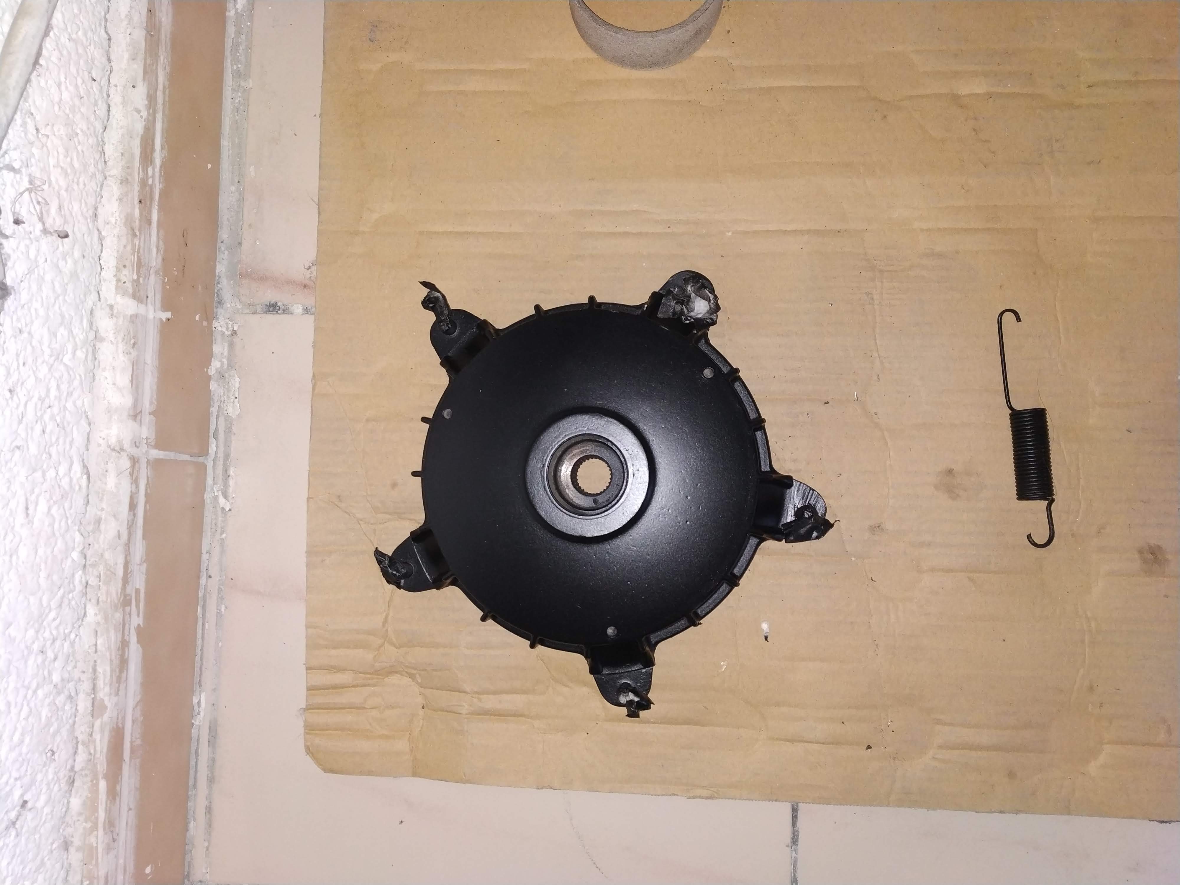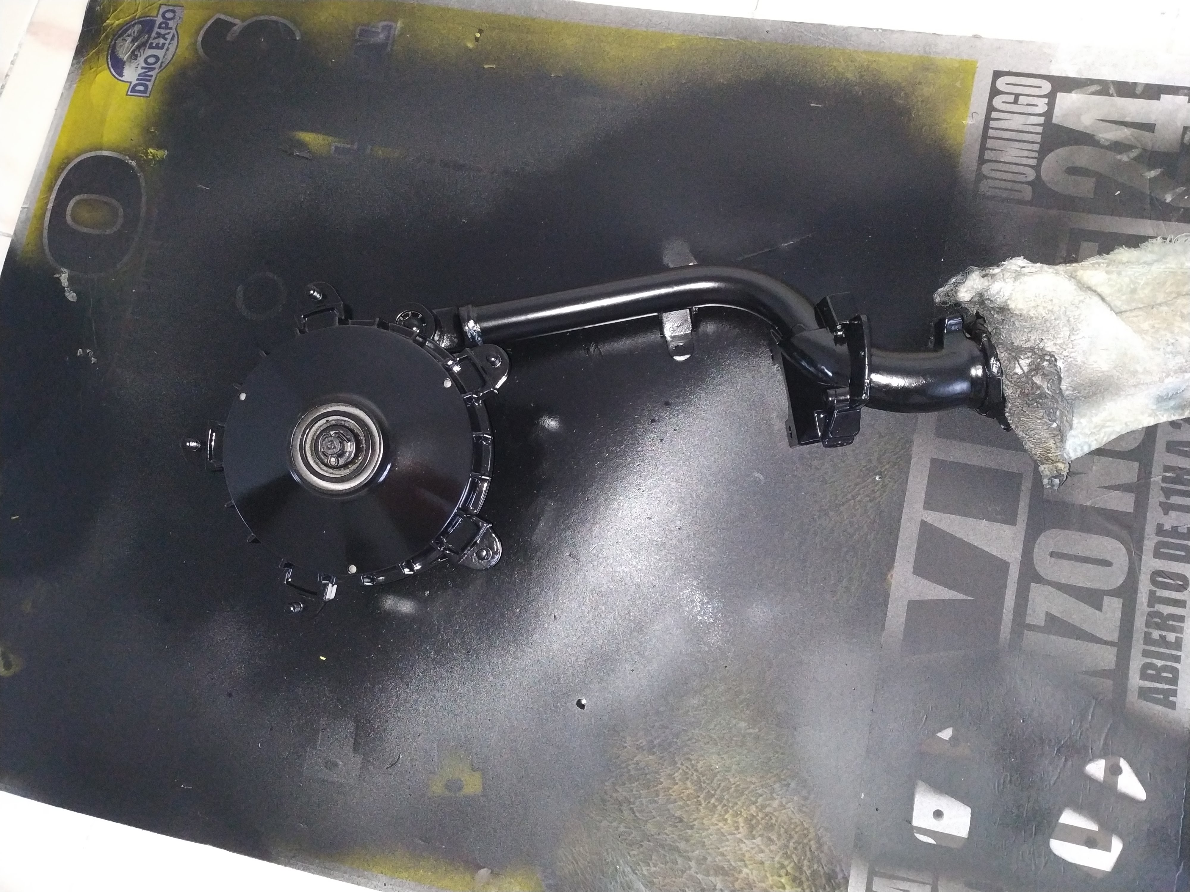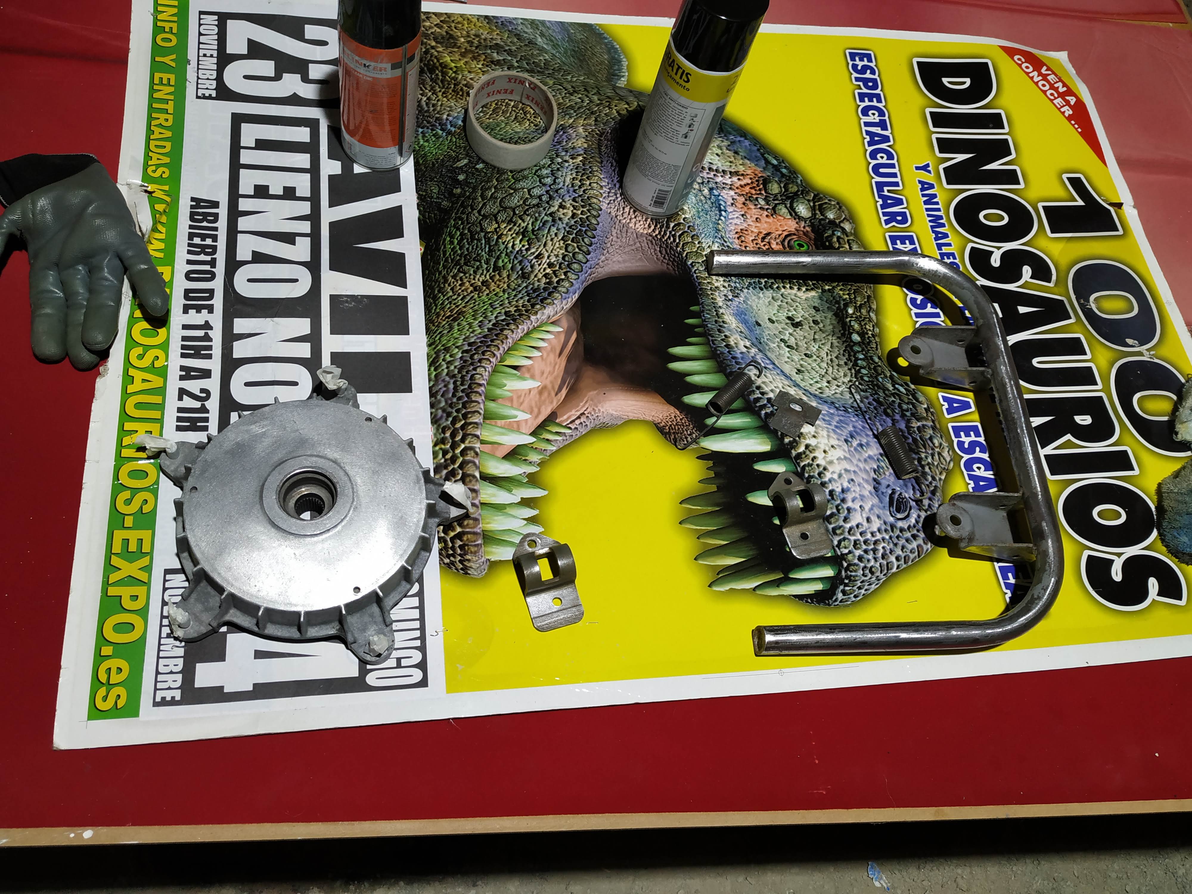 Algunas piezas no opusieron, por suerte, tanta resistencia. La tapa del plato magnético, aunque oxidada y un poco abollada, rápido quedó lijada y con buen resultado. El caballete y las piezas que lo sujetan por debajo del suelo, se metieron en un producto químico para que se desprendiese más fácilmente el óxido. Tras esto, limpieza profunda con cepillo de alambre y lijado antes de pintar. La horquilla, por tener más componentes, supuso algo más de trabajo. Algunos componentes de esta, como el soporte del amortiguador, tenían una buena capa de óxido que precisó de un buen trabajo de limpieza. Todas estas piezas, se pintaron con una pintura especial anticorrosiva de zinc, con un acabado que, a mi parecer, le da un toque en negro satinado.