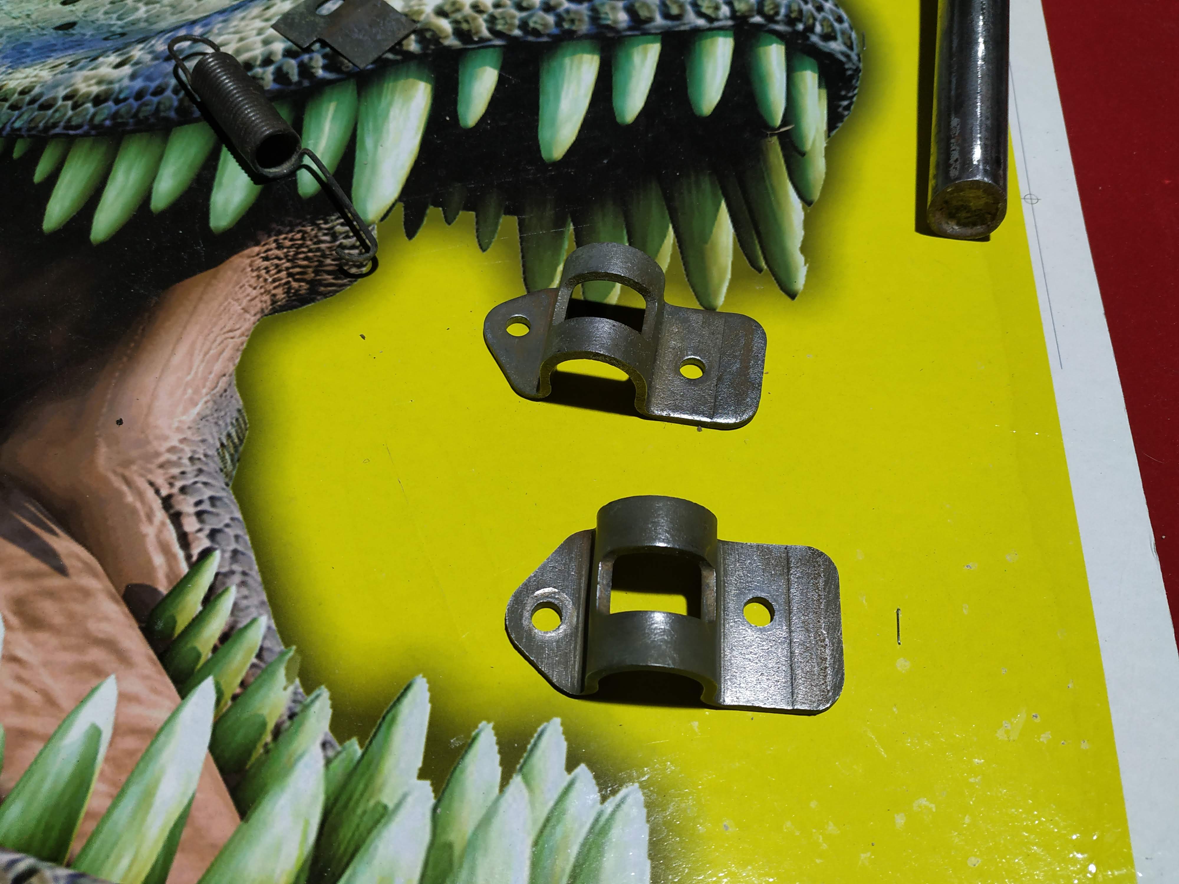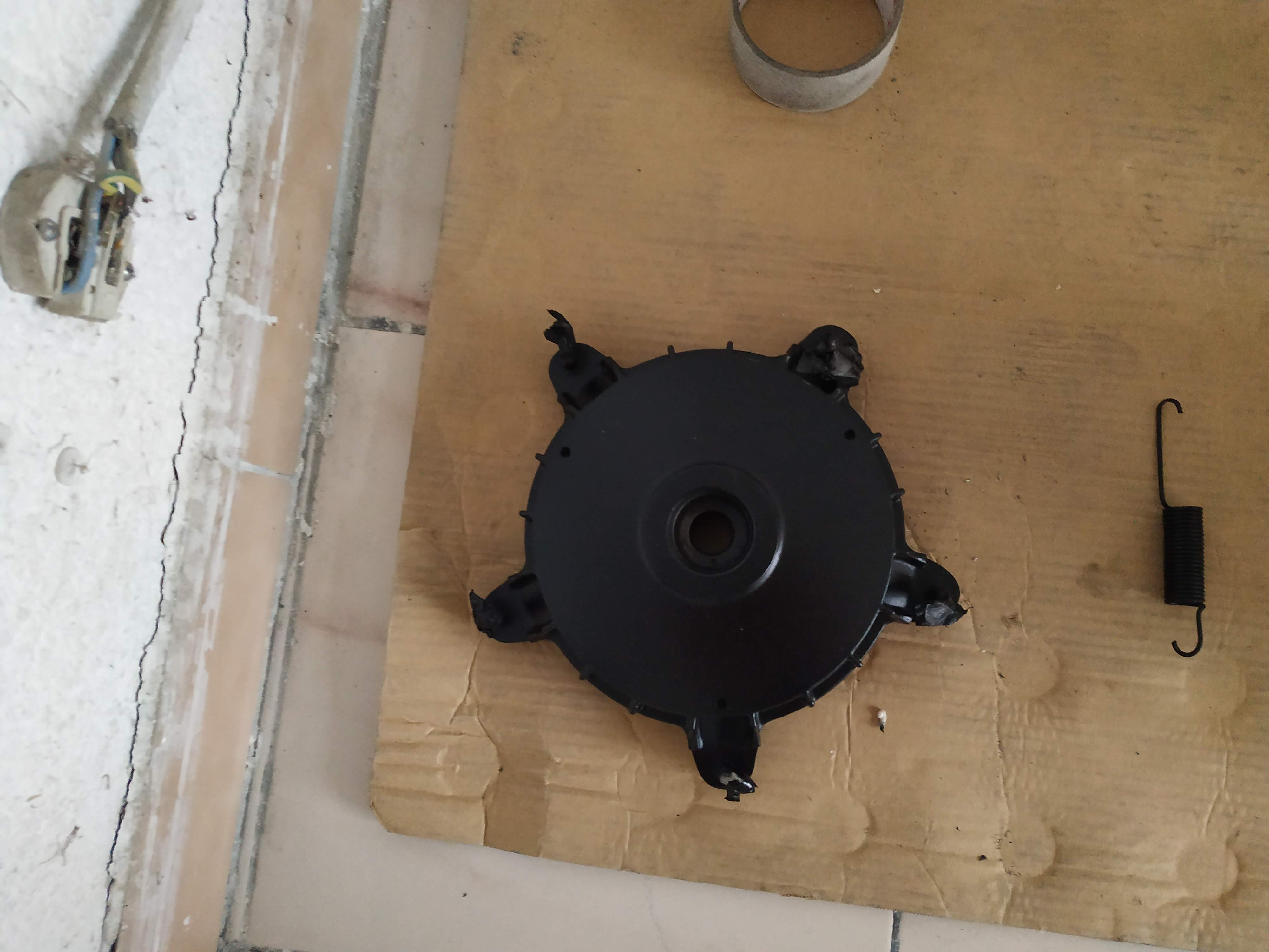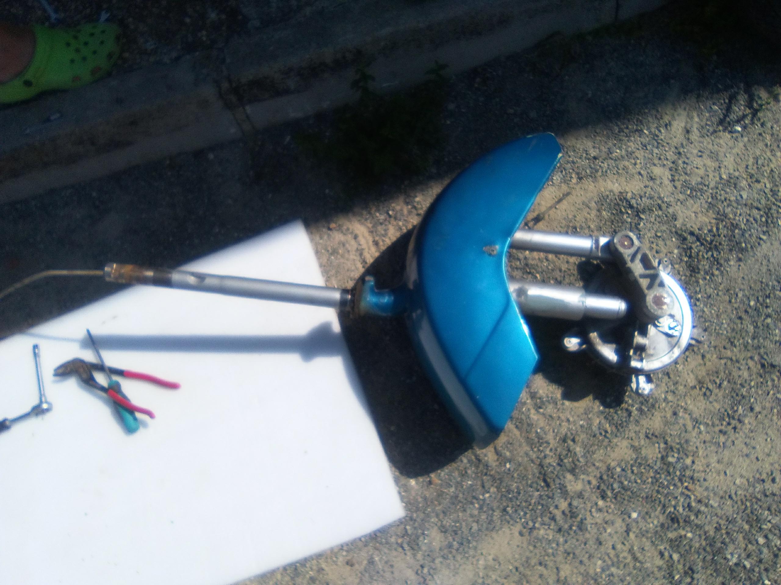 Algunas piezas no opusieron, por suerte, tanta resistencia. La tapa del plato magnético, aunque oxidada y un poco abollada, rápido quedó lijada y con buen resultado. El caballete y las piezas que lo sujetan por debajo del suelo, se metieron en un producto químico para que se desprendiese más fácilmente el óxido. Tras esto, limpieza profunda con cepillo de alambre y lijado antes de pintar. La horquilla, por tener más componentes, supuso algo más de trabajo. Algunos componentes de esta, como el soporte del amortiguador, tenían una buena capa de óxido que precisó de un buen trabajo de limpieza. Todas estas piezas, se pintaron con una pintura especial anticorrosiva de zinc, con un acabado que, a mi parecer, le da un toque en negro satinado.