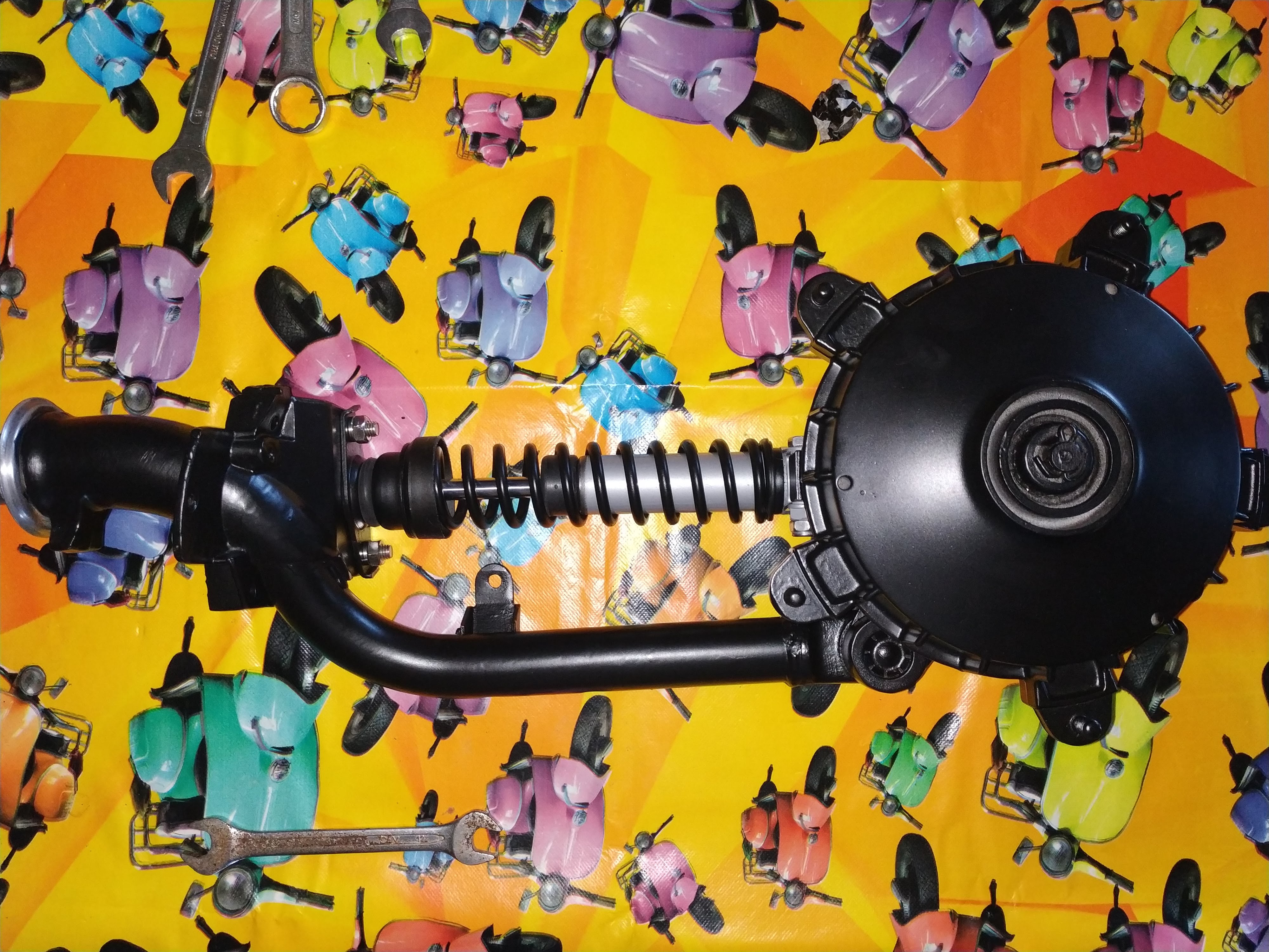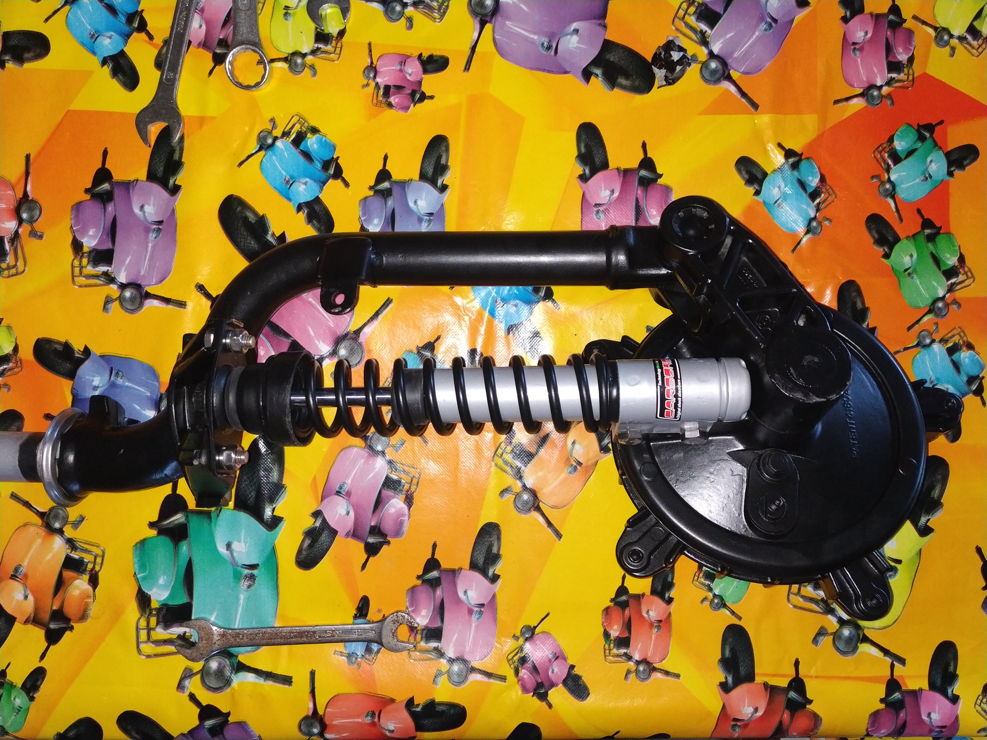 Tras esto, tocaba empezar a montar. Después de montar el amortiguador trasero y meter el motor en su sitio, pensando un poco, lo que más facilitaba toda la tarea era montar primero el caballete y toda su estructura, porque eso permitía levantar la moto y montar el resto de piezas con más facilidad. Las vespas, al llevar todo el peso en la parte trasera, si montaba la rueda trasera junto con el caballete, la moto ya se mantiene aunque sea sin montar toda la parte de la horquilla delantera y manillar.