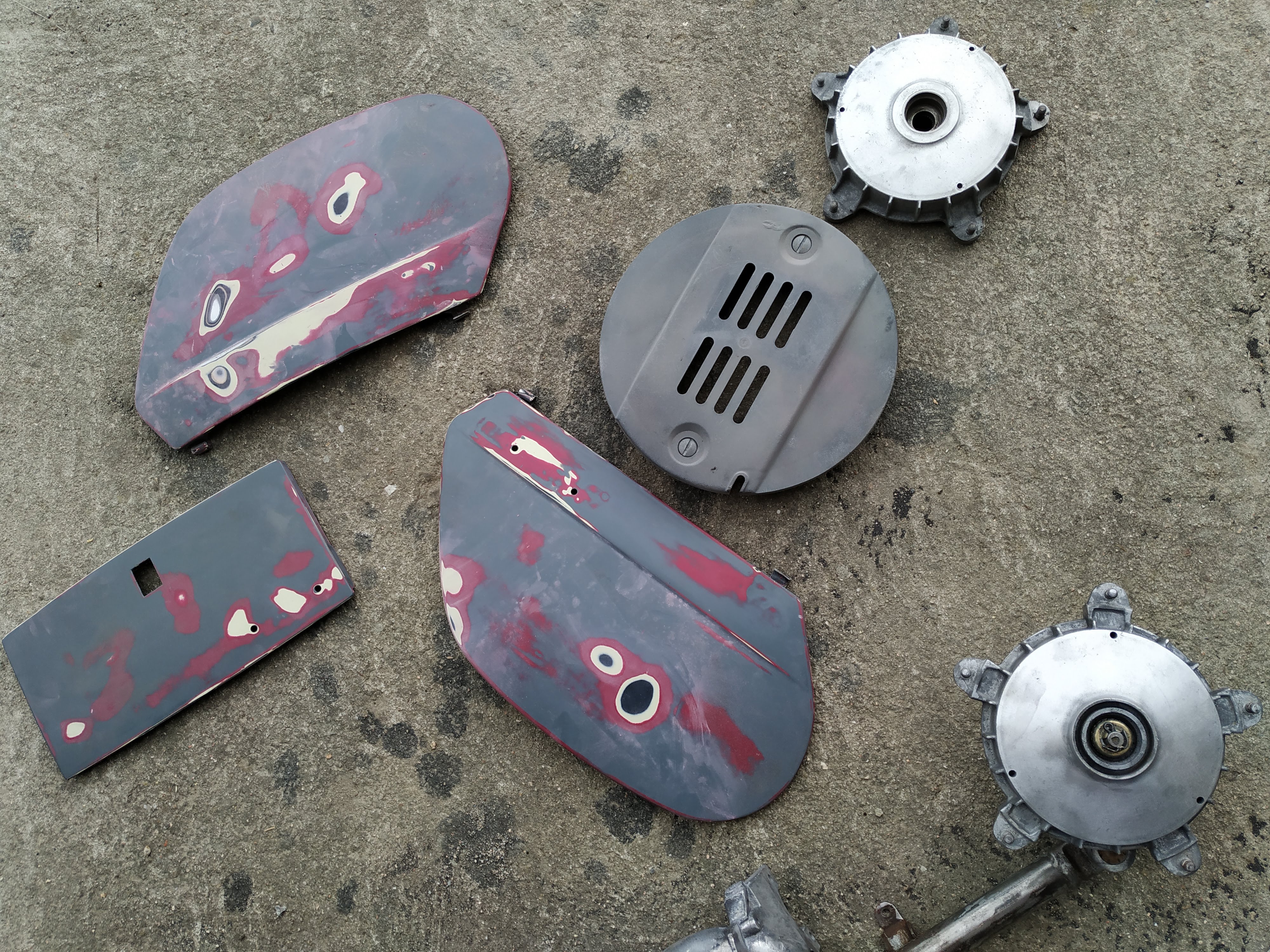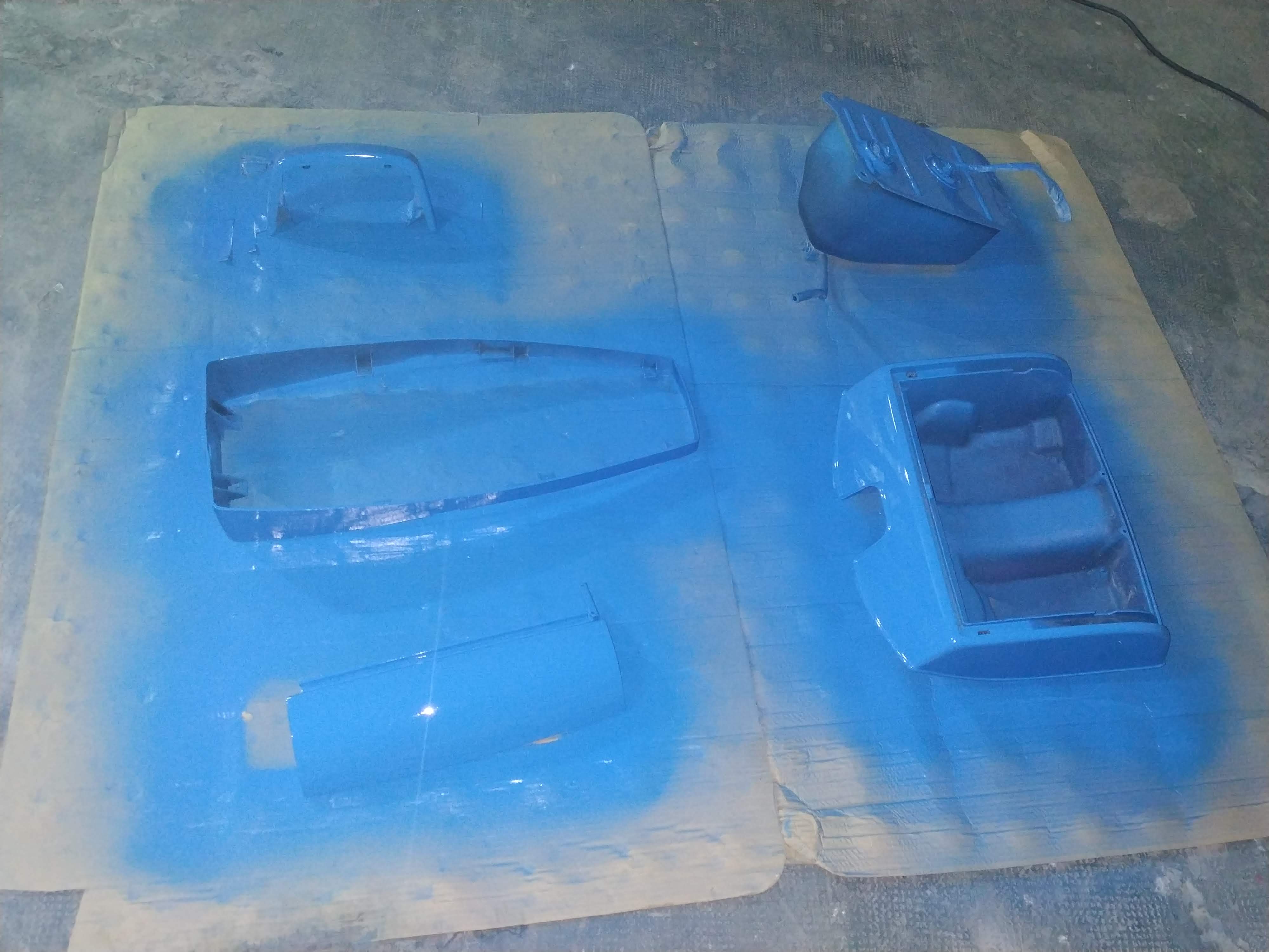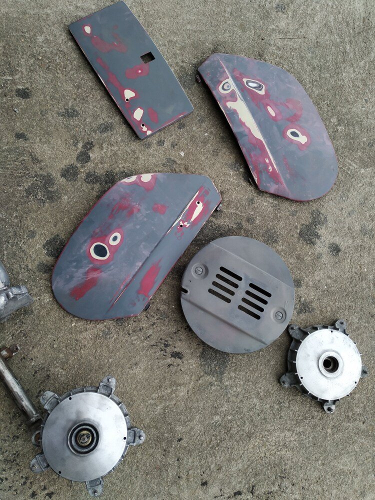 Por otro lado, las tapas laterales, cabezón del manillar, cofre… se lijaron con lijadora orbital y la última pasada a mano, antes de imprimar. Aquí fue donde descubrí que en algún momento la moto había sido rosa. Los intermitentes, tenían la pintura plateada original muy castigada, por lo que también se lijaron y pintaron con una pintura similar.