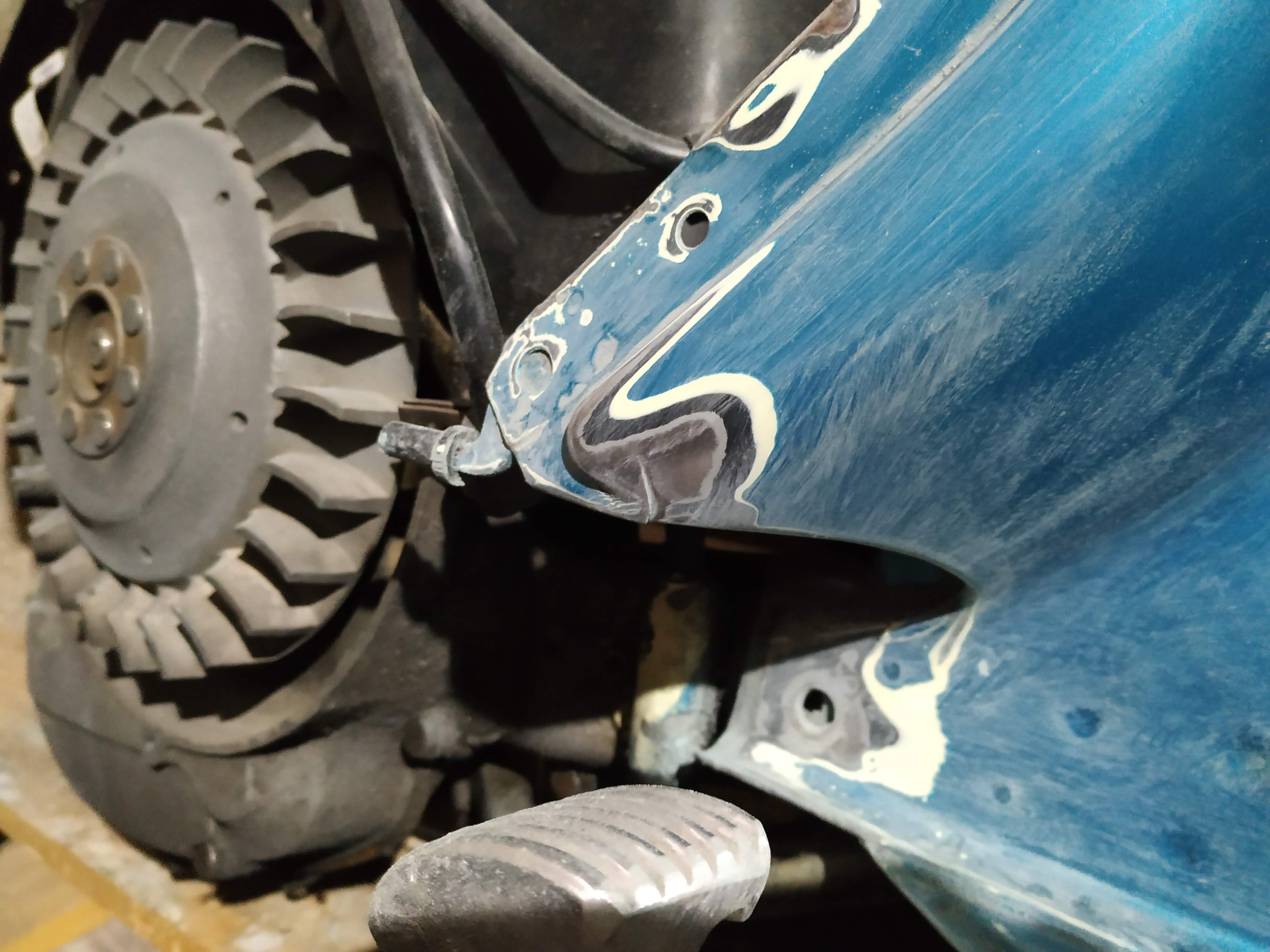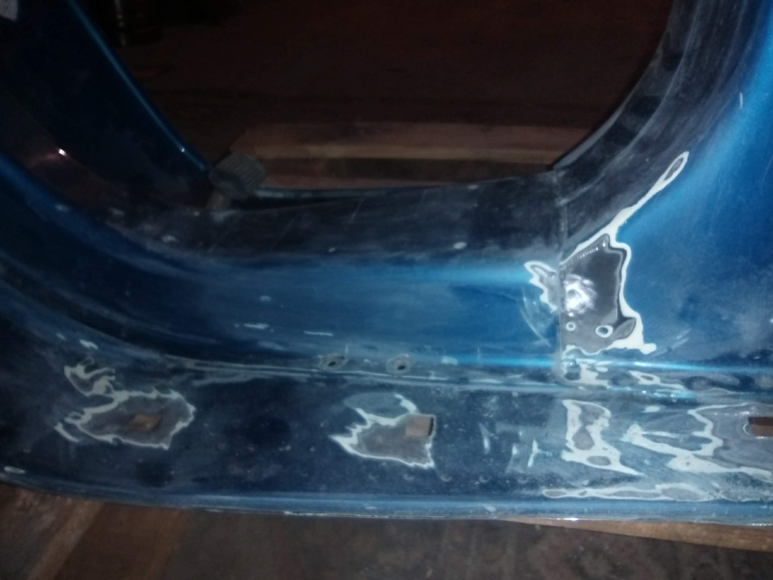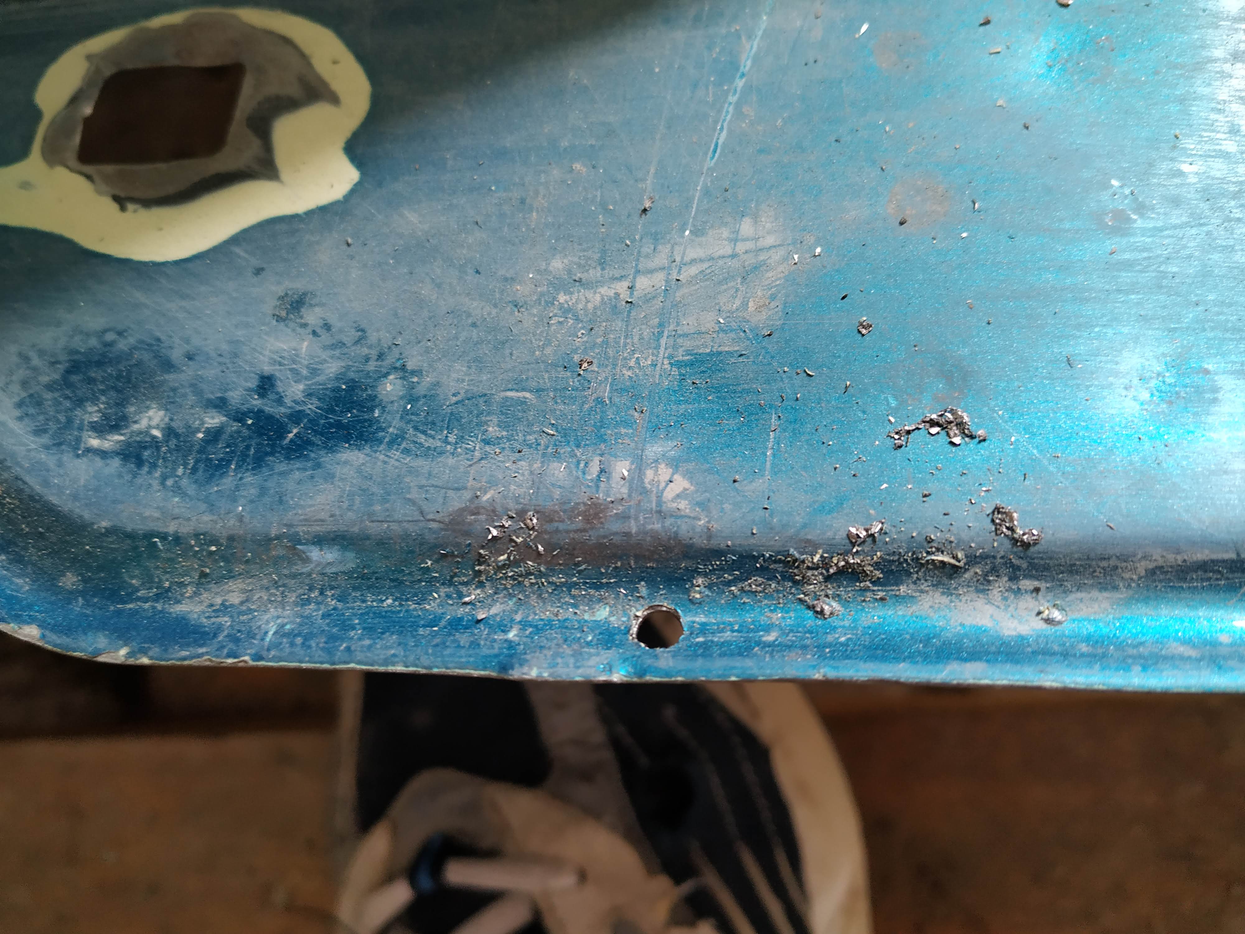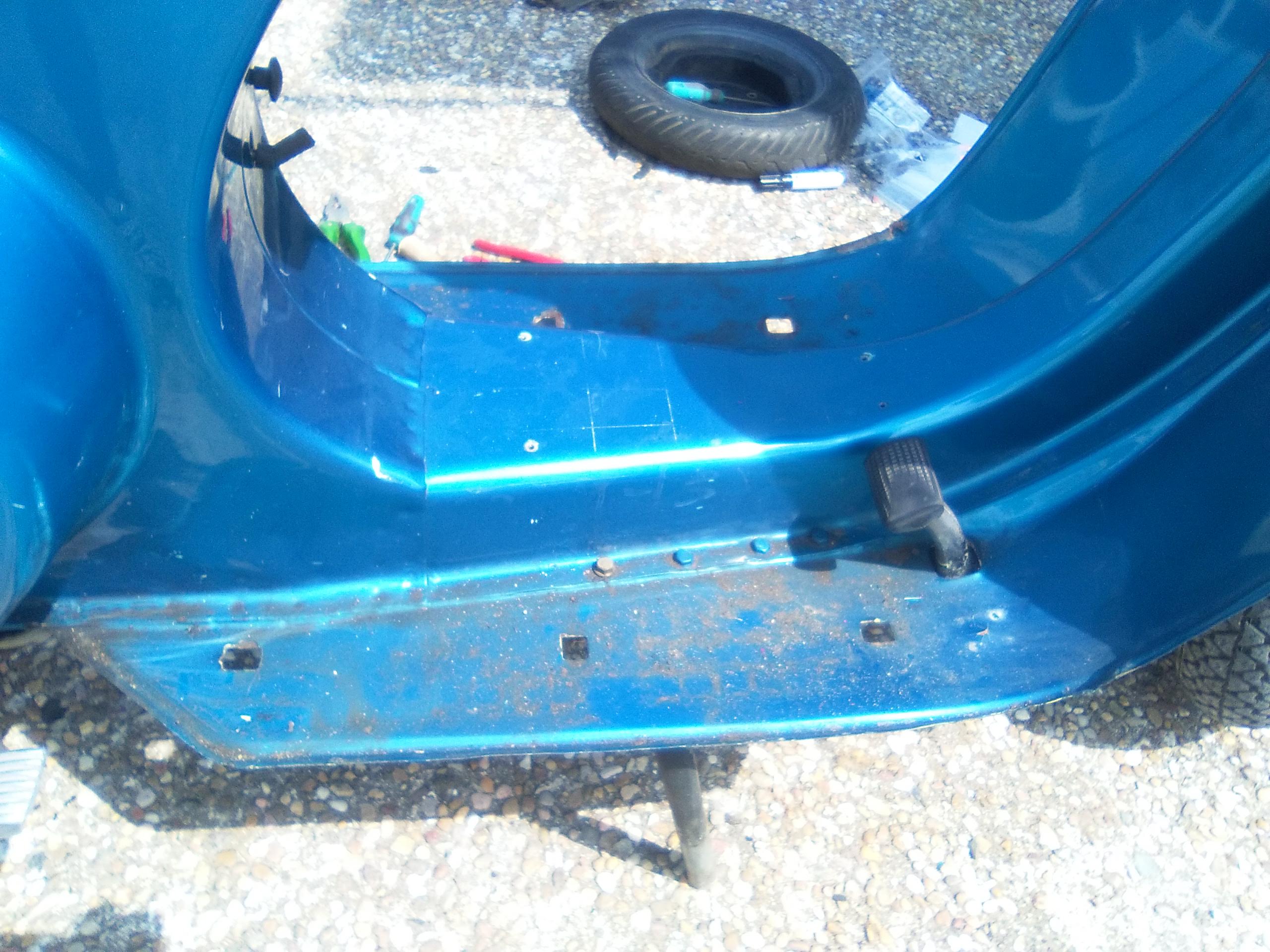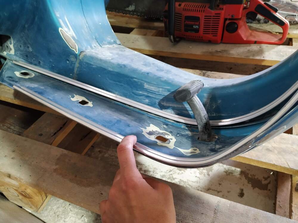 Como habéis visto en las fotos iniciales, la moto de origen llevaba en el suelo unos plásticos protectores que cubrían toda la parte del suelo. Al quitar esos plásticos, noté como la humedad y suciedad acumuladas debajo habían dañado la pintura. Tampoco me convencía el aspecto que daban a la moto por lo que decidí eliminarlos y poner guías cromadas como montan otros modelos de vespa. Para esto, dar forma a las guías, hacer agujeros en la chapa y remachar para sujetar la guía.